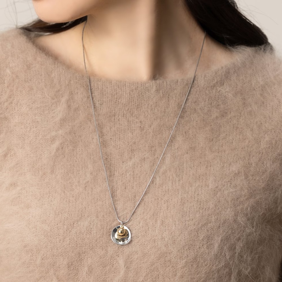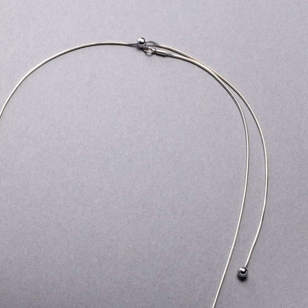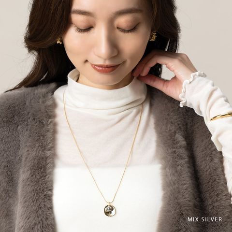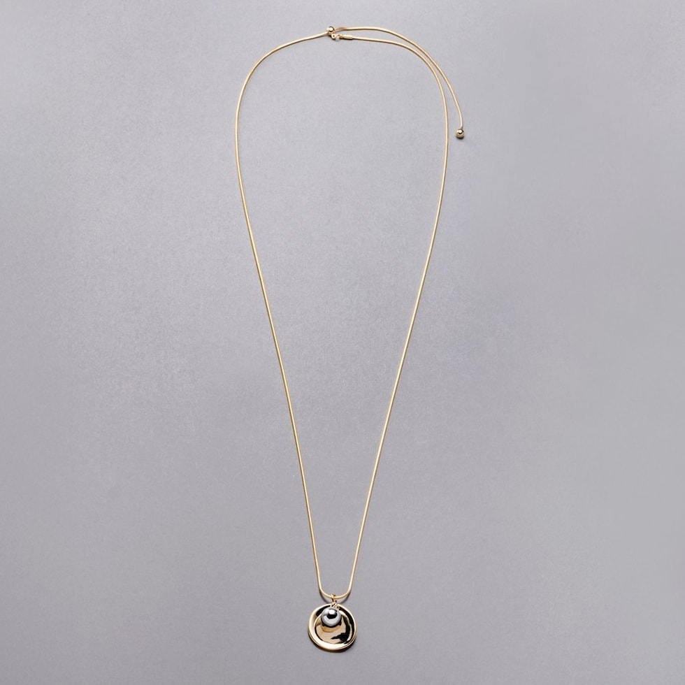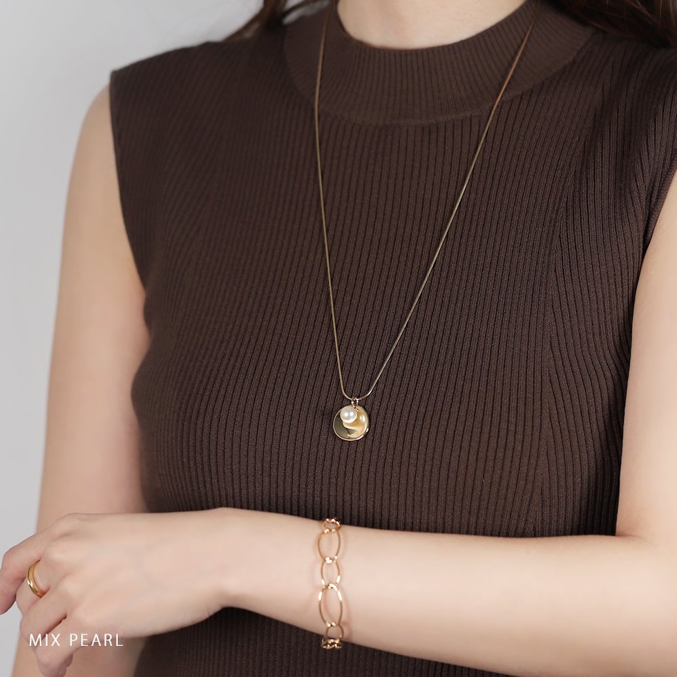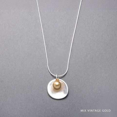 ニュアンスプレートとメタルスフィア/パールをMIXしたロングネックレス。艶とヴィンテージの質感から選べる2type展開です。スネークチェーンでスッキリと仕上げたアイテムはコーデが物足りない時のワンポイントに最適◎