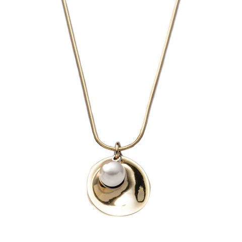 ニュアンスプレートとメタルスフィア/パールをMIXしたロングネックレス。艶とヴィンテージの質感から選べる2type展開です。スネークチェーンでスッキリと仕上げたアイテムはコーデが物足りない時のワンポイントに最適◎