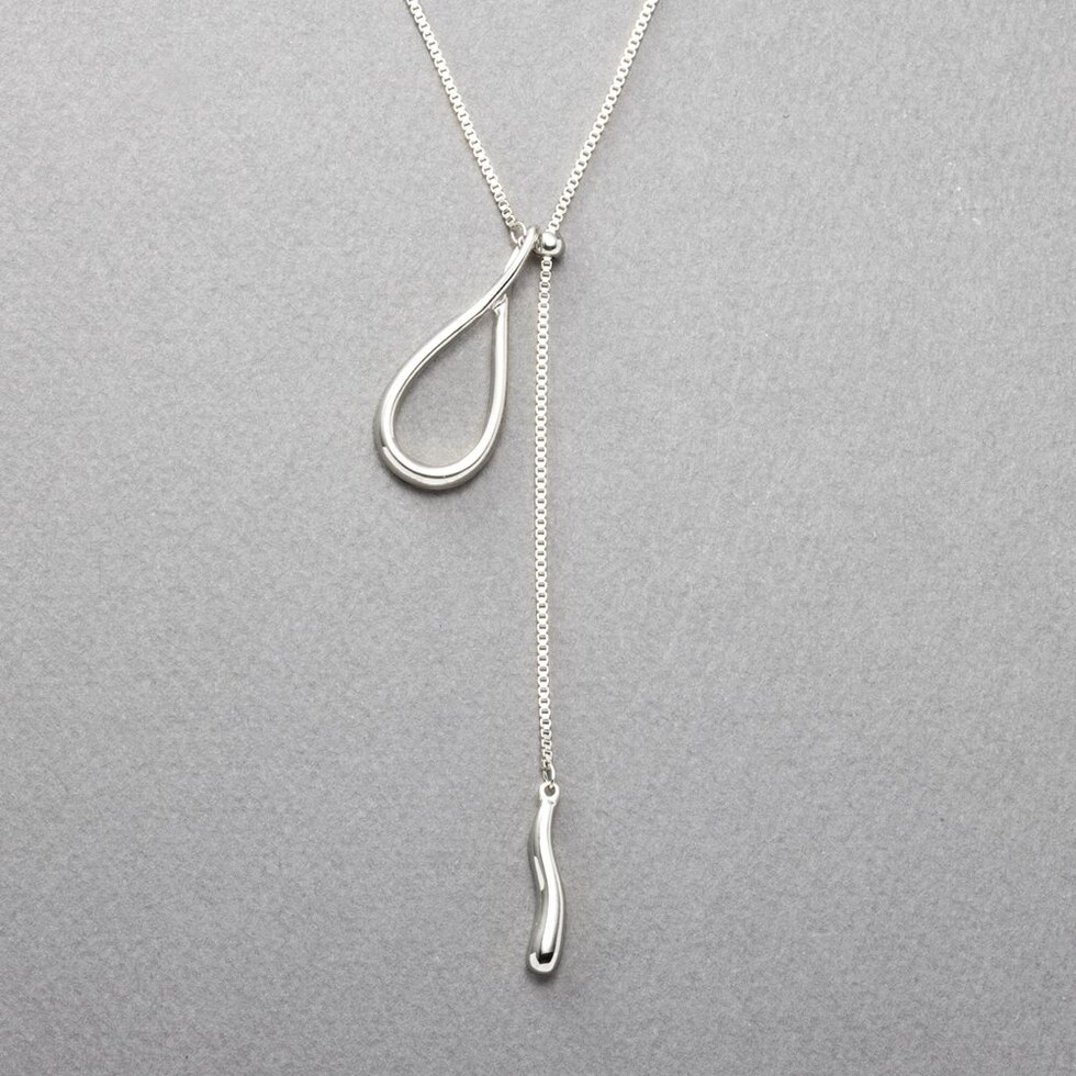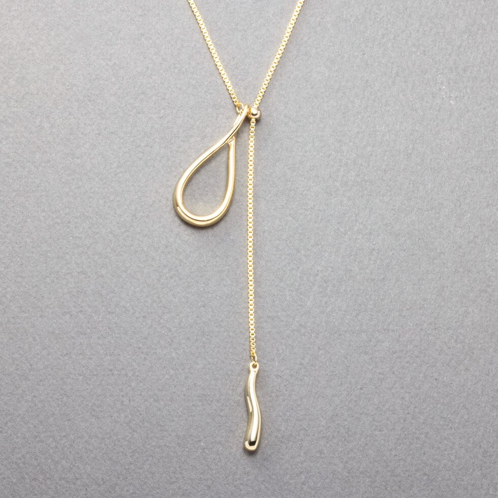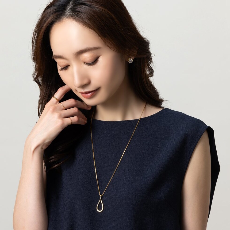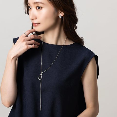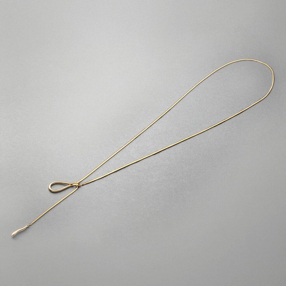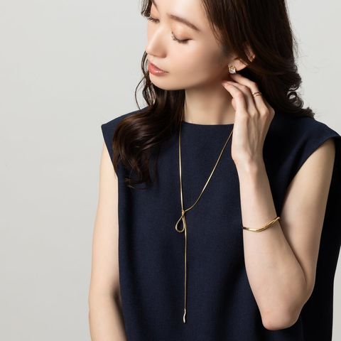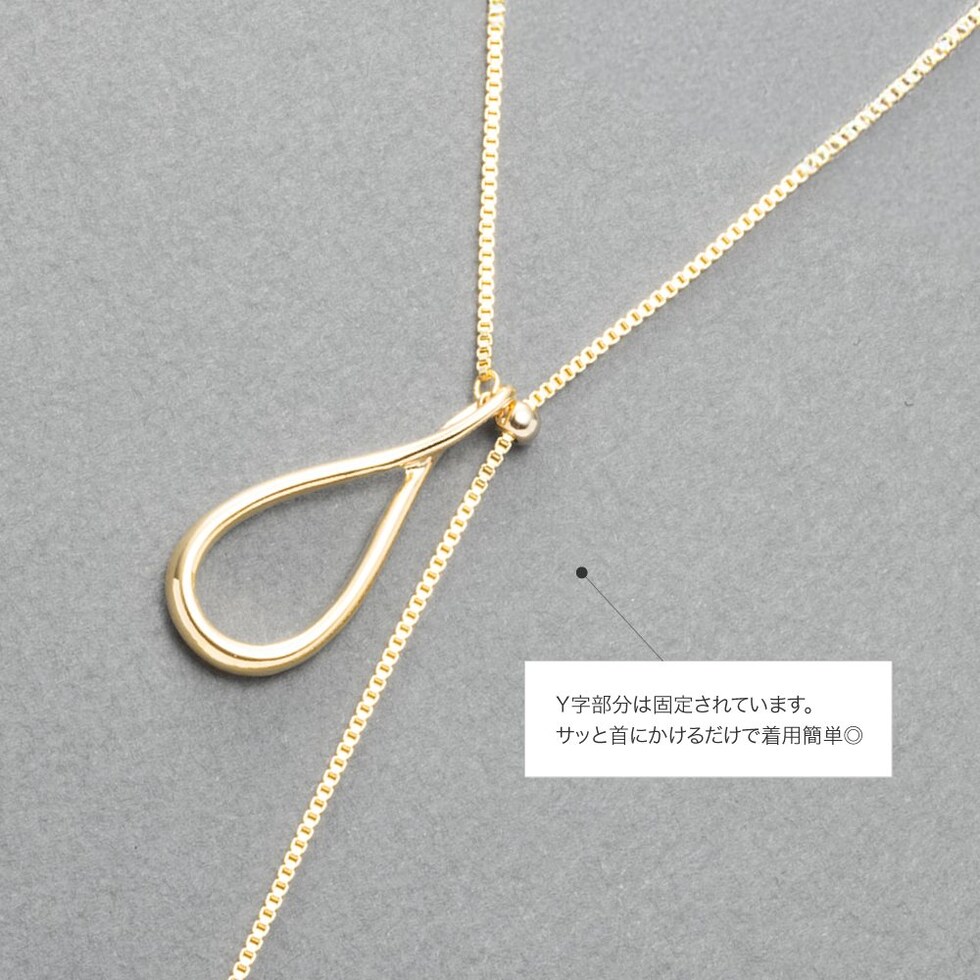 ひねりを加えたドロップフレームの下でメタルバーが揺れるY字ロングネックレス。メタルバーを後ろにしてドロップモチーフだけのシンプルなネックレスとしても使える2WAY仕様◎その日の気分やスタイリングに合わせてお楽しみいただけるオススメのひと品です。