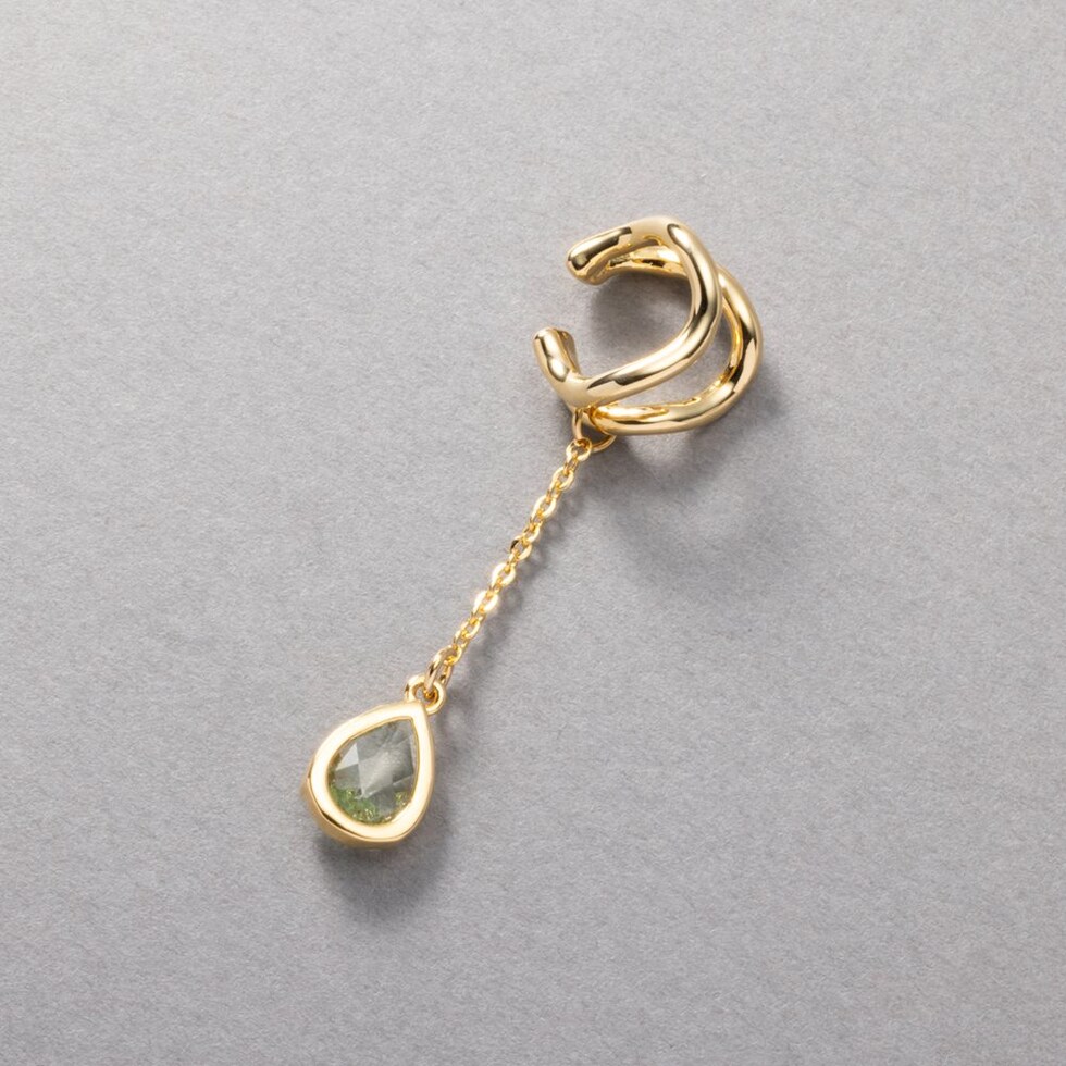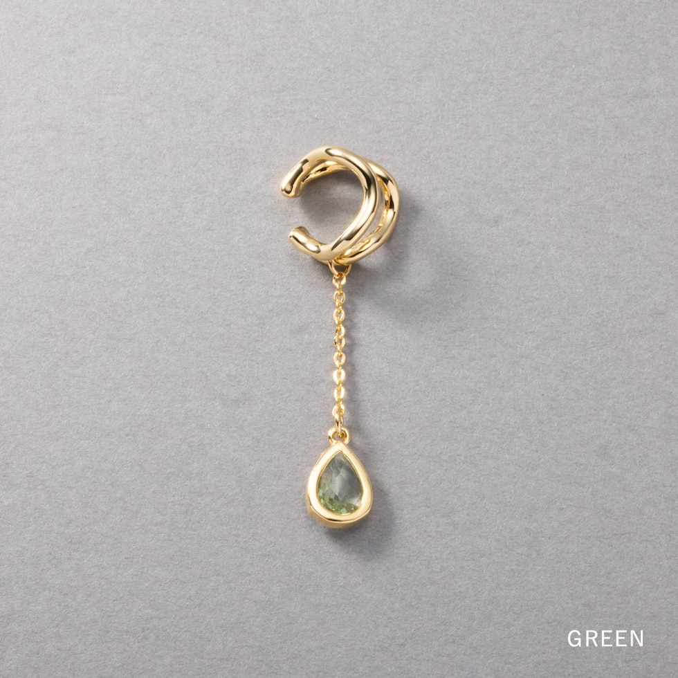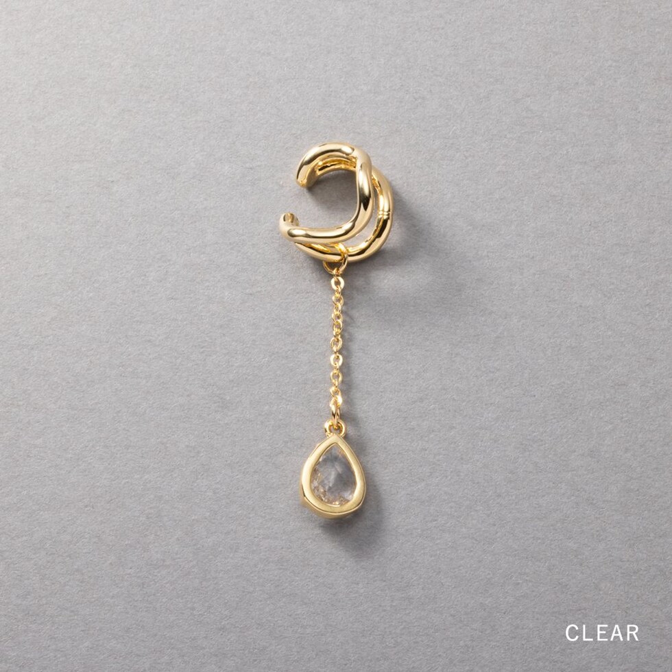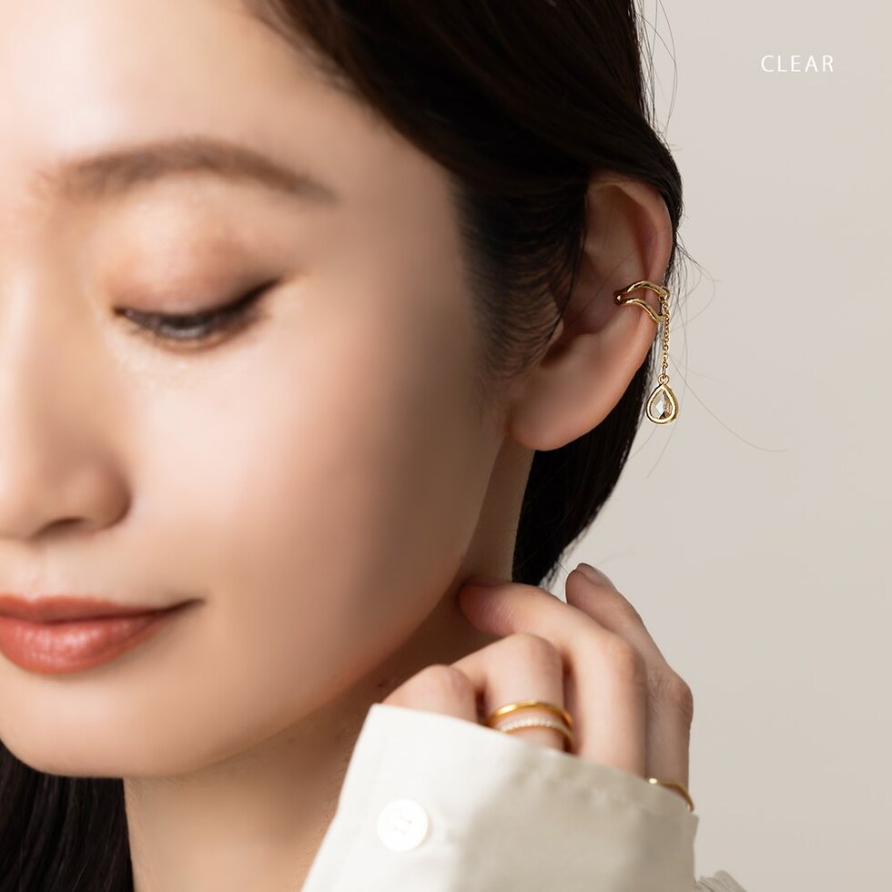 ドロップ型のストーンが揺れる片耳用イヤーカフ。多面カットを施したさりげなく品の良いストーンが耳元にアクセントをプラスしてくれます◎メタルカフ部分も歪ダブルラインでこなれた雰囲気に。低アレルギーのニッケルフリー素材を使用しているので、長時間の着用も安心です。