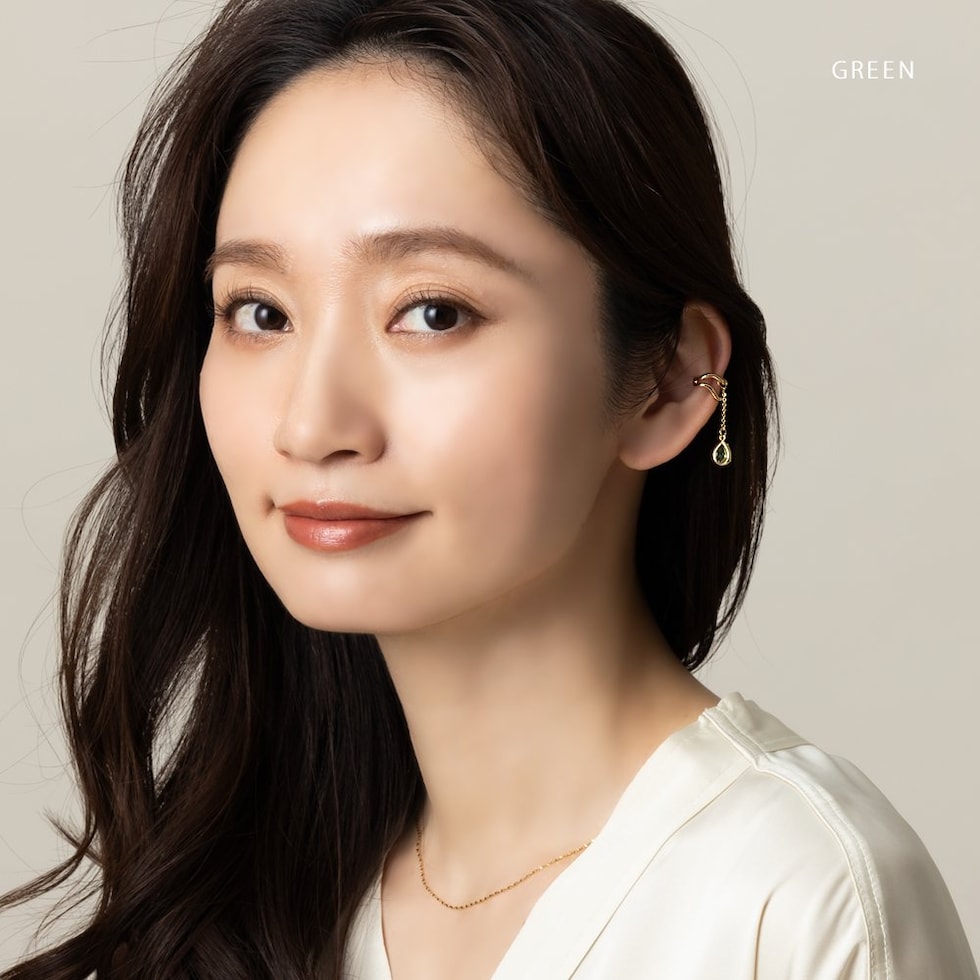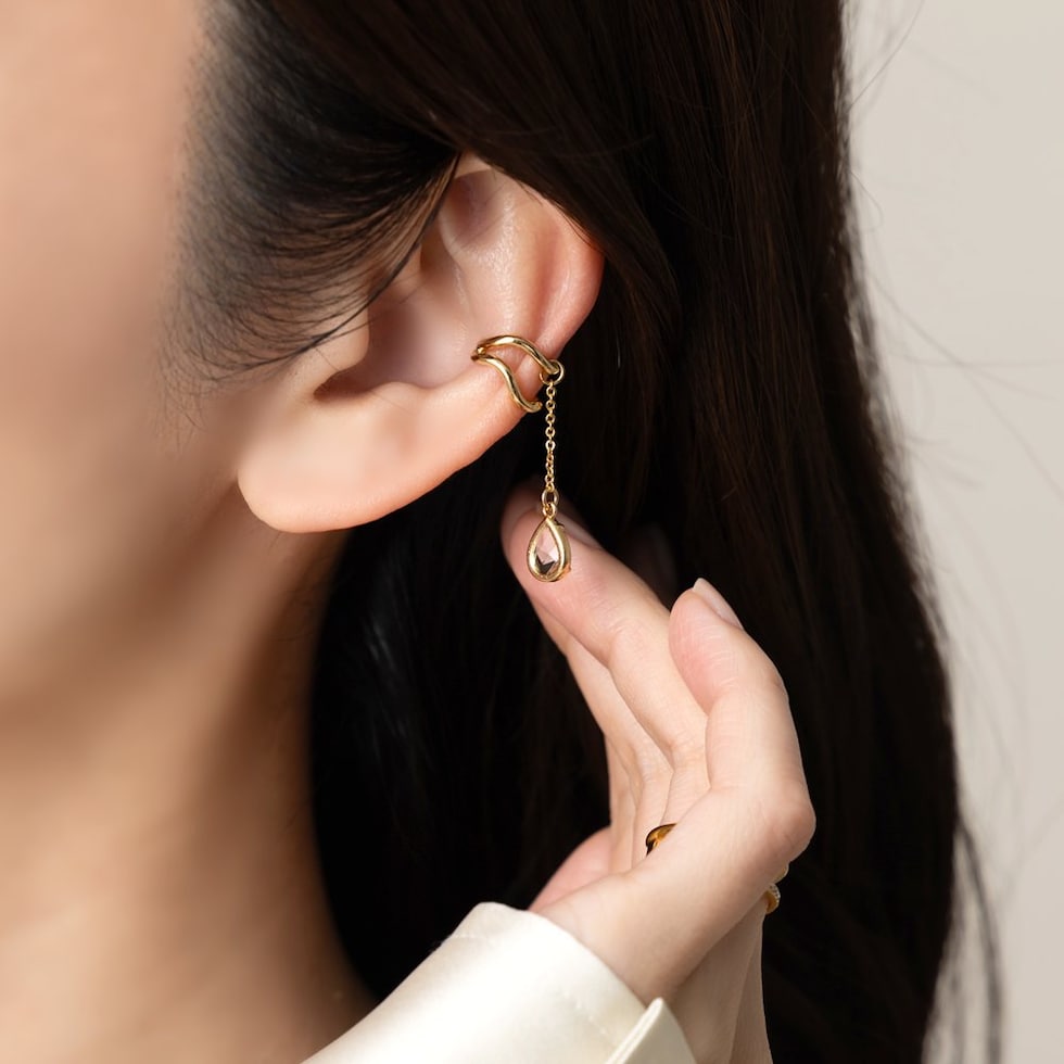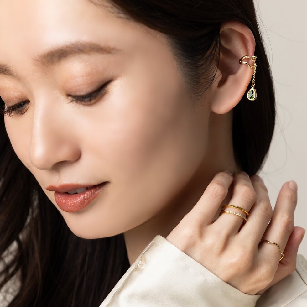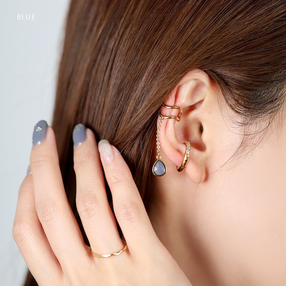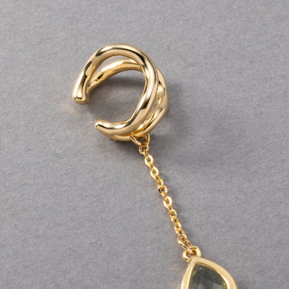 ドロップ型のストーンが揺れる片耳用イヤーカフ。多面カットを施したさりげなく品の良いストーンが耳元にアクセントをプラスしてくれます◎メタルカフ部分も歪ダブルラインでこなれた雰囲気に。低アレルギーのニッケルフリー素材を使用しているので、長時間の着用も安心です。