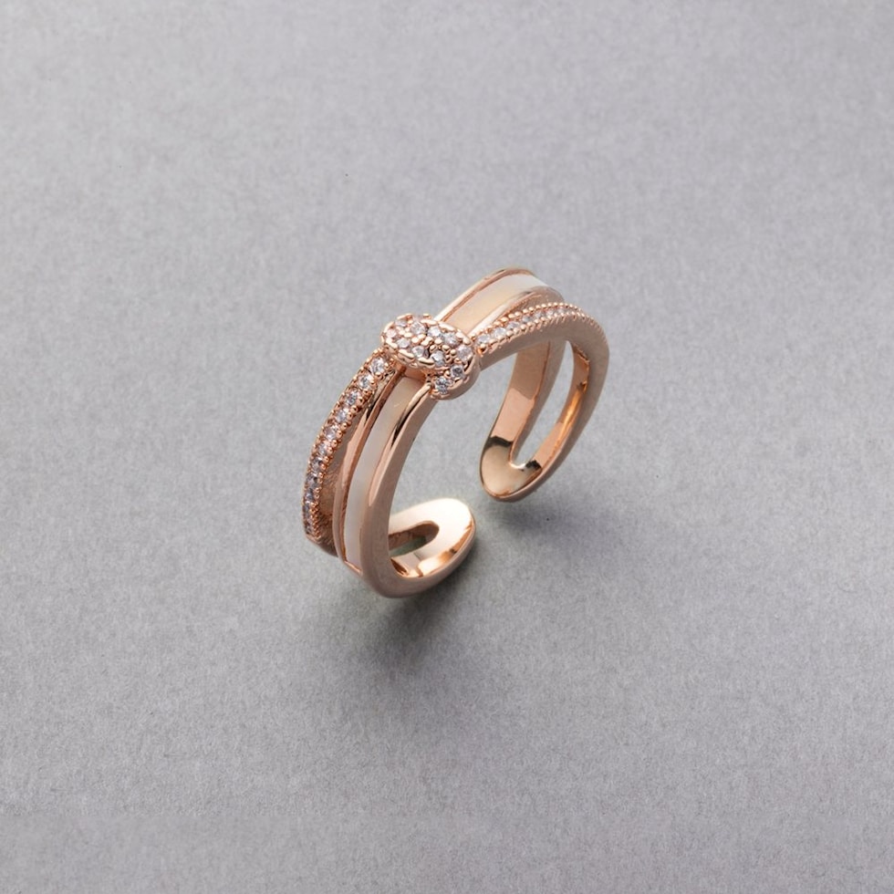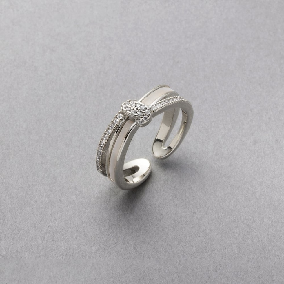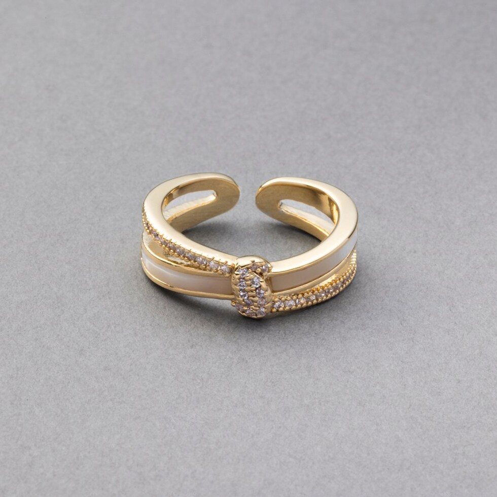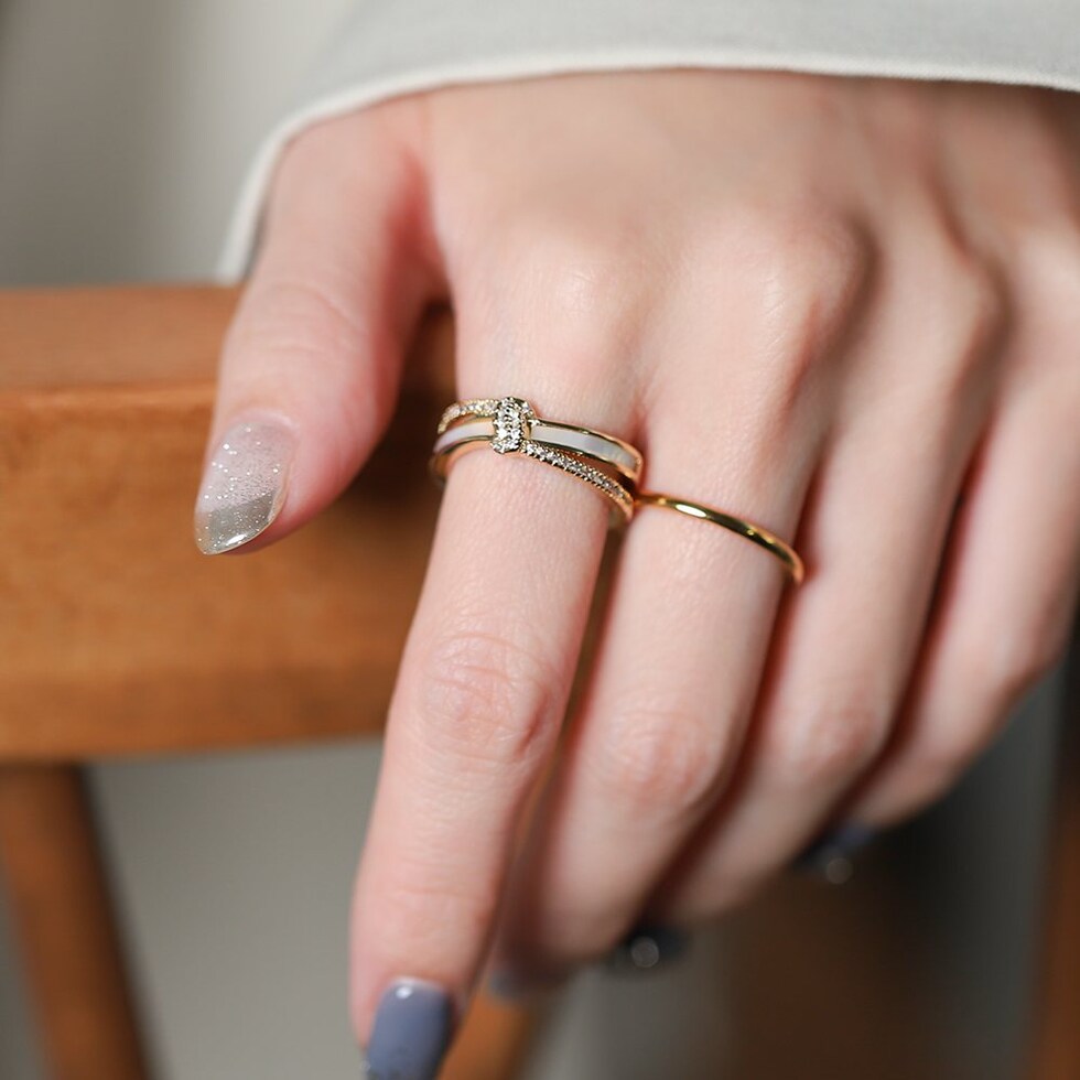 シェルと小粒ビジューが華やぐオープンリング。さりげないノットデザインが大人上品な手元を演出します。繊細な煌めきが程よくコーデのアクセントになるオススメのひと品。