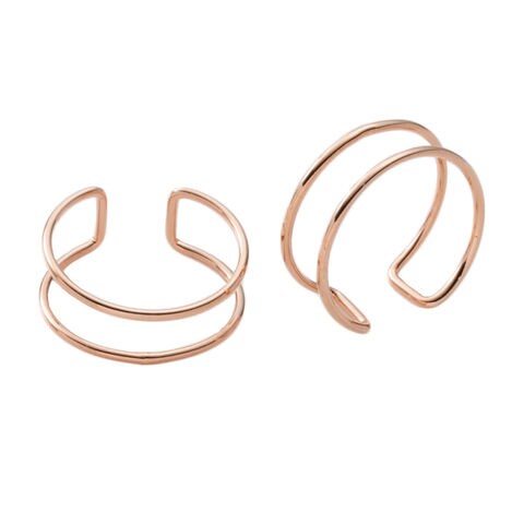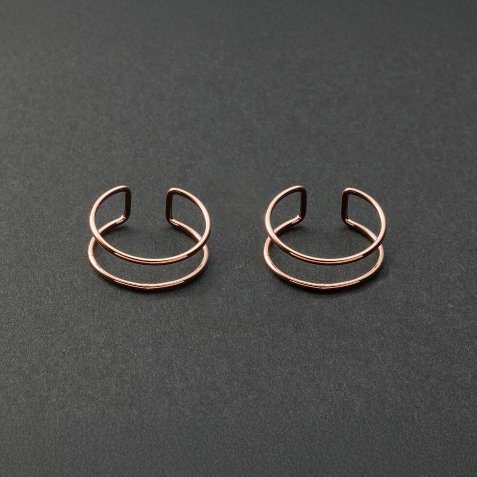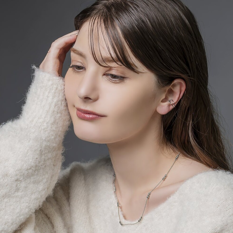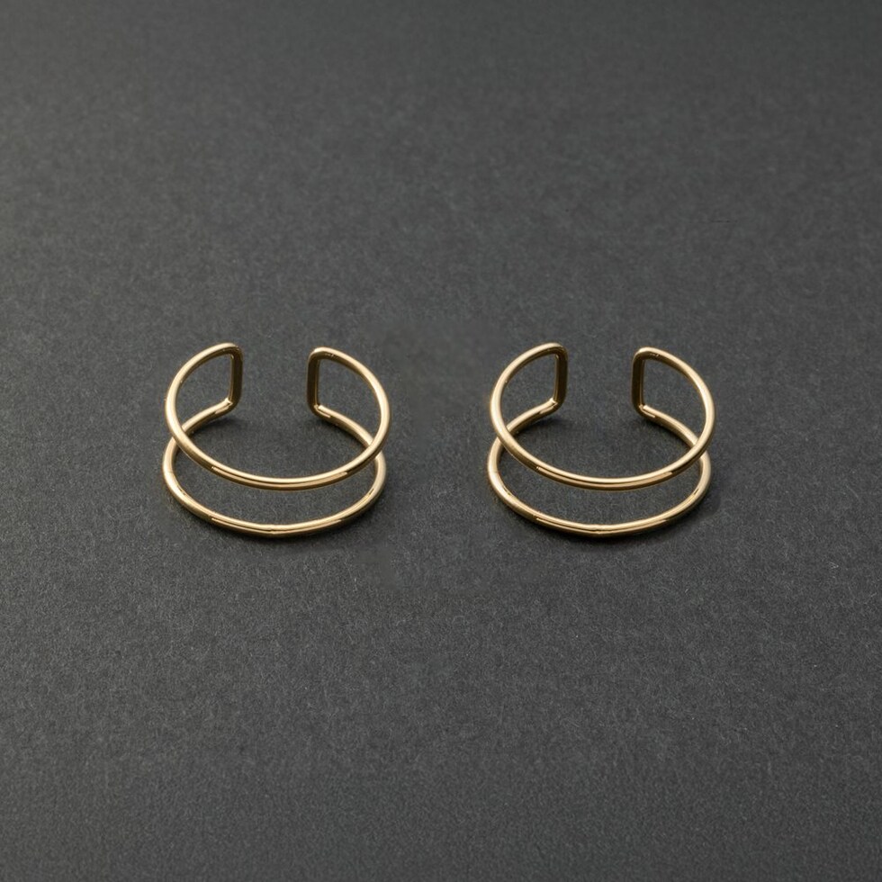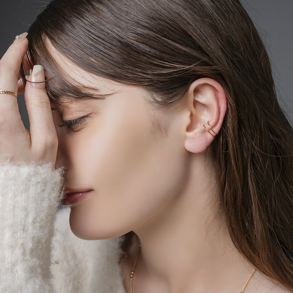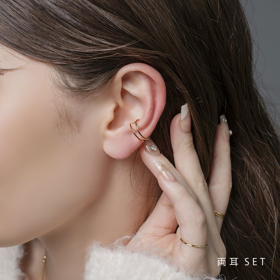 華奢ダブルラインの両耳用イヤーカフ。とっても華奢なワイヤーが2連になったレイヤード風デザインでさりげなくシンプルに耳元を飾ります。シンプルなフォルムで邪魔をしないから、お持ちのピアスやカフと重ね着けしてもgood。