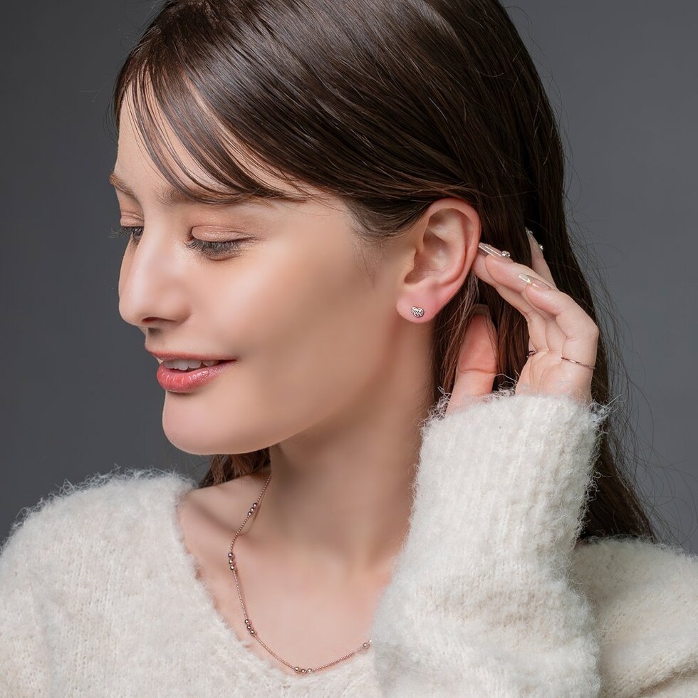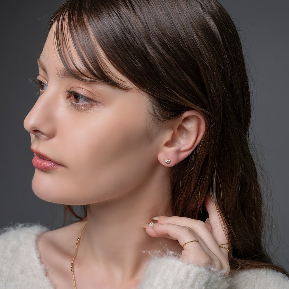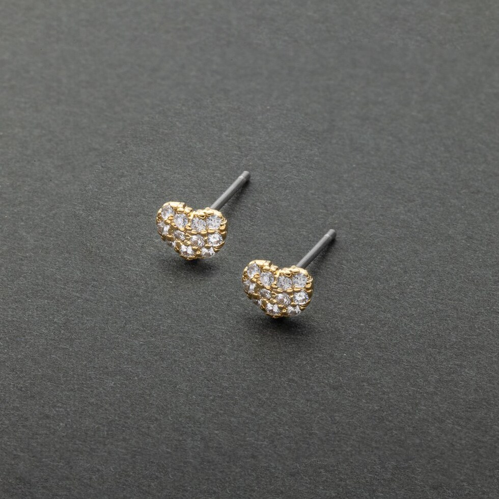 煌めくビジューでハートをかたどったスタッドピアス。小ぶりな存在感でお顔周りをさりげなく華やかな印象に仕上げてくれます。きれいめにもカジュアルにも合わせやすく、デイリーに活躍しそう◎低アレルギーのチタンポスト、その他メタル部分にはニッケルフリー素材を使用しているので、長時間の着用も安心です。