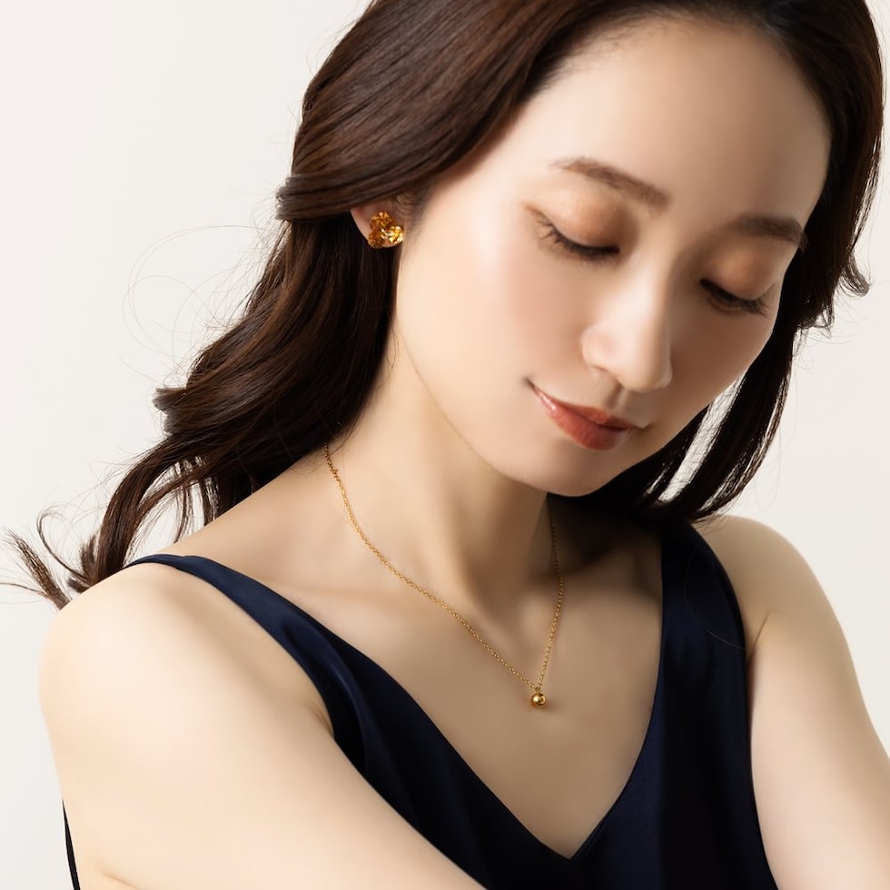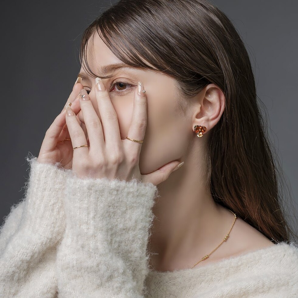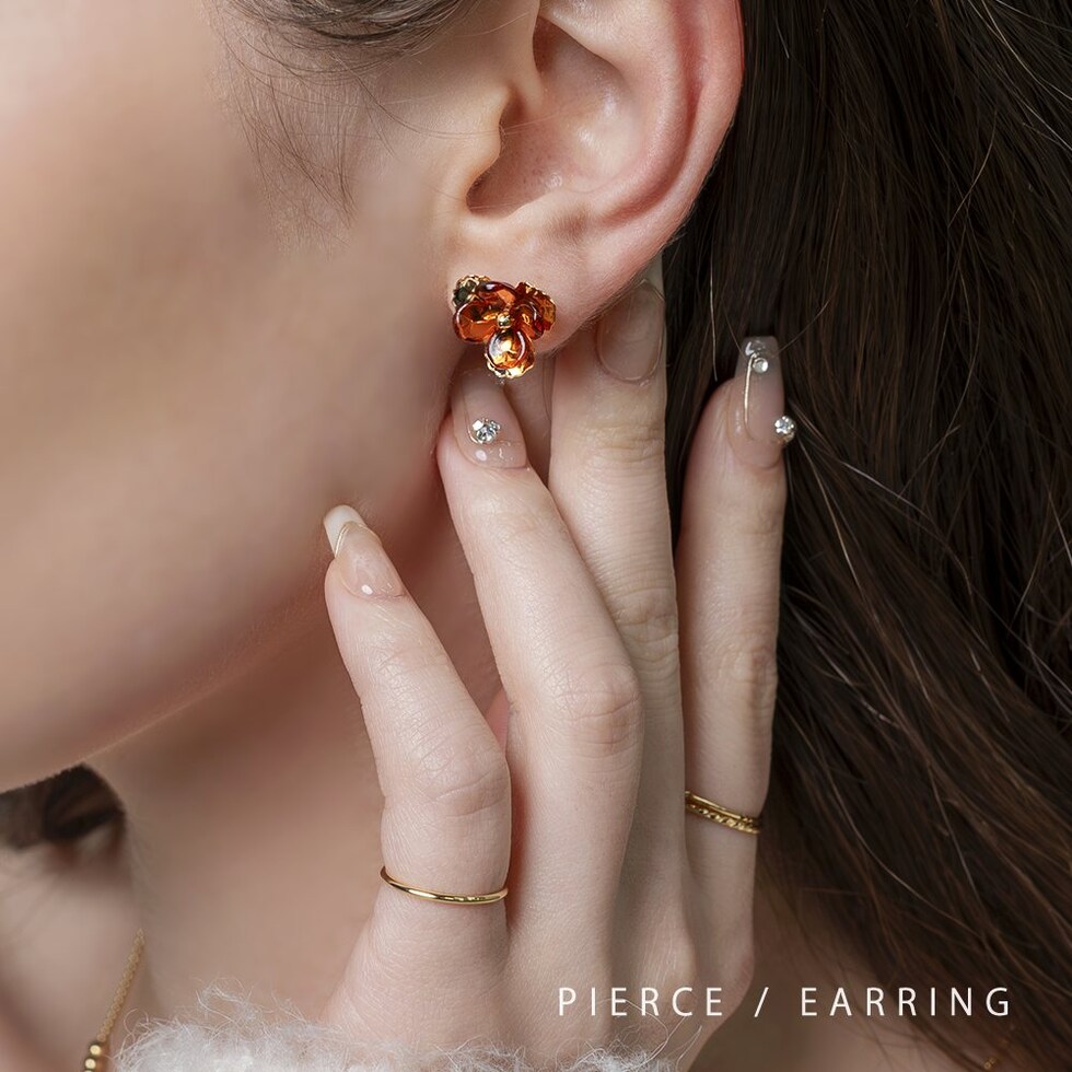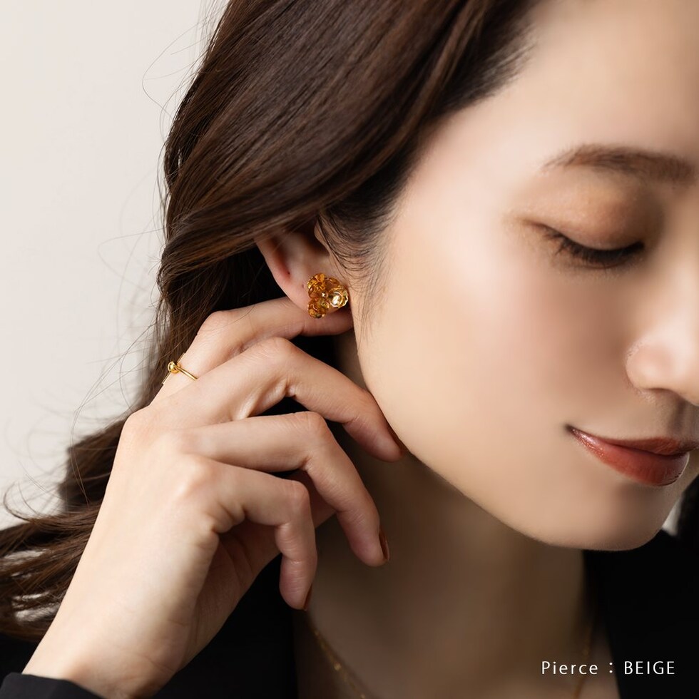 メタルを効かせたしっとりフラワーピアス/イヤリング。ぷっくりとしたカラーフラワーの背後に施したメタルの花びらが透け感を際立たせる洗練デザイン。落着きのあるしっとりとした色合いで大人っぽく差し色使いして。