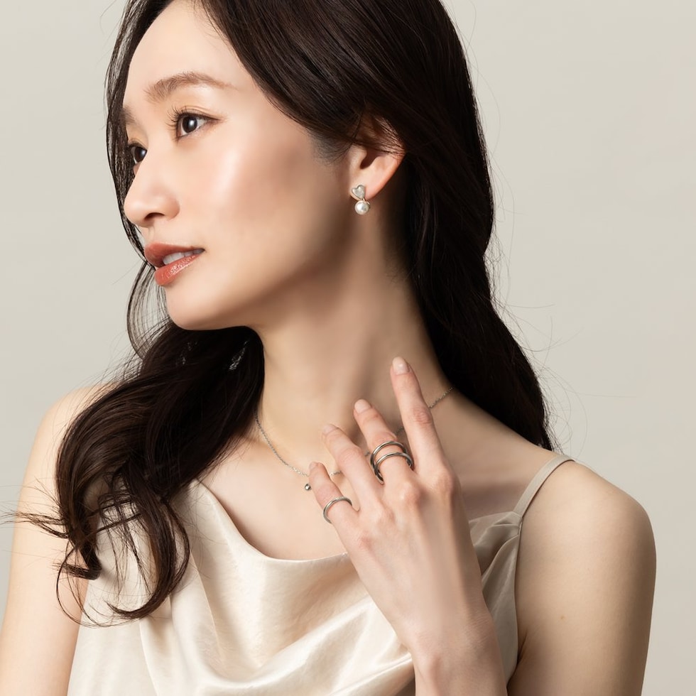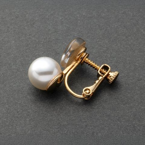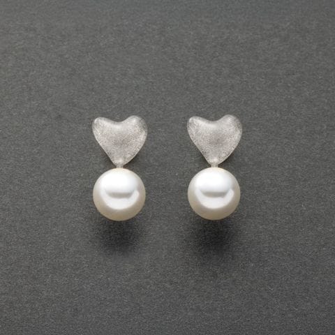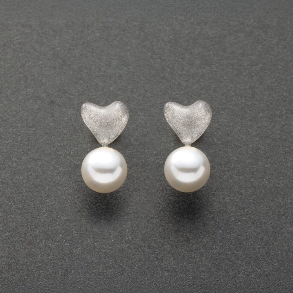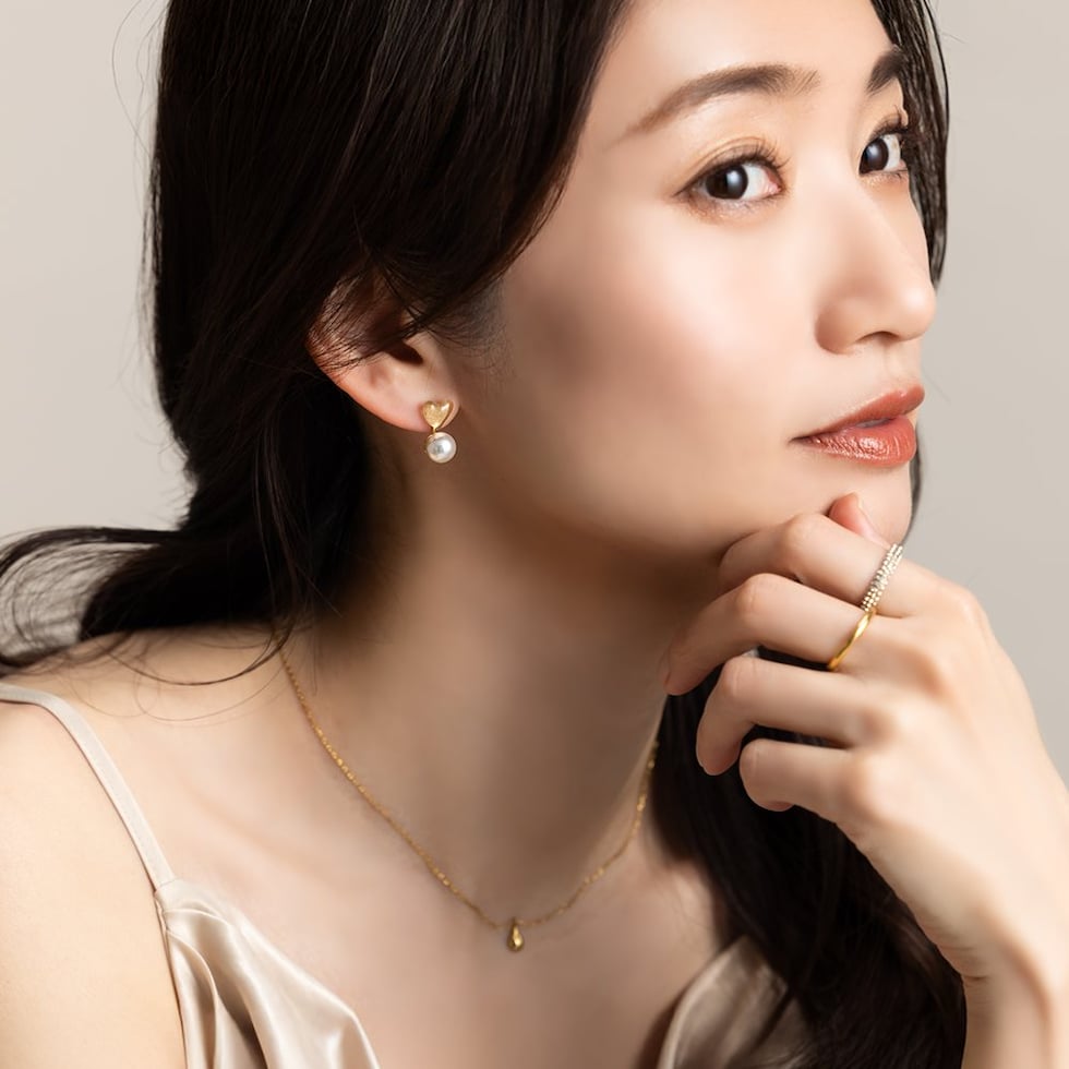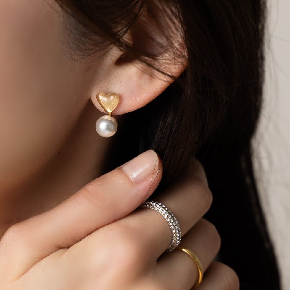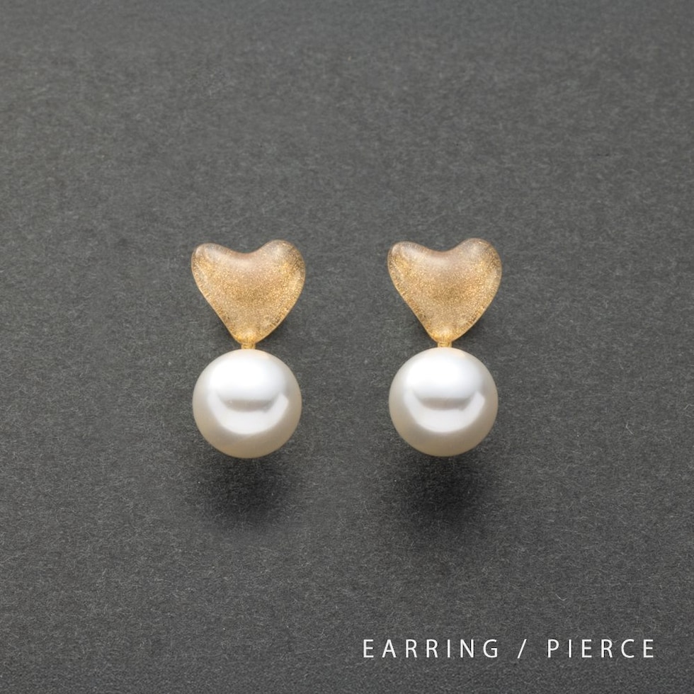 梨地テクスチャのハート型メタルプレートにクリアをコーティングしたイヤリング/ピアス。一粒パールとのコンビが大人っぽく、耳元にさりげない女性らしさをプラス◎