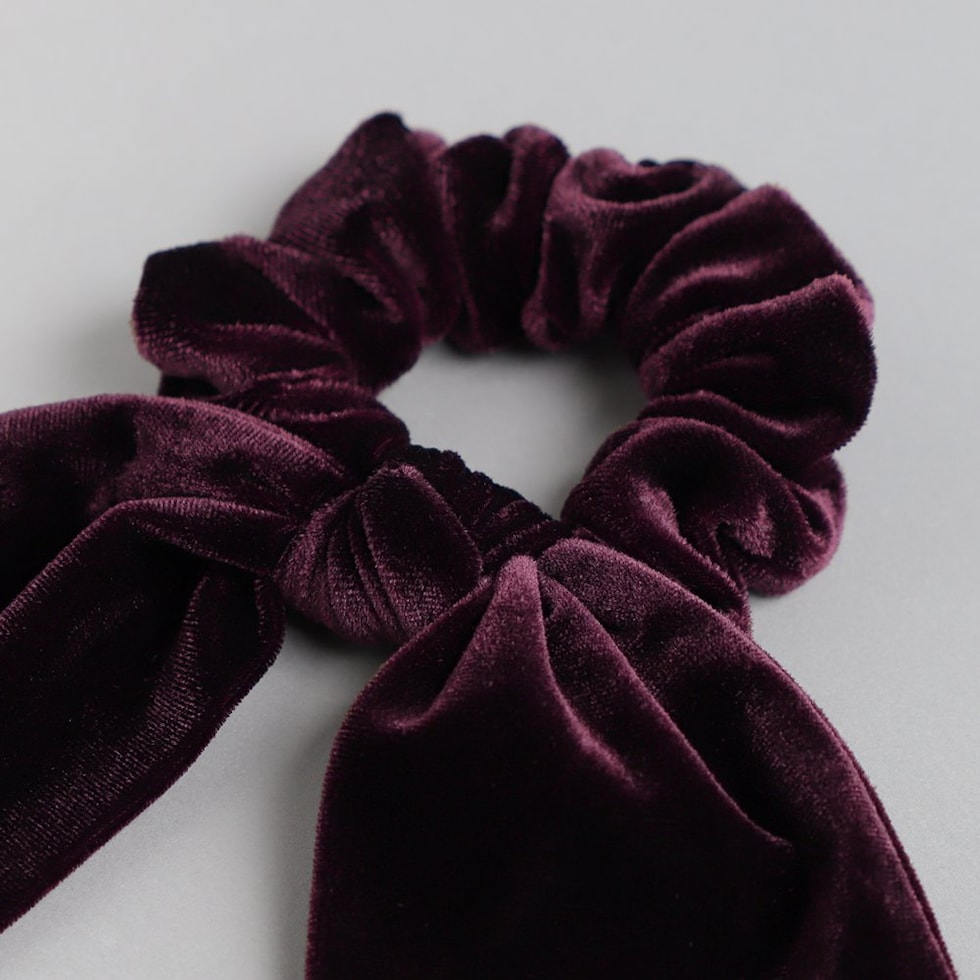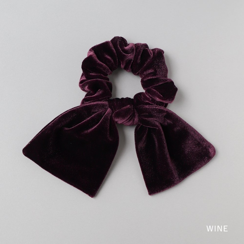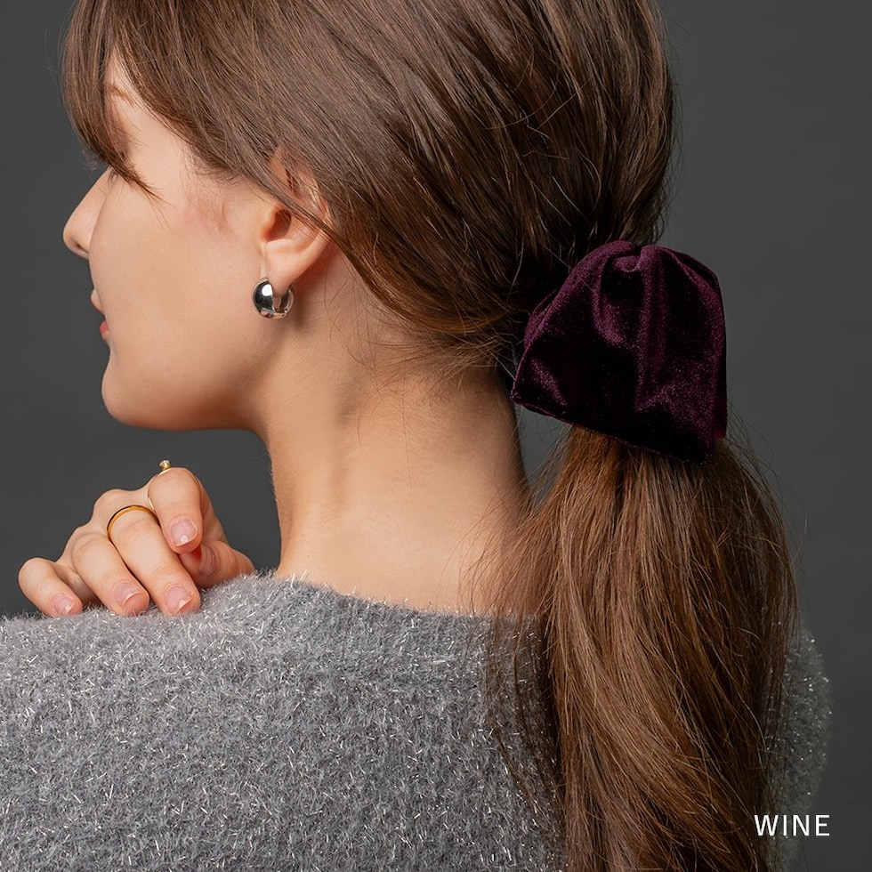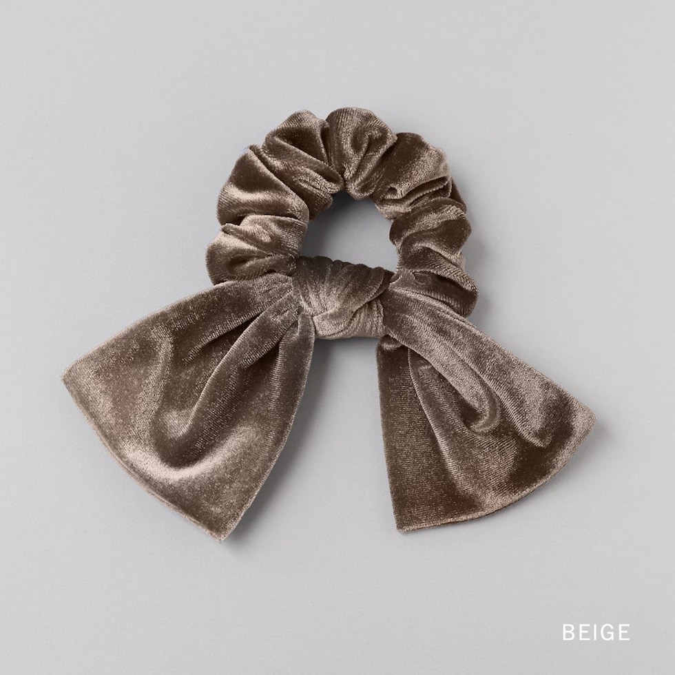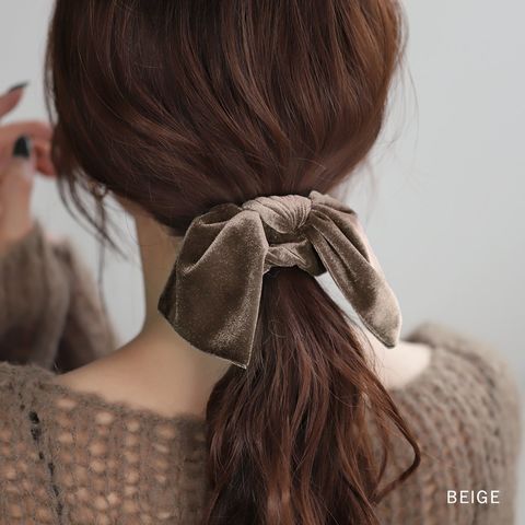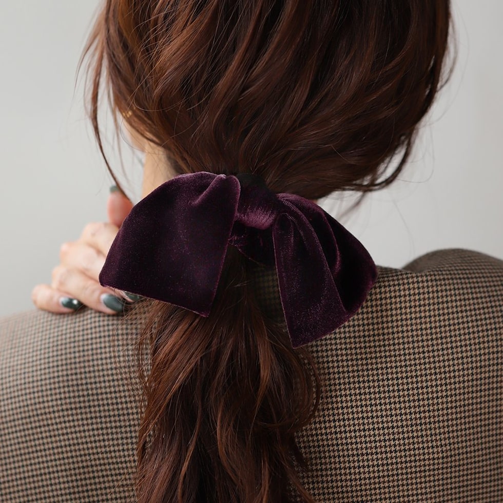 シックな色合いが上品なベロア生地の大きめリボンシュシュ。ラフな雰囲気のスクエアリボンがアレンジをグッとお洒落に仕上げます。サッと装着できるシュシュで普段使いにピッタリ◎