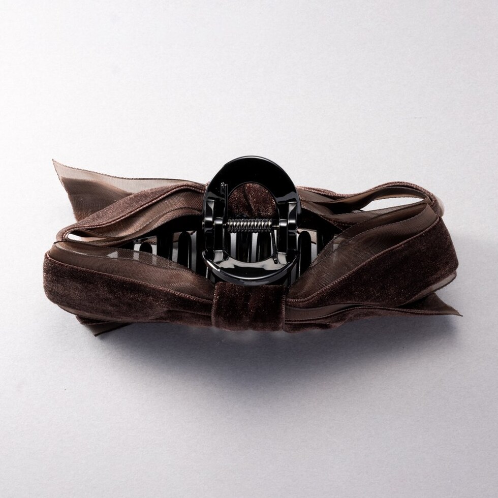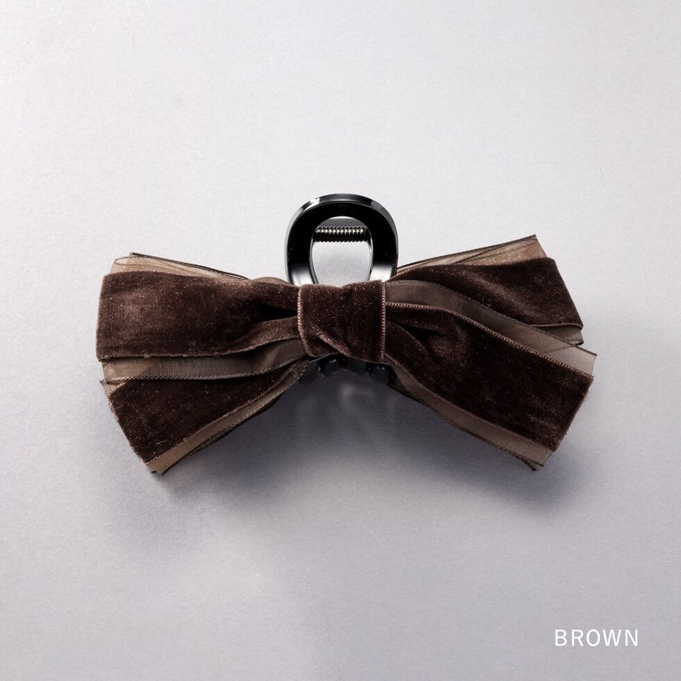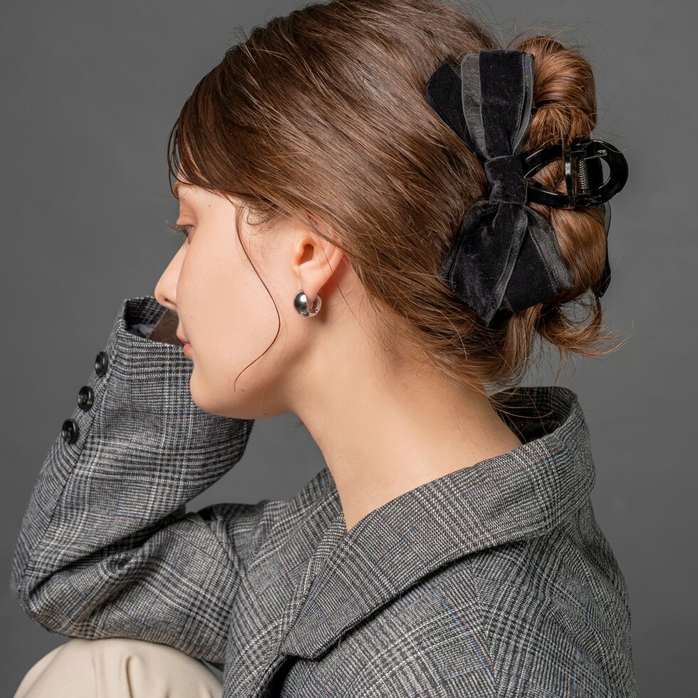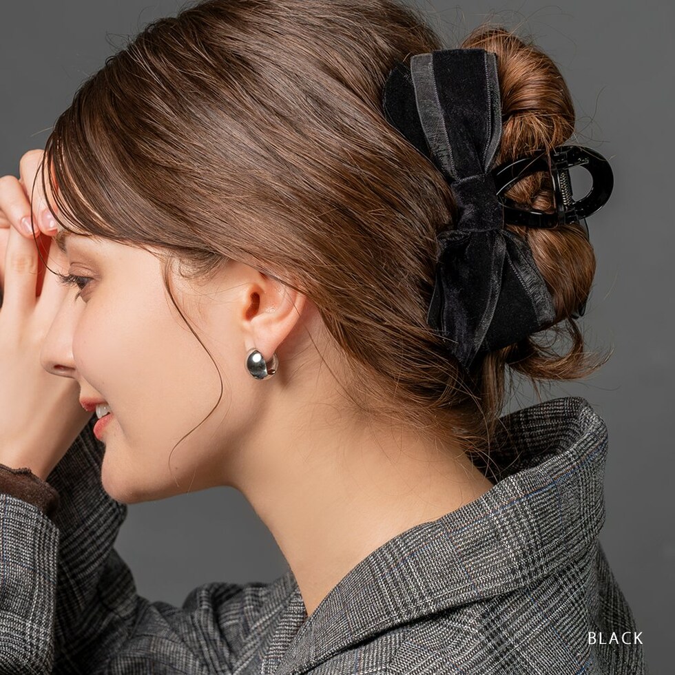 ベロアとオーガンジー素材の重なりが大人可愛いリボンヘアクリップ。シックなカラーと異素材の組み合わせが抜群にマッチしたひと品。これひとつでアレンジをグッと今っぽくしてくれるおススメのアテムです。