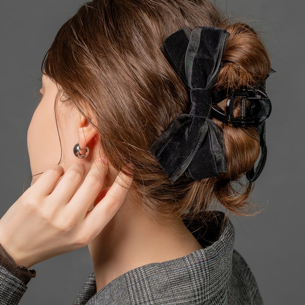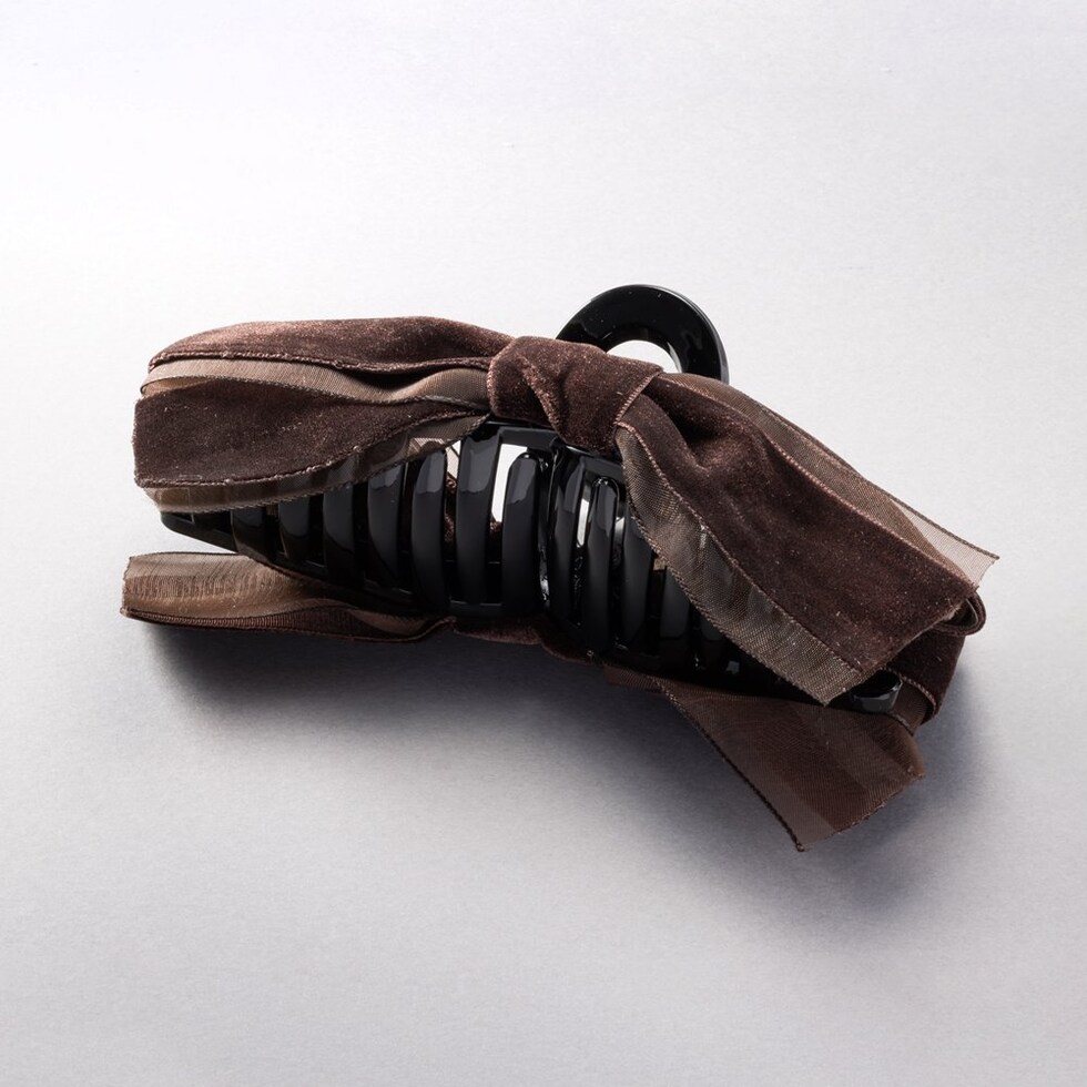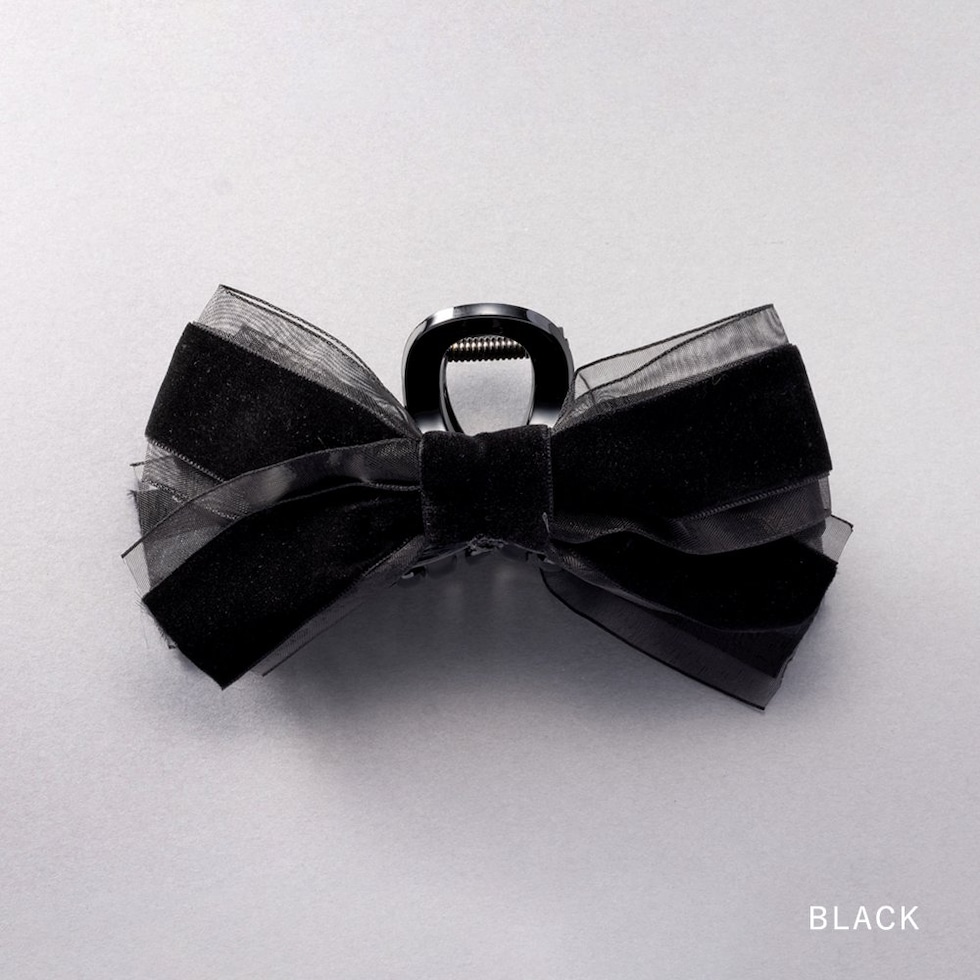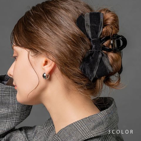 ベロアとオーガンジー素材の重なりが大人可愛いリボンヘアクリップ。シックなカラーと異素材の組み合わせが抜群にマッチしたひと品。これひとつでアレンジをグッと今っぽくしてくれるおススメのアテムです。