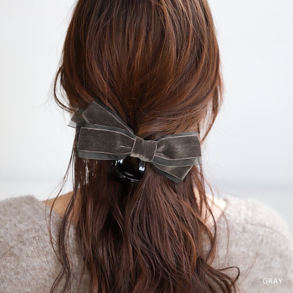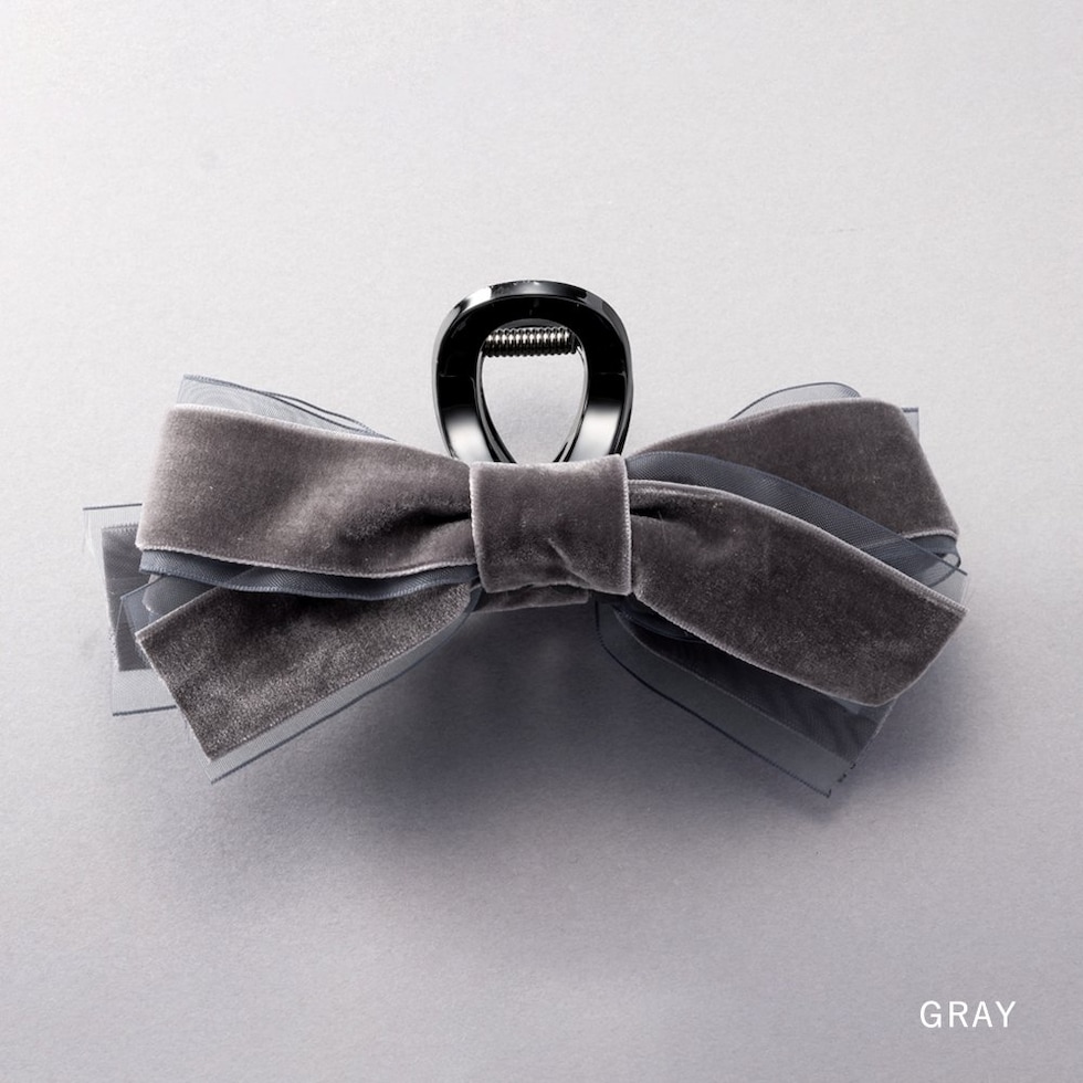 ヘアアクセサリー レディース バンスクリップ ヘアクリップ ベロア ベルベット リボン オーガンジー 大きめ 微光沢 存在感 ボリューム 挟むだけ 簡単 しっかり留まる グレー cream dot 定形外郵便 [グレー_ワンサイズ]