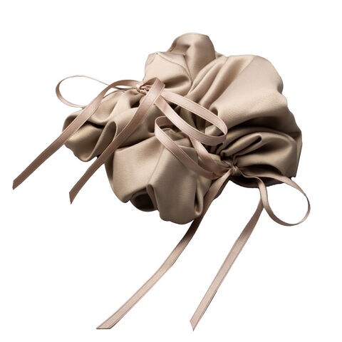 微光沢の滑らかな生地とリボンコードがこなれた印象のシュシュ。大人に似合うシックなカラーとラフに垂れたリボンが甘すぎず洒落感たっぷりな仕上がりに。大きめのサイジングでサッと着けるだけで映える後ろ姿が完成するオススメのひと品です。