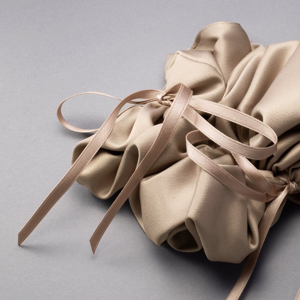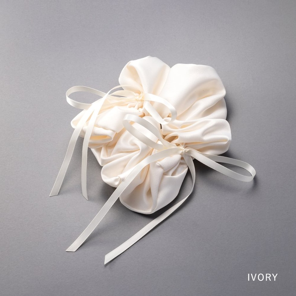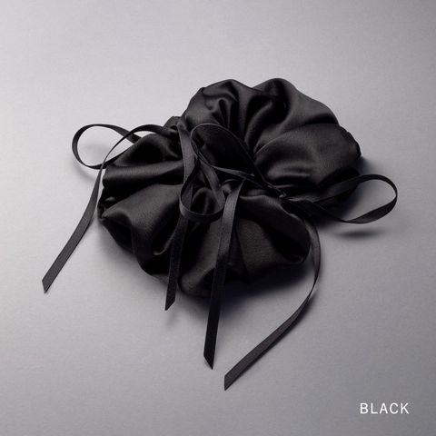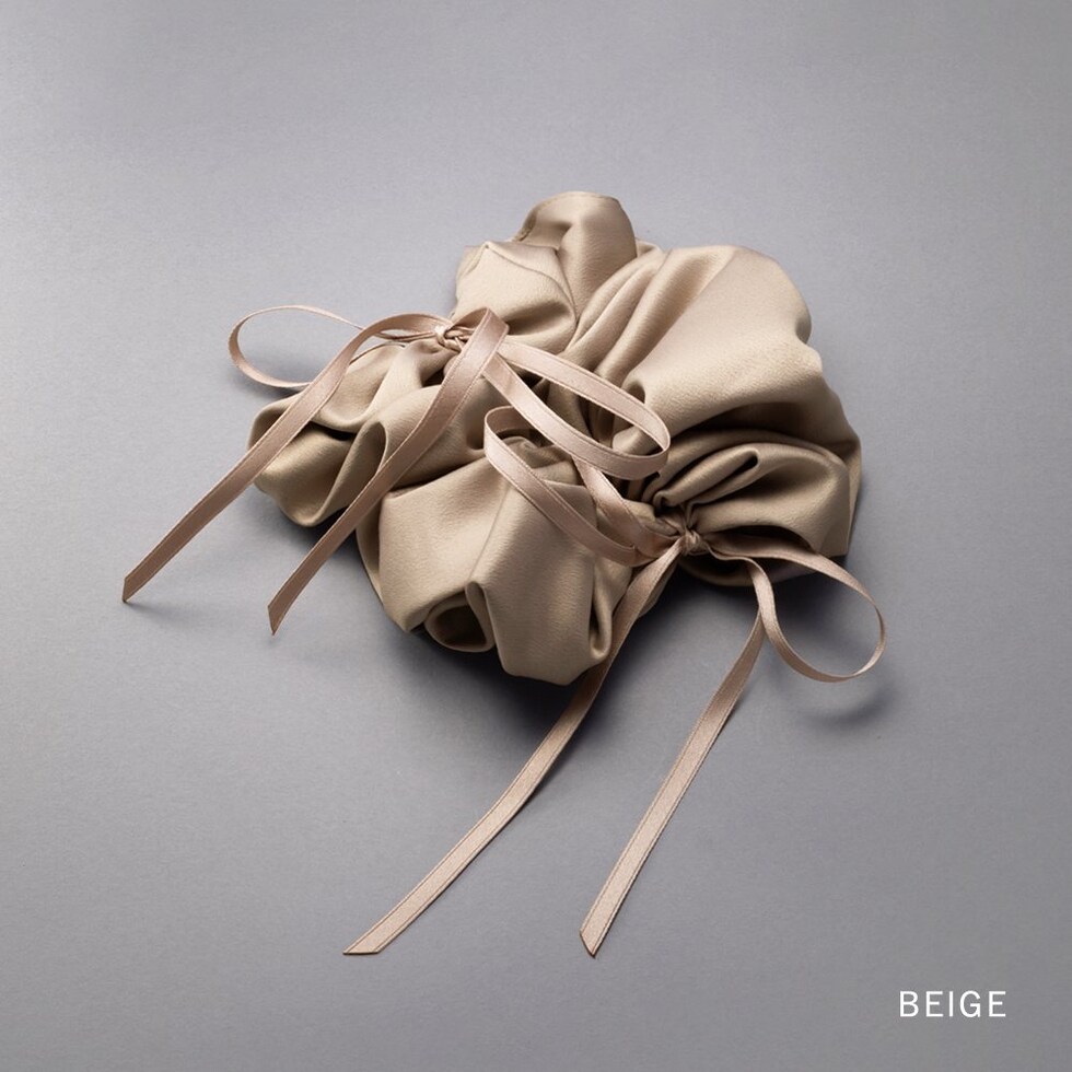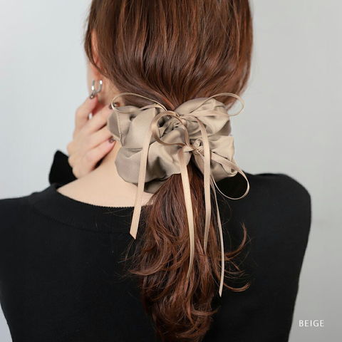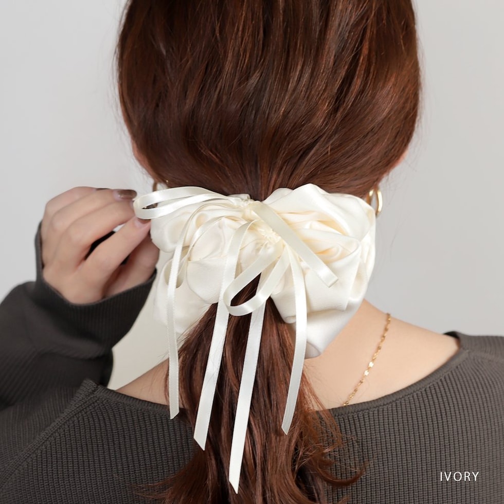 微光沢の滑らかな生地とリボンコードがこなれた印象のシュシュ。大人に似合うシックなカラーとラフに垂れたリボンが甘すぎず洒落感たっぷりな仕上がりに。大きめのサイジングでサッと着けるだけで映える後ろ姿が完成するオススメのひと品です。