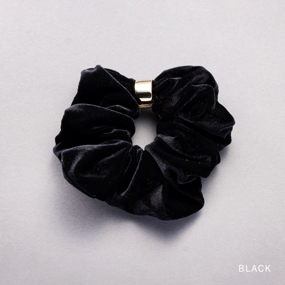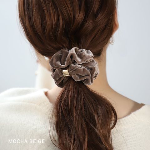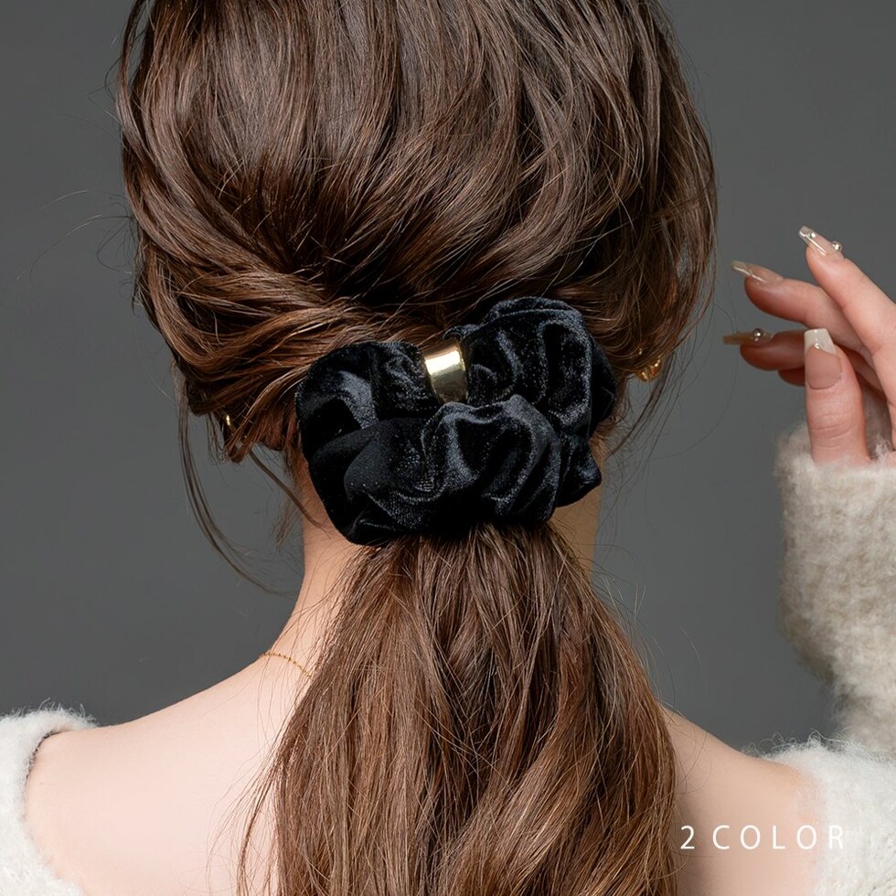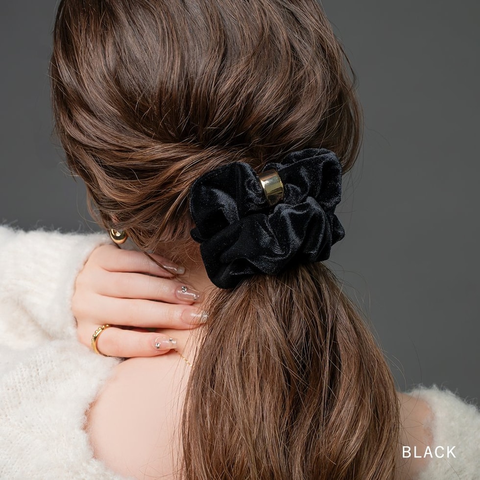 メタルリングがデザインにアクセントを添えるベロア シュシュ。エレガントでスタイリッシュなベロア素材がヘアスタイルをグッと格上げしてくれるひと品。見た目だけでなく手触りも柔らかく心地よいシーズンライクなアイテムです。