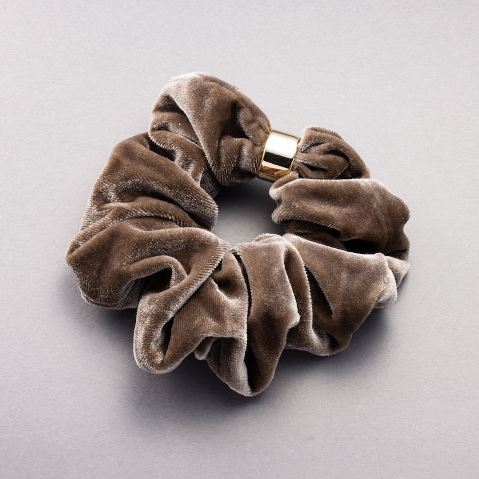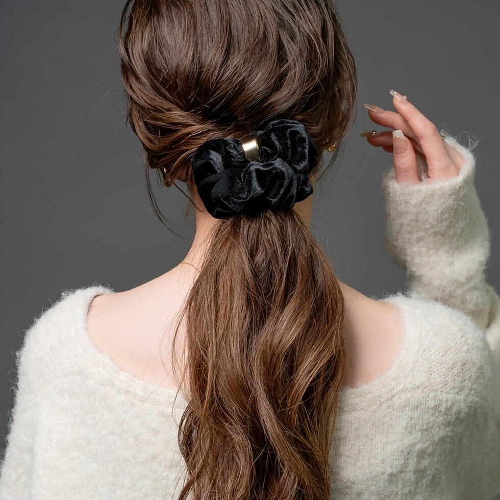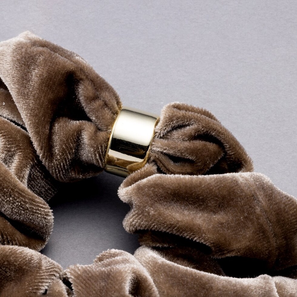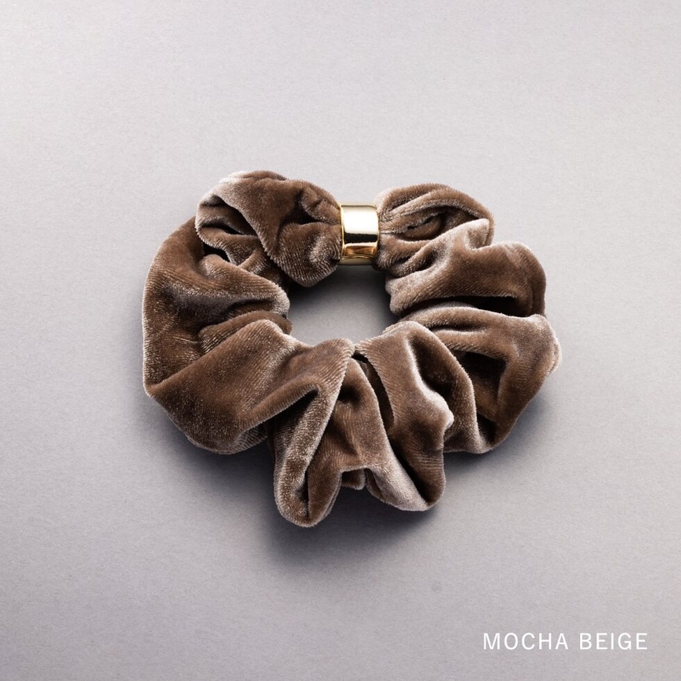 メタルリングがデザインにアクセントを添えるベロア シュシュ。エレガントでスタイリッシュなベロア素材がヘアスタイルをグッと格上げしてくれるひと品。見た目だけでなく手触りも柔らかく心地よいシーズンライクなアイテムです。