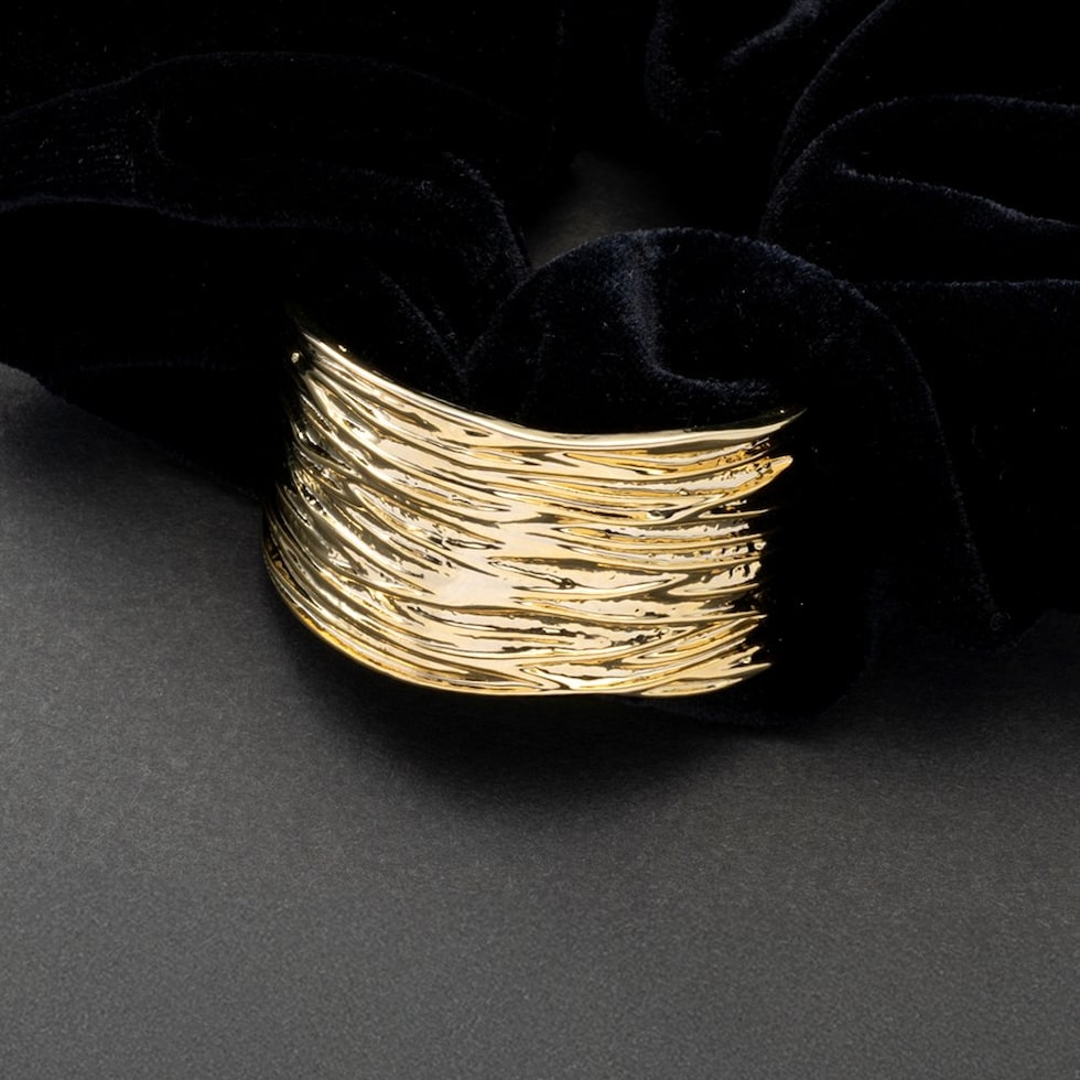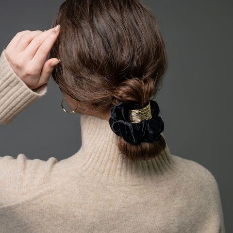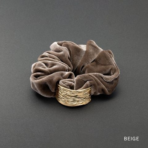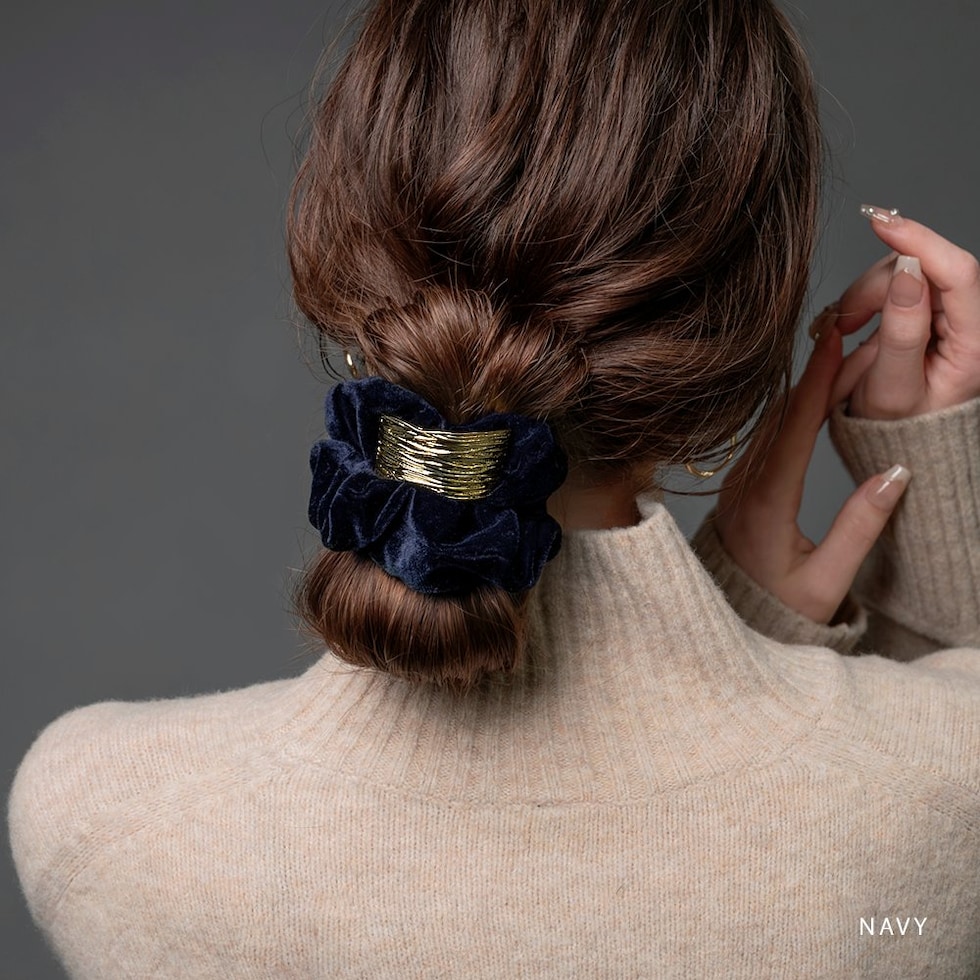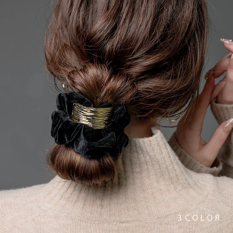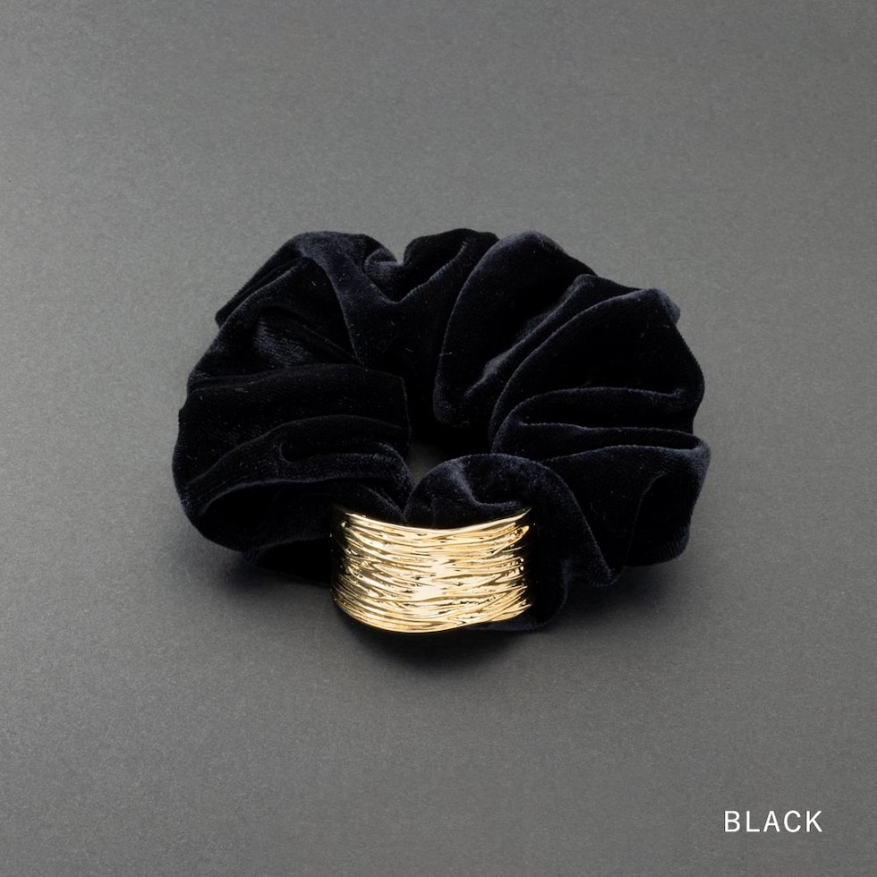 光沢感のあるベロア生地に凹凸加工を施したスクエアメタルが艶めくシュシュ。存在感を放つメタルがアレンジをグッとオシャレな雰囲気に◎大人に似合うシックなカラーとサッと装着できる便利さでデイリー使いにピッタリなアイテムです。