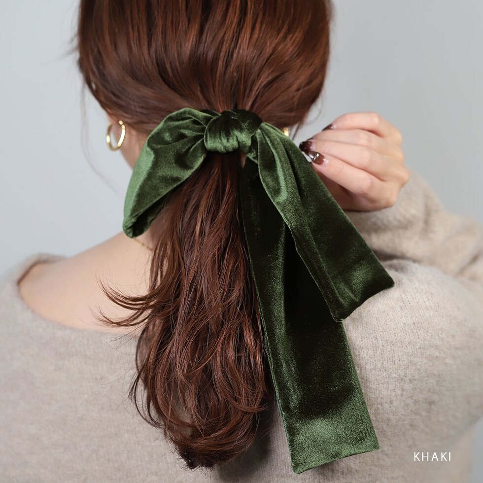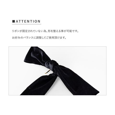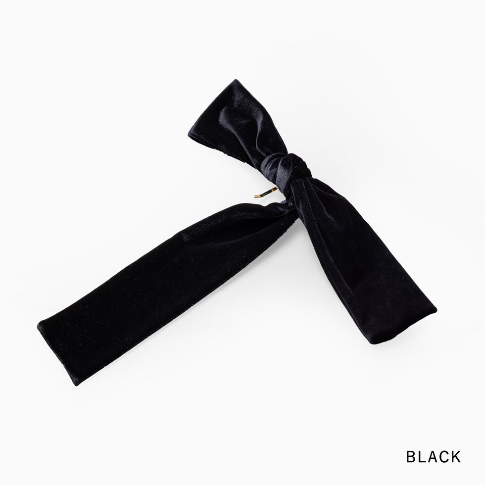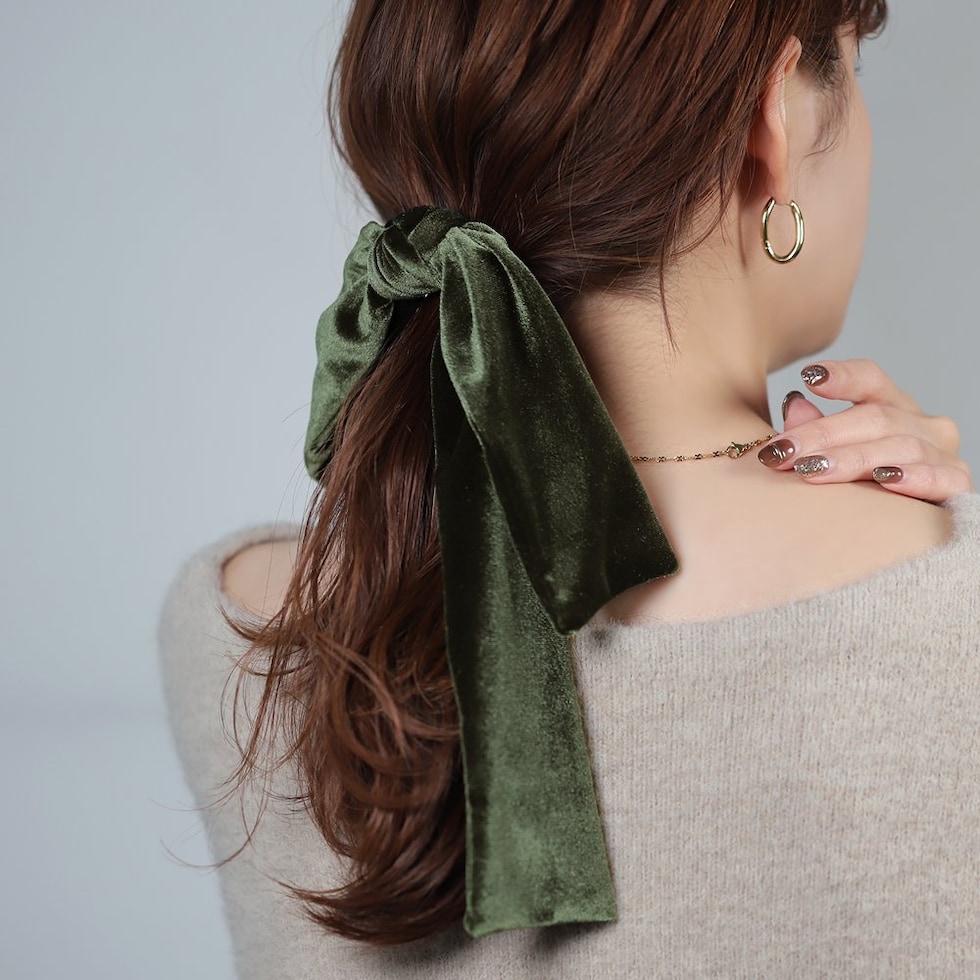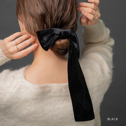 ほんのりと光沢感あるベロア生地のアシンメトリーなリボンポニーフック。落ち感のあるロングリボンが揺れる、エレガントで存在感バツグンなデザイン。髪の毛にサッと差し込むだけで簡単にヘアアレンジができ、シーズンライクな印象に◎