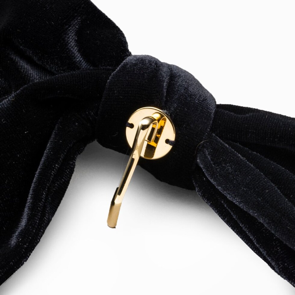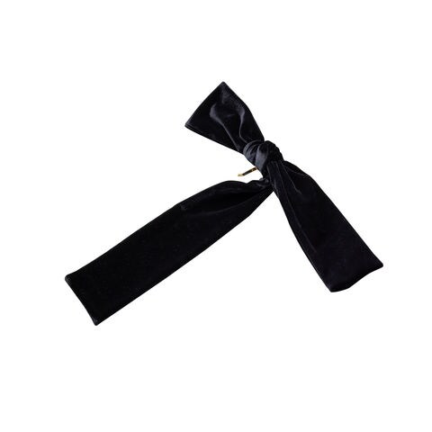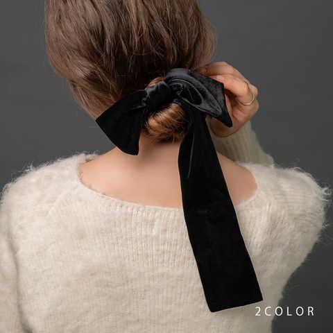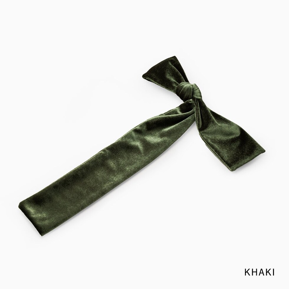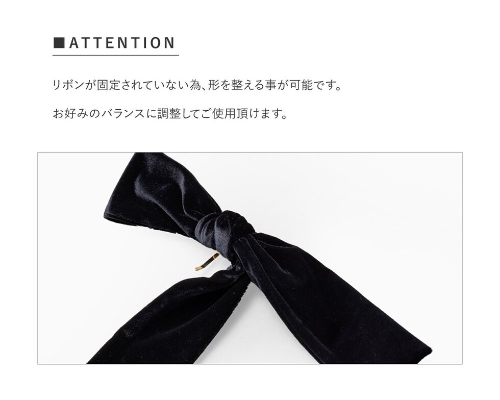 ほんのりと光沢感あるベロア生地のアシンメトリーなリボンポニーフック。落ち感のあるロングリボンが揺れる、エレガントで存在感バツグンなデザイン。髪の毛にサッと差し込むだけで簡単にヘアアレンジができ、シーズンライクな印象に◎