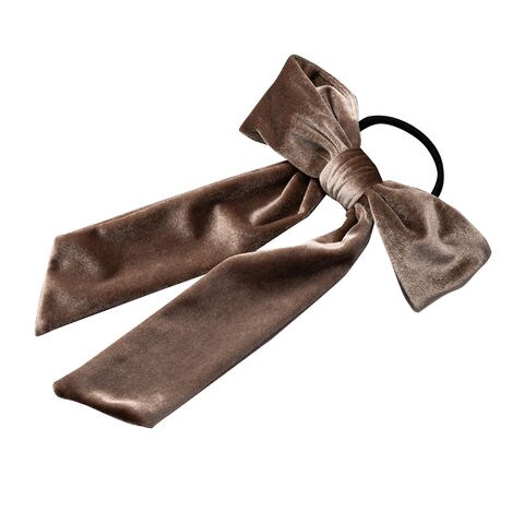 ほんのりと光沢感ある大きめベロアリボンのヘアゴム。存在感たっぷりなロング丈のリボンがアレンジをグッとオシャレな雰囲気に仕上げます。シックなカラー展開で甘くなりすぎず大人っぽい印象を与えてくれるアイテムです。