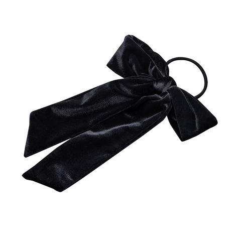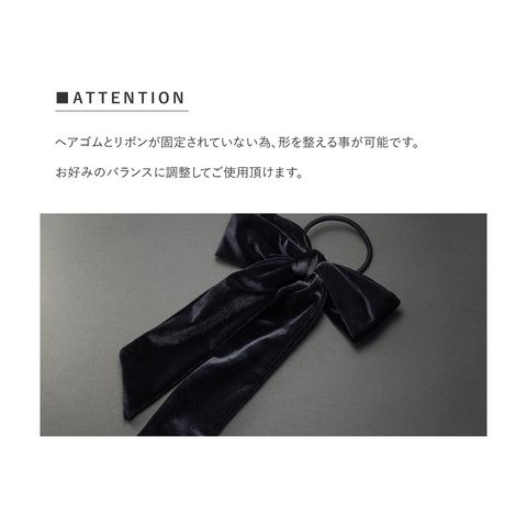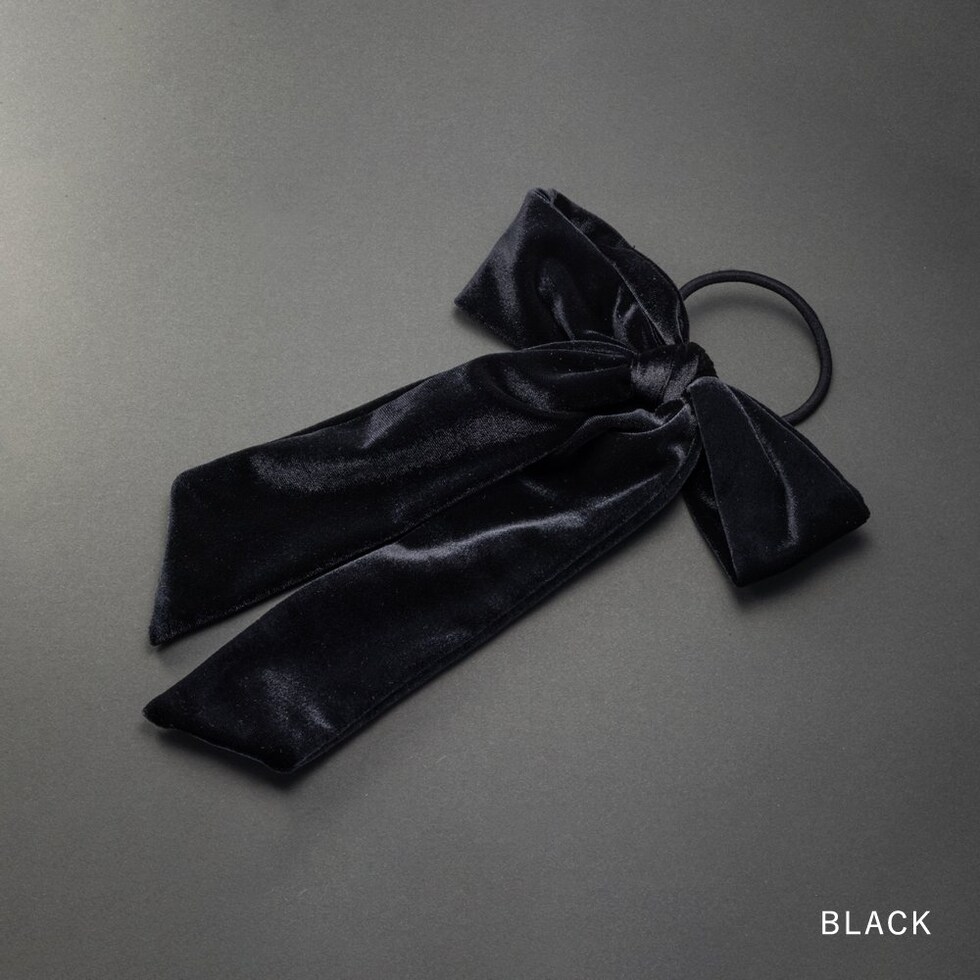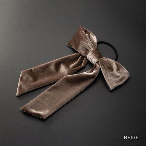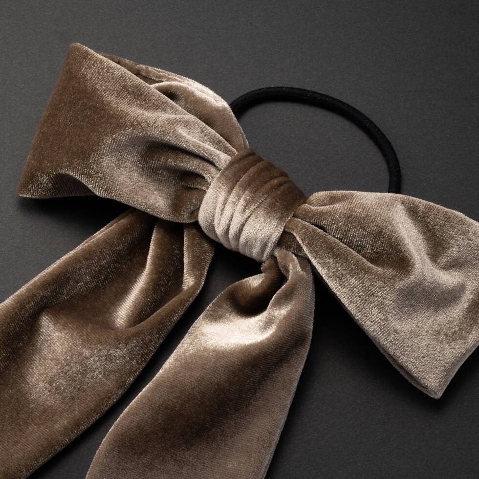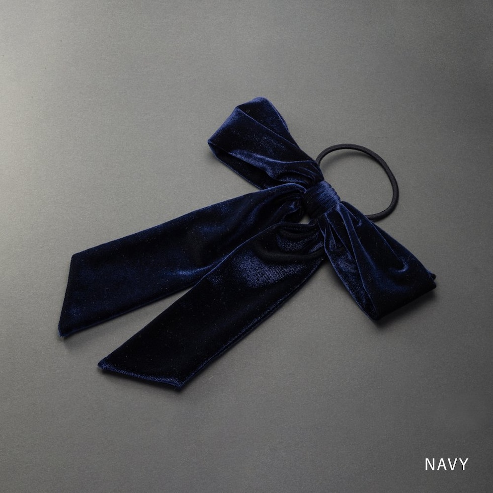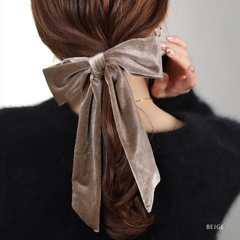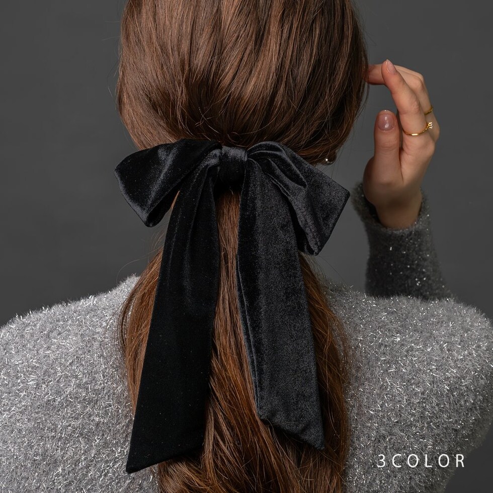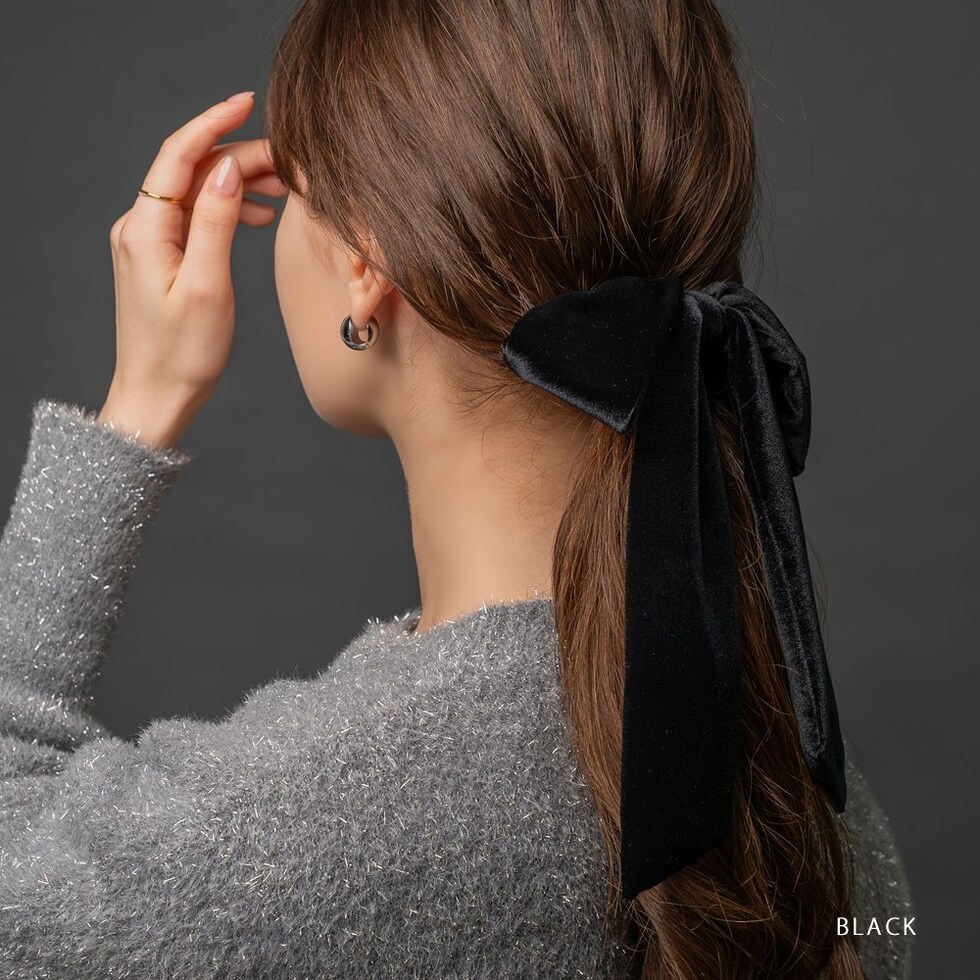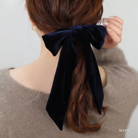 ほんのりと光沢感ある大きめベロアリボンのヘアゴム。存在感たっぷりなロング丈のリボンがアレンジをグッとオシャレな雰囲気に仕上げます。シックなカラー展開で甘くなりすぎず大人っぽい印象を与えてくれるアイテムです。