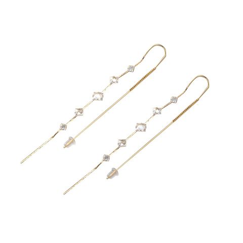 大きさの異なる5粒の菱形ビジューが揺らめきながら煌めくラインチェーンピアス。アメリカンタイプのロングデザインで、いつものスタイリングを華やかにクラスアップしてくれます。お出かけはもちろんパーティーシーンやお呼ばれなど華やかな場にもぴったり◎低アレルギーのニッケルフリー素材を使用しているので、長時間の着用も安心です。