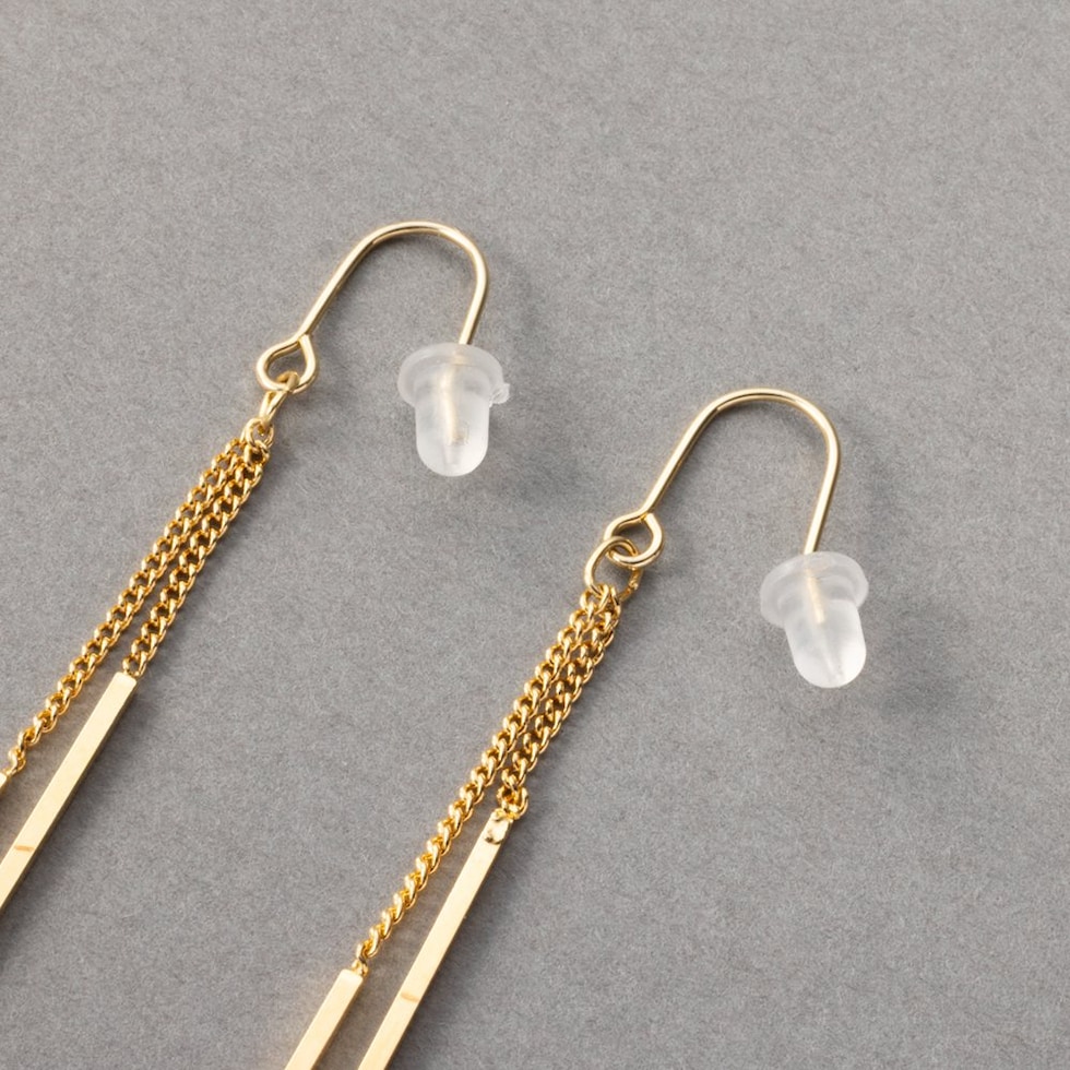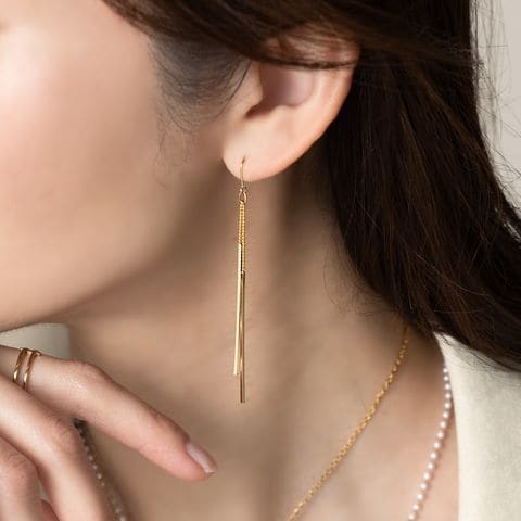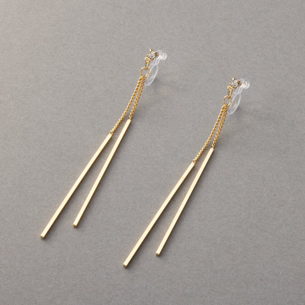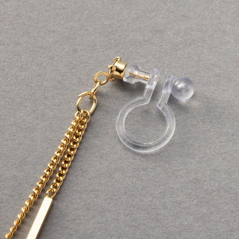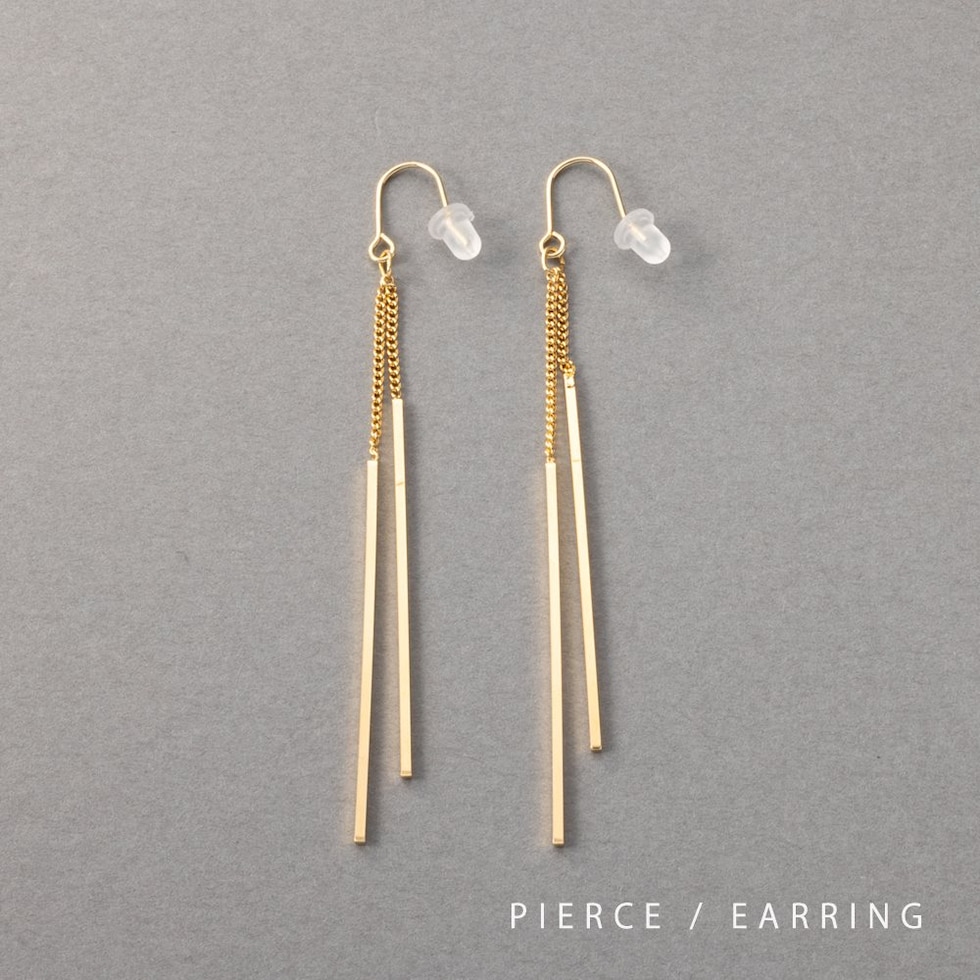 華奢チェーンの先でダブルのスクエアバーが揺らめくピアス/イヤリング。イヤリングには煌めくビジューを配したこだわりのデザイン。スマートで程よい華やかさをプラスしてくれる大人の女性にぴったりなひと品◎