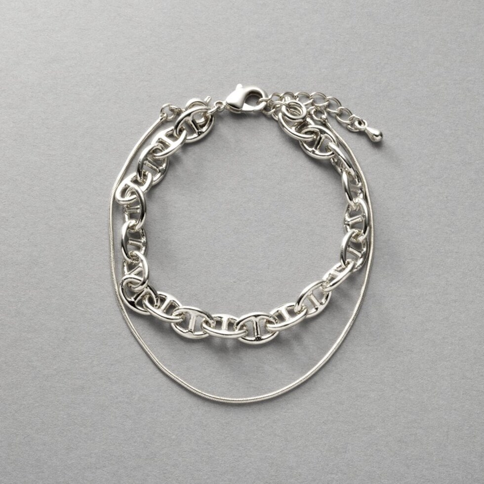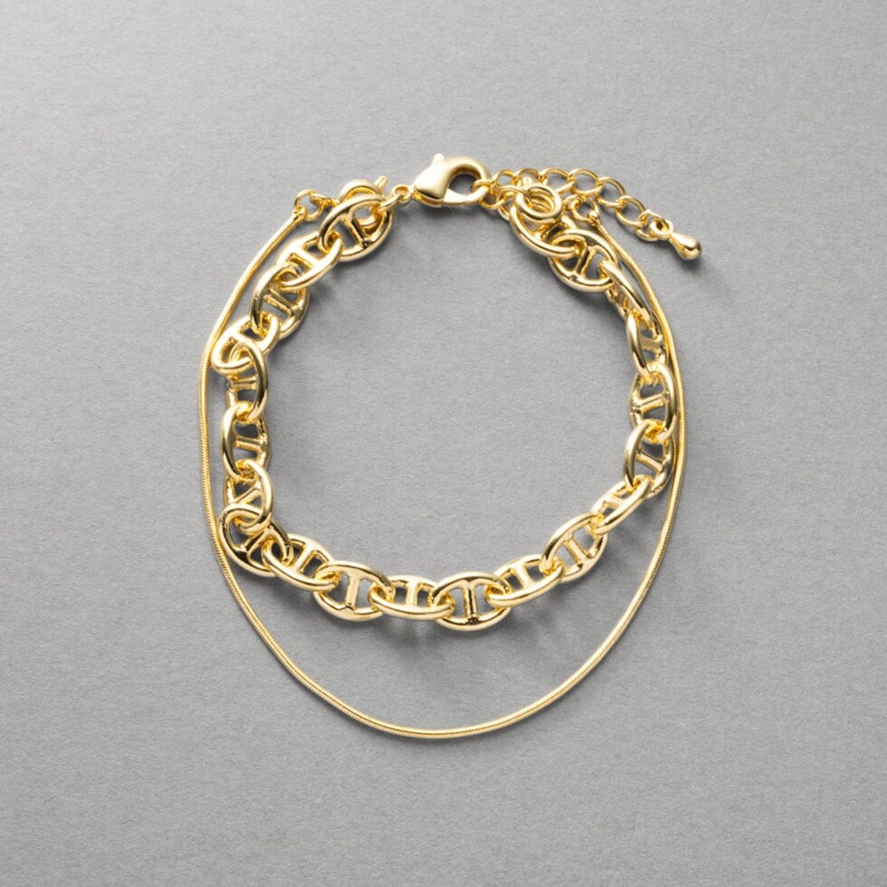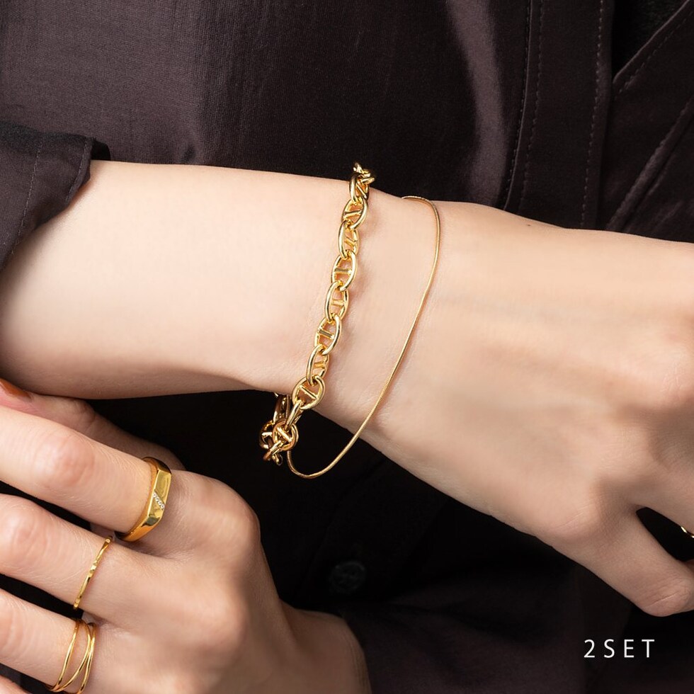 マリンとスネークチェーンの2セットブレスレット。存在感がありながら女性らしい印象に仕上がるひと品。重ね着けはもちろん、それぞれ単品でも使えるコスパ抜群な組み合わせ。手元にこなれ感をプラスします。