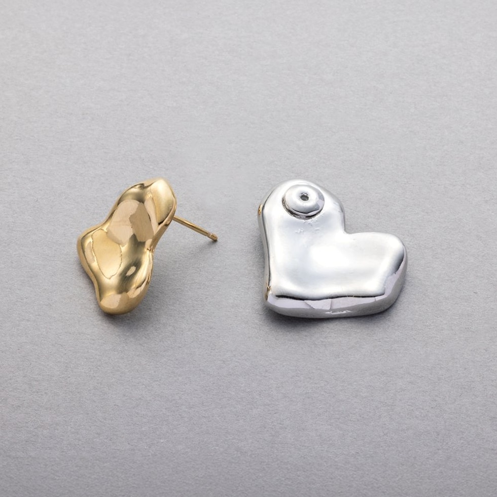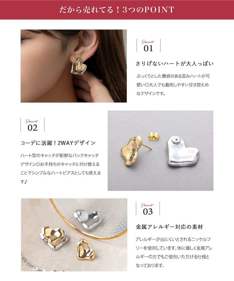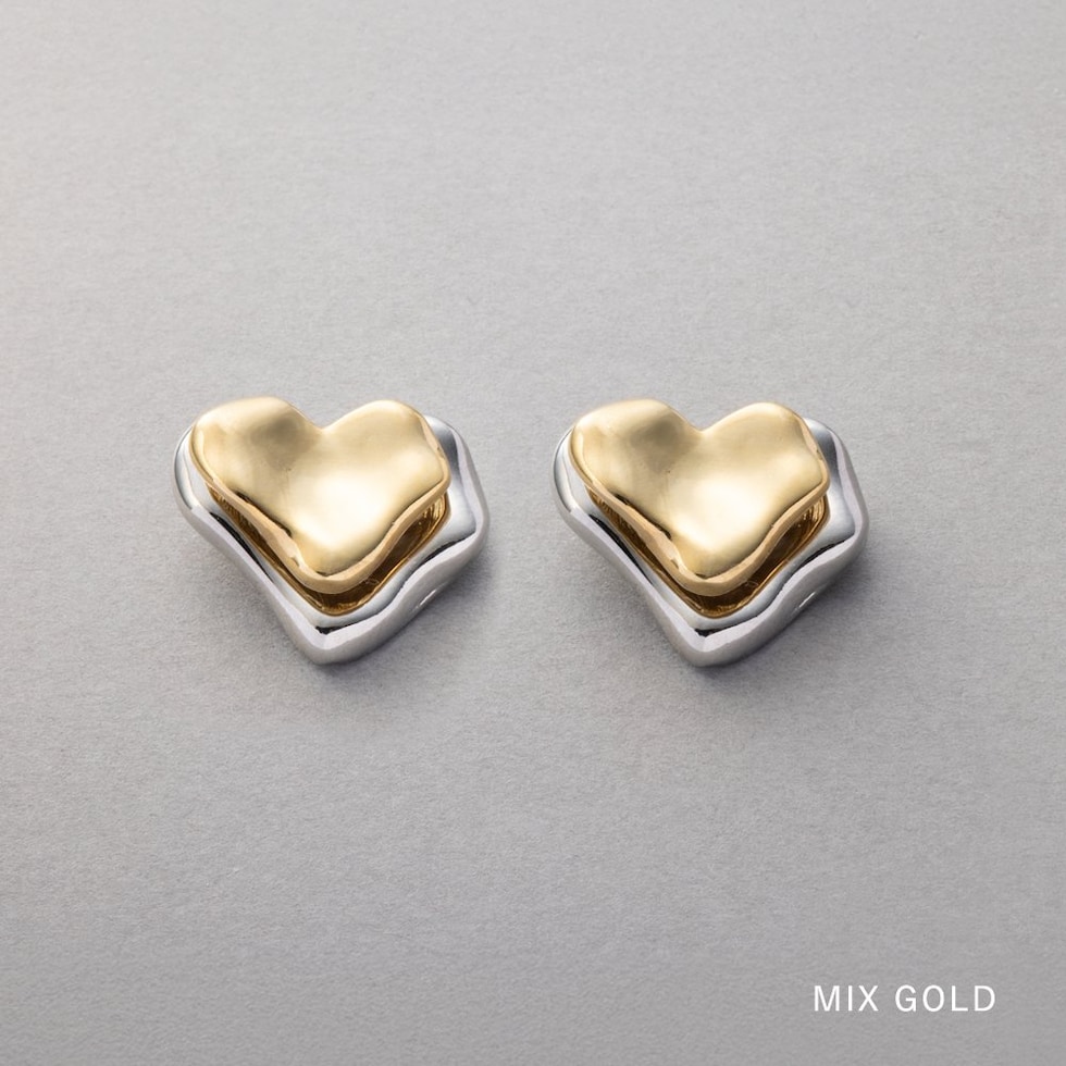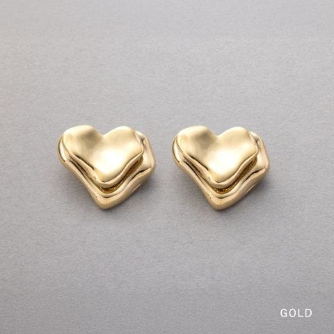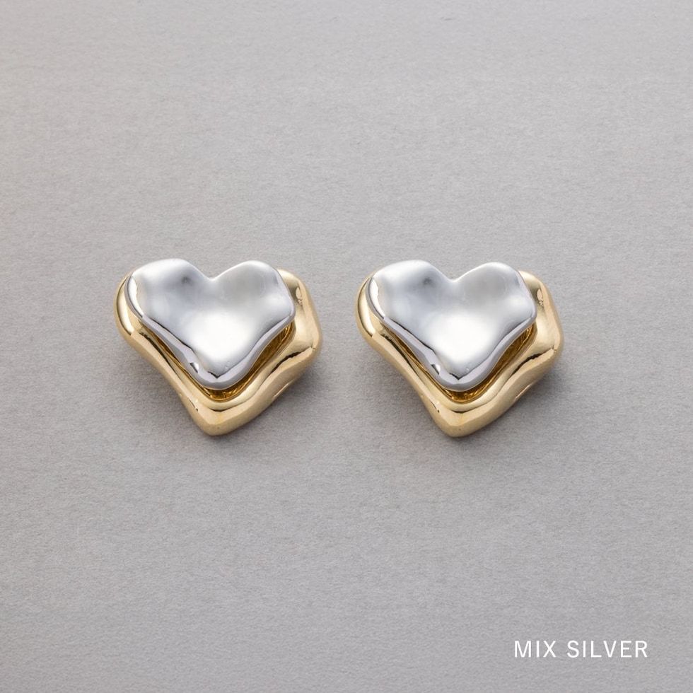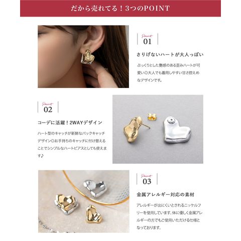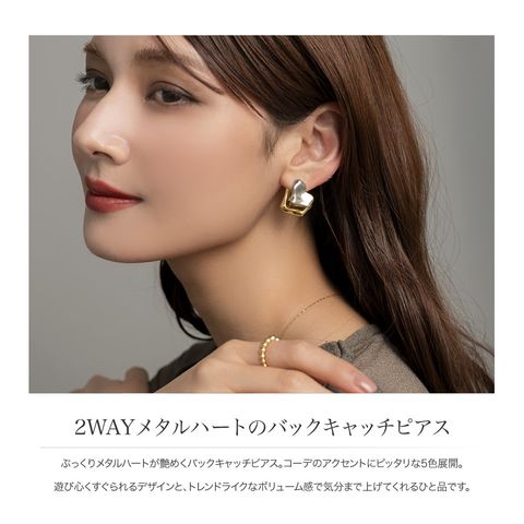 ぷっくりメタルハートが艶めくバックキャッチピアス。艶やかな質感でコーデのアクセントにピッタリなひと品です。