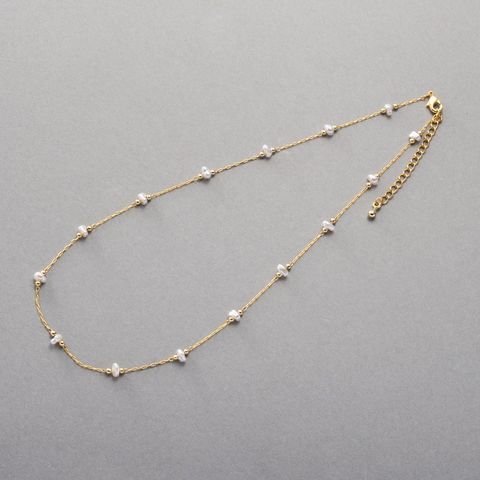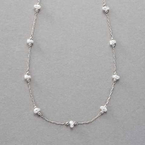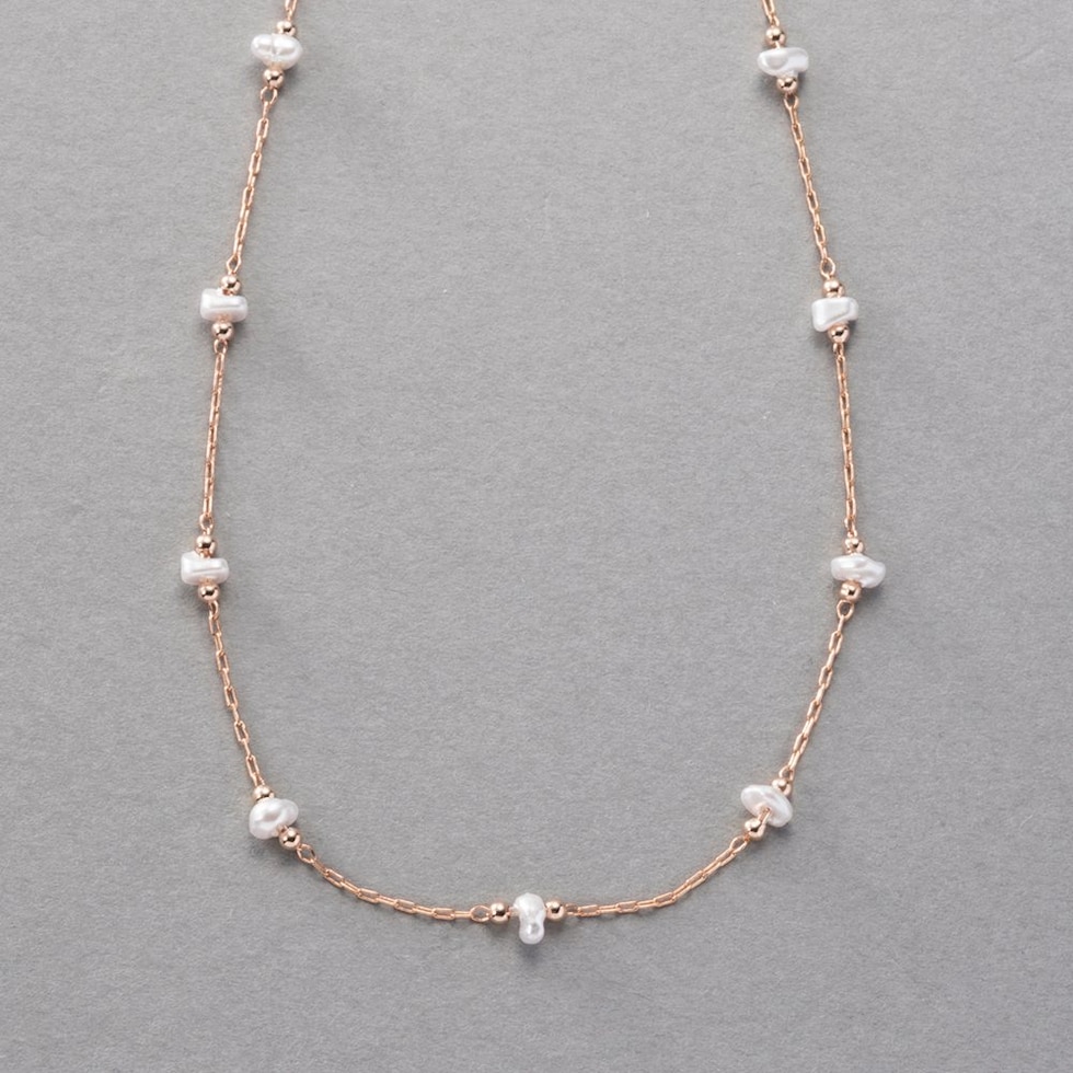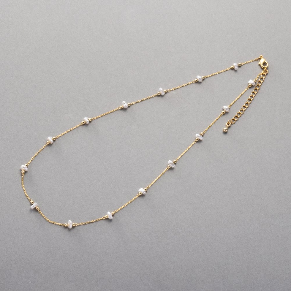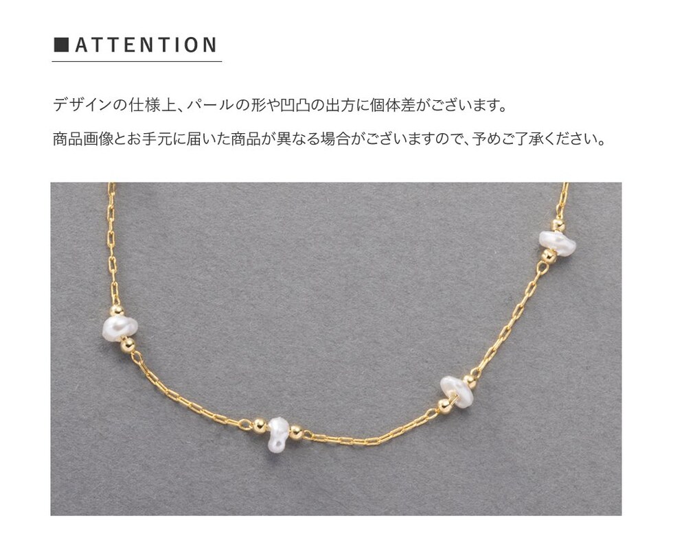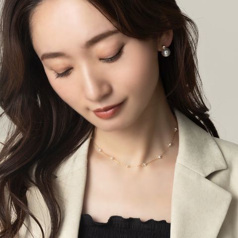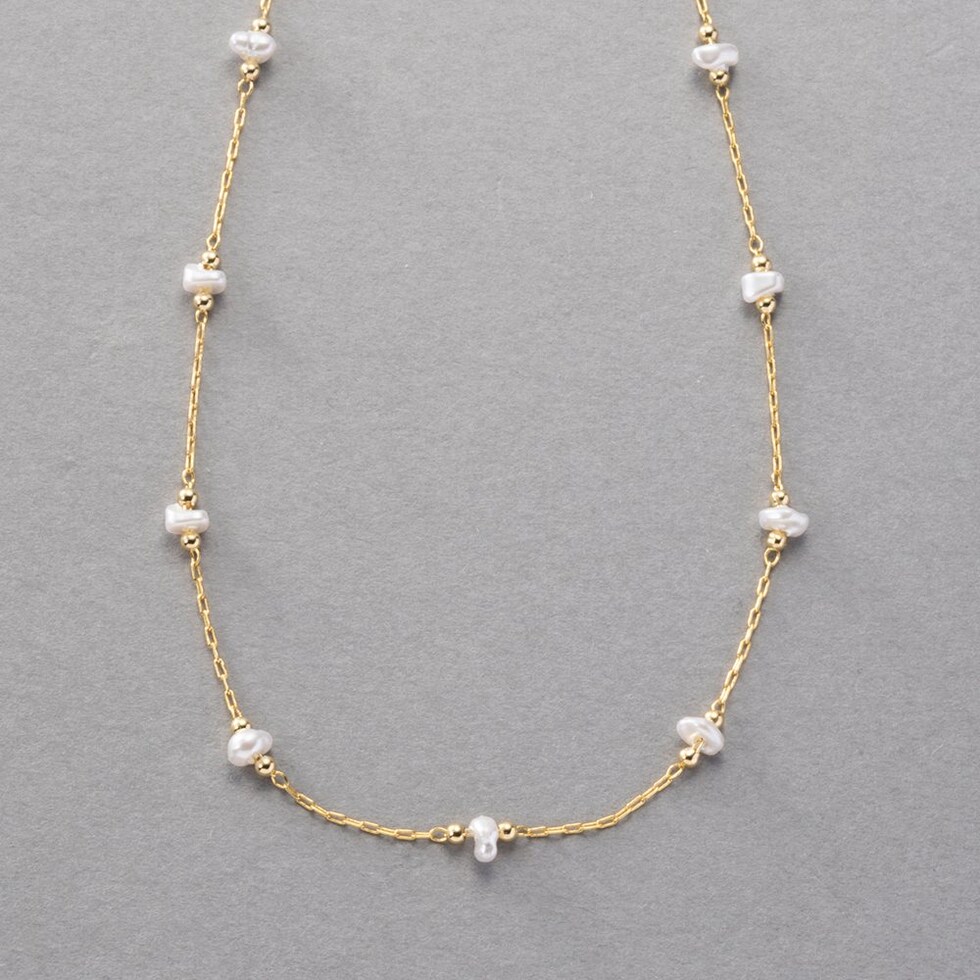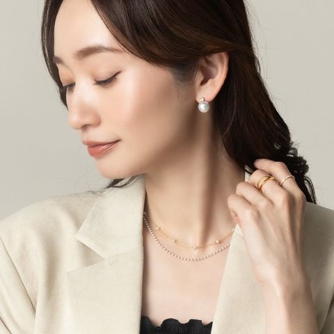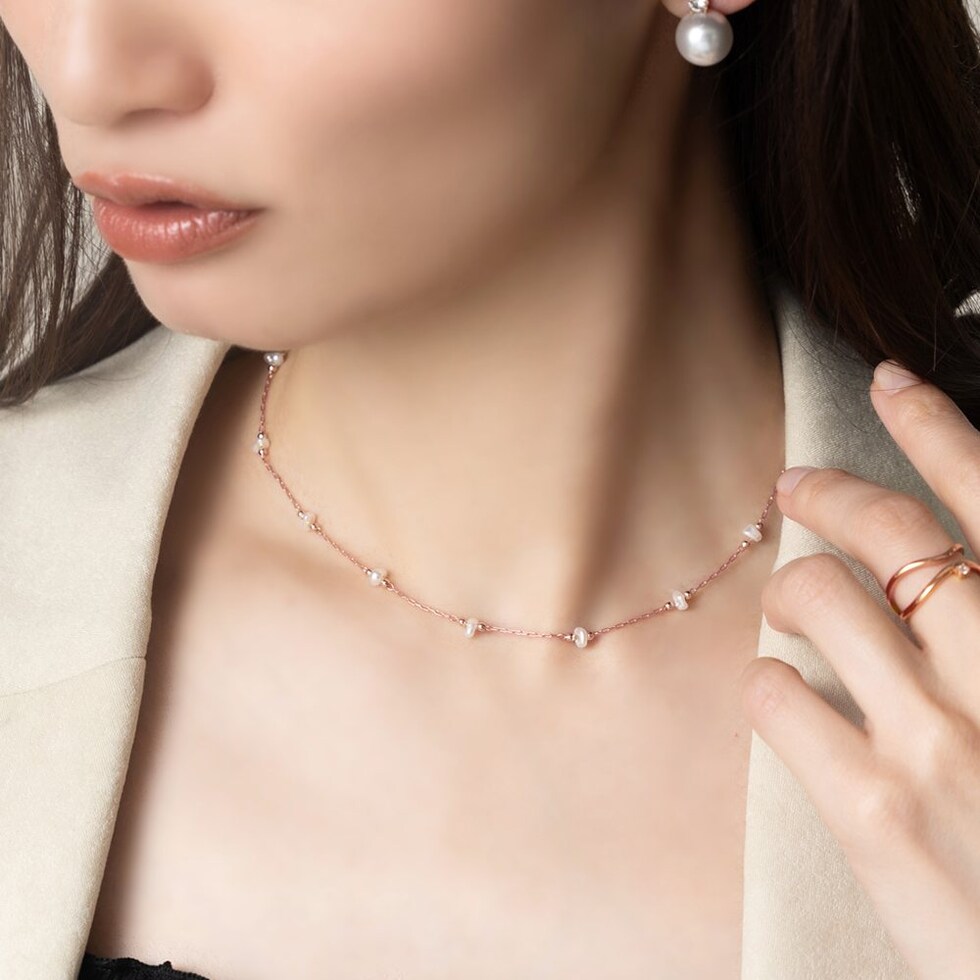 上品に艶めくニュアンスパールのネックレス。シンプルで華奢なデザインがデコルテを品よく大人な雰囲気に仕上げてくれます。単品使いはもちろん、重ね付けも楽しめる使い勝手抜群のひと品。低アレルギーのニッケルフリー素材を使用しているので、長時間の着用も安心です。
