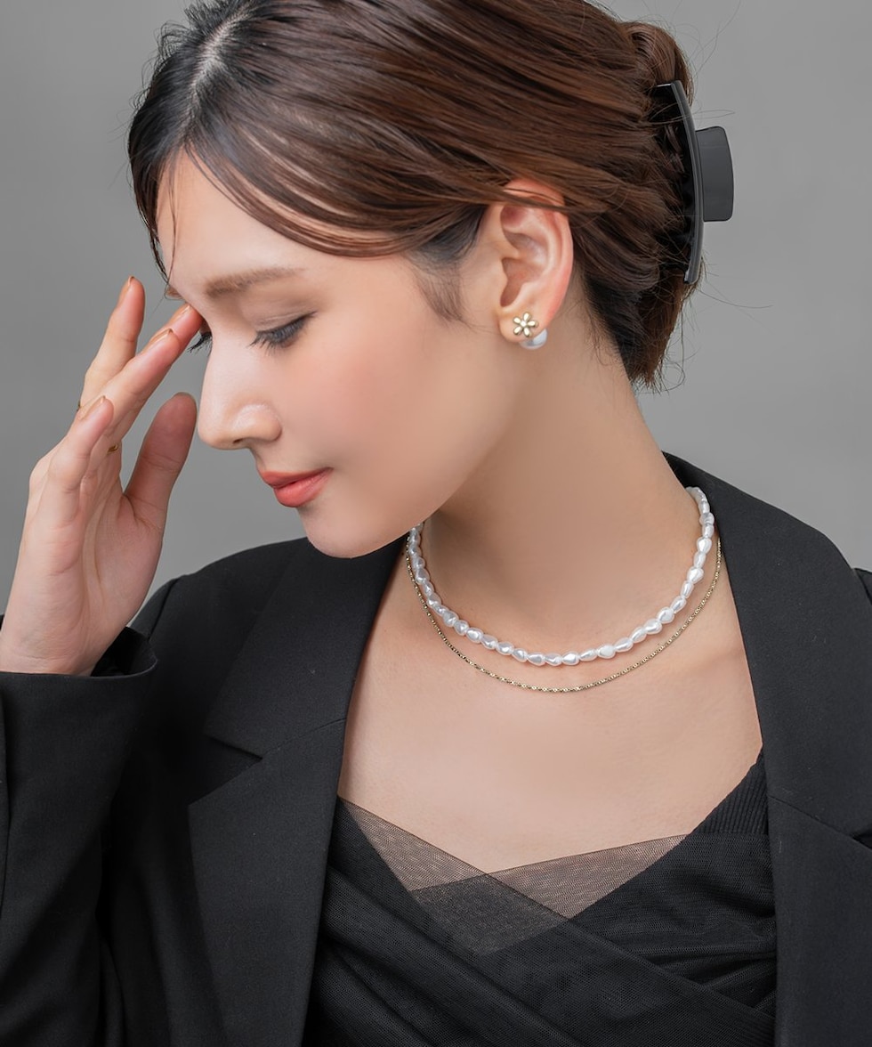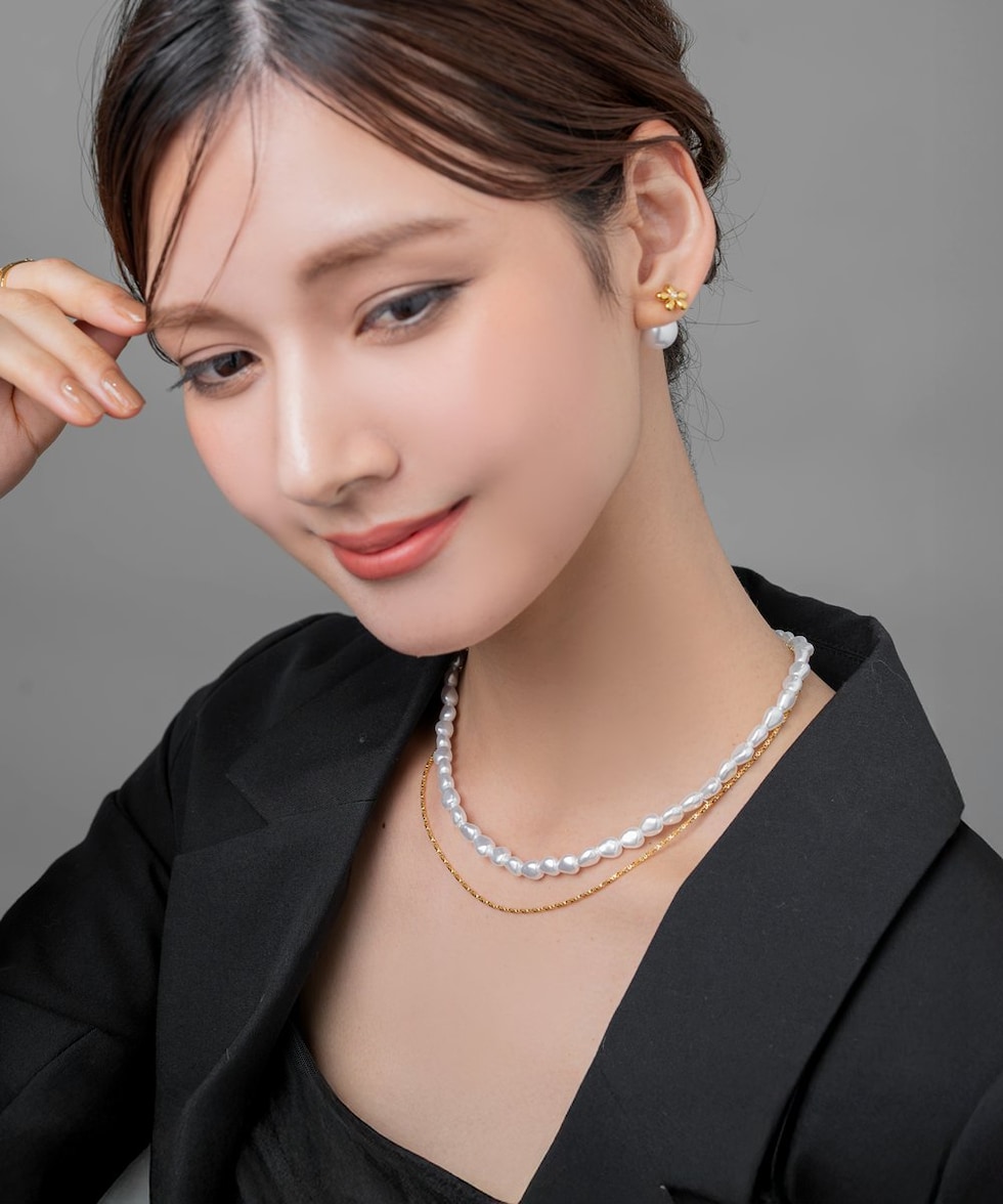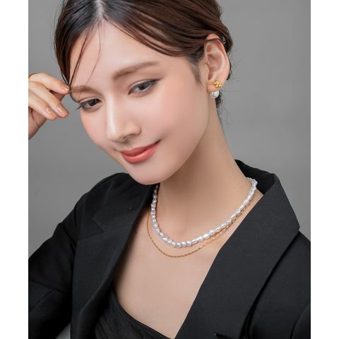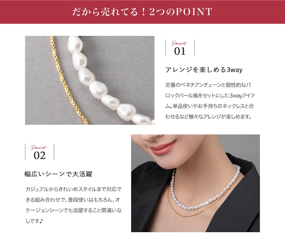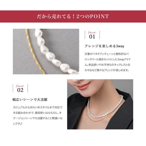 定番のベネチアンチェーンと個性的なバロックパール風をセットにした3wayアイテム。単品使いやお手持ちのネックレスと合わせるなど様々なアレンジが楽しめます。