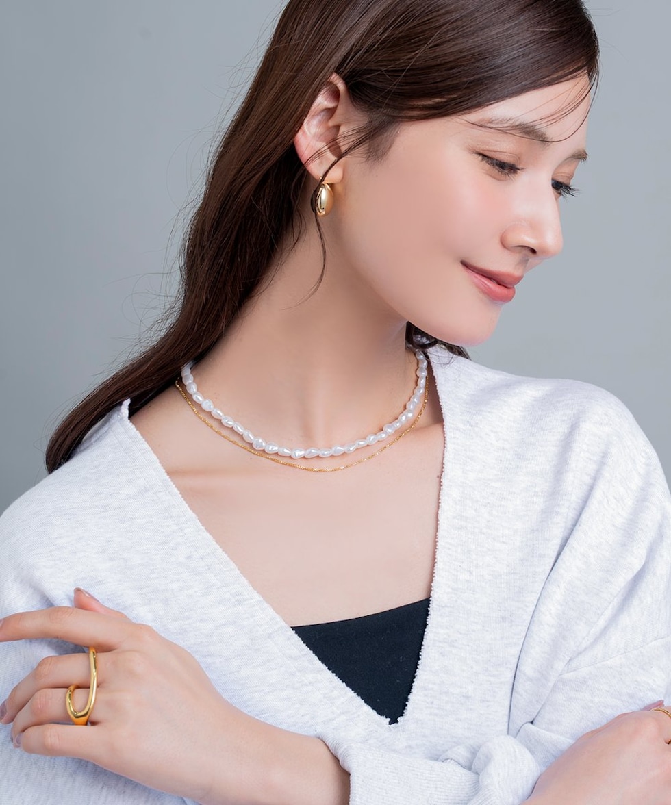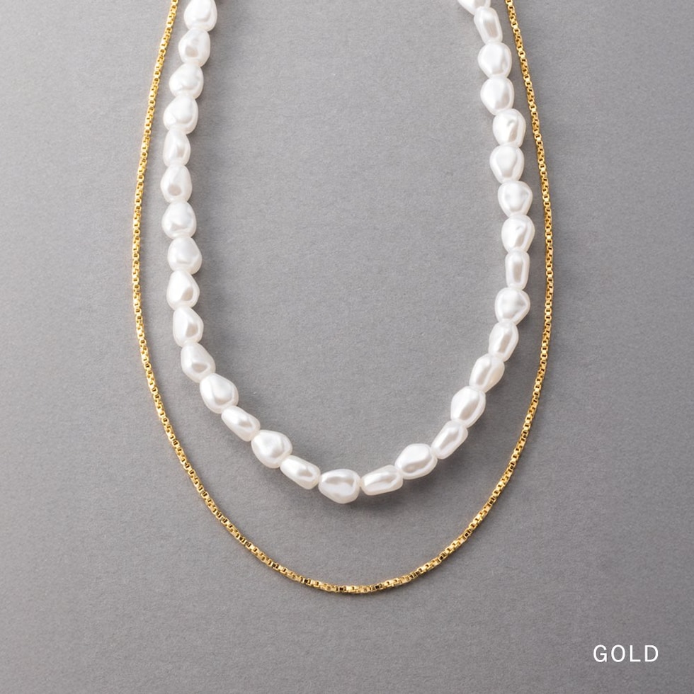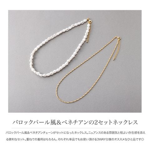 バロックパール風&ベネチアンチェーンがセットになったネックレス。ニュアンスのある雰囲気と程よい存在感を添える便利なセット。重ねての着用はもちろん、それぞれ単品でもお使い頂ける3WAY仕様のオススメなひと品です◎