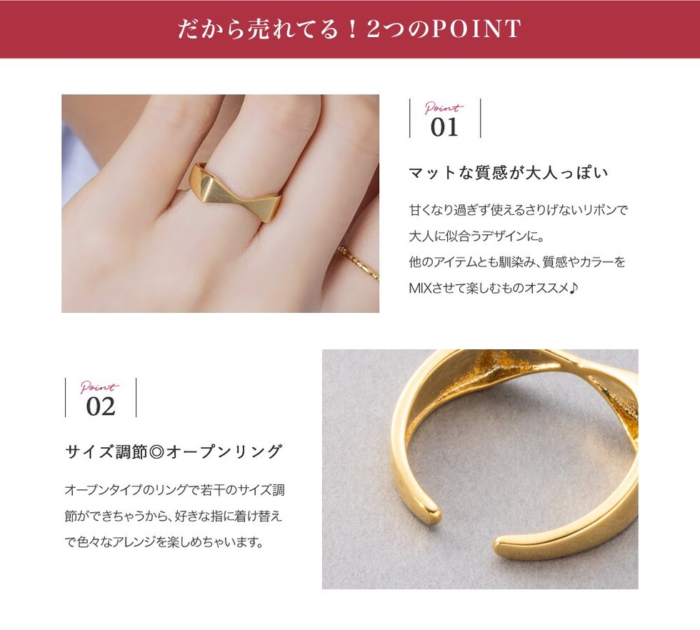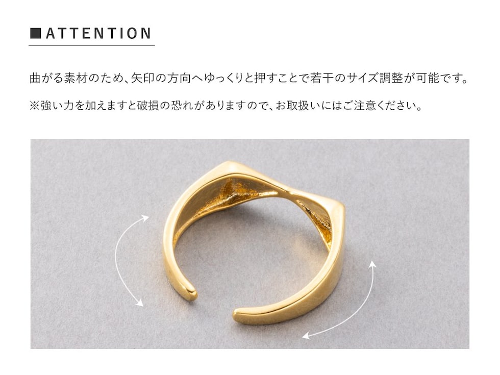 オープンタイプのリングで若干のサイズ調節ができちゃうから、好きな指に着け替えで色々なアレンジを楽しめちゃいます。