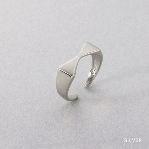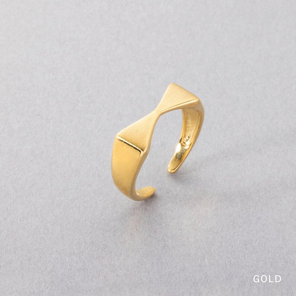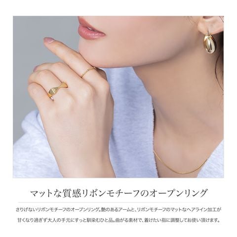 さりげないリボンモチーフのオープンリング。艶のあるアームと、リボンモチーフのマットなヘアライン加工が甘くなり過ぎず大人の手元にすっと馴染むひと品。曲がる素材で、着けたい指に調整してお使い頂けます。