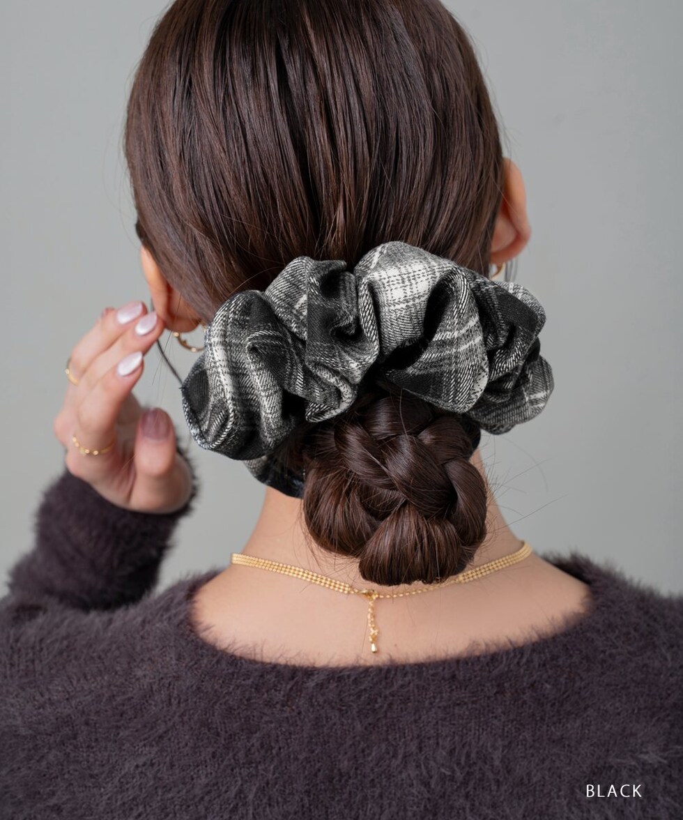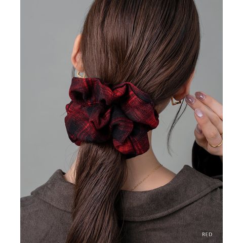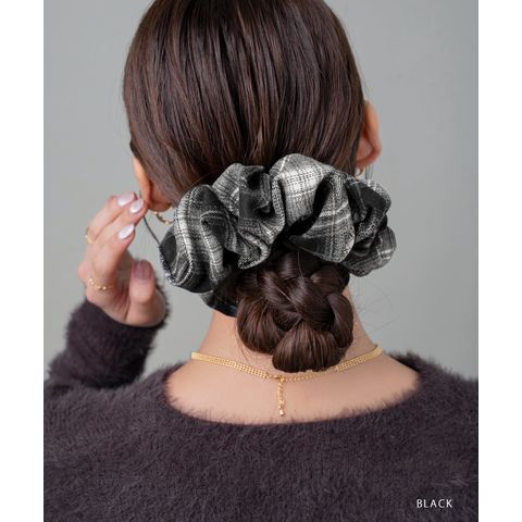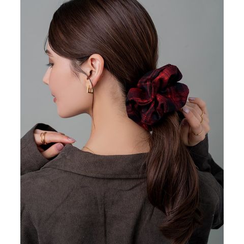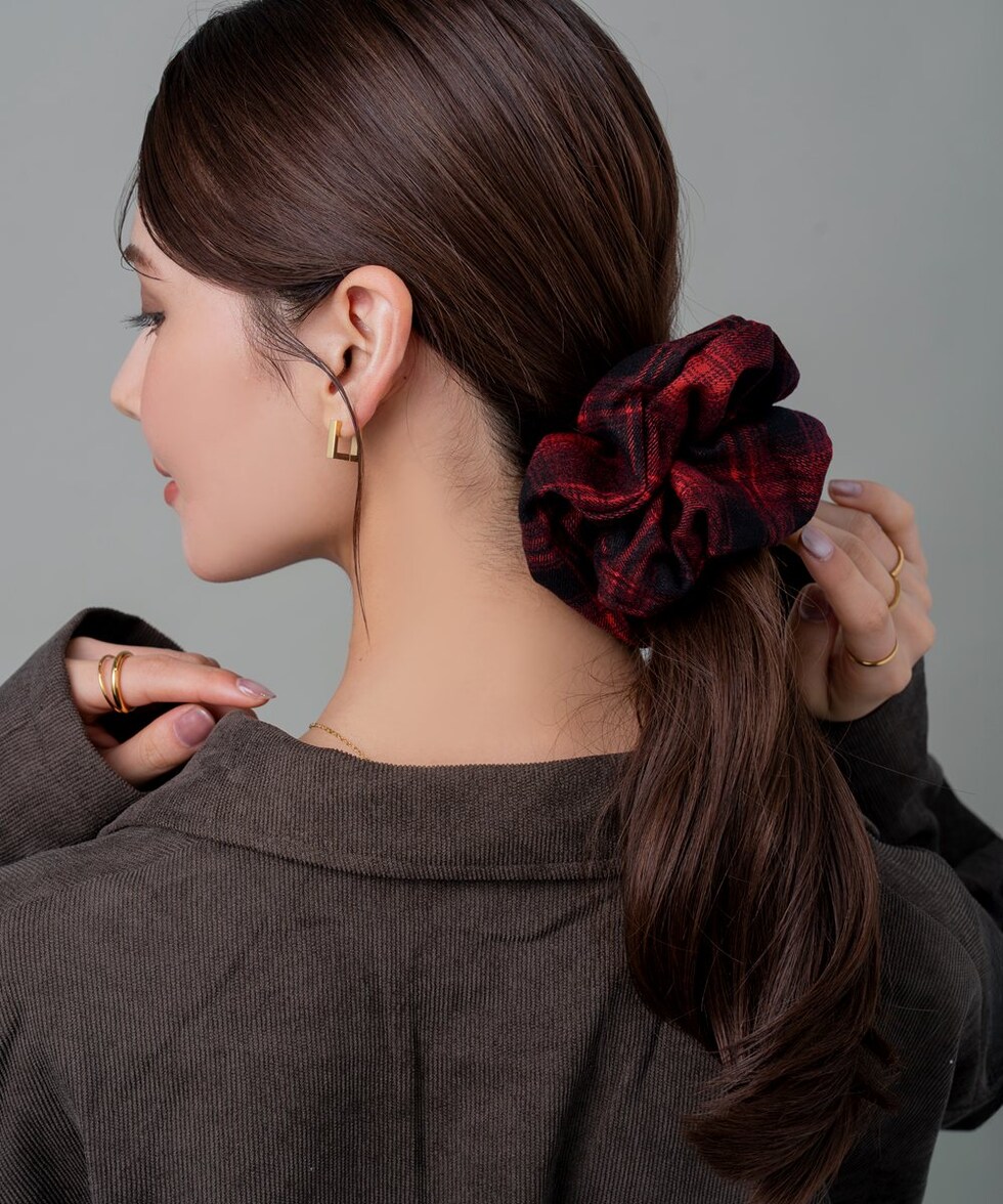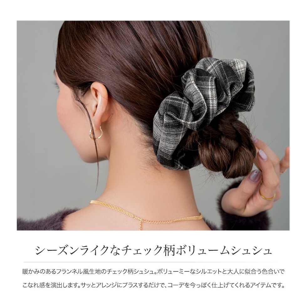 暖かみのあるフランネル風生地のチェック柄シュシュ。ボリューミーなシルエットと大人に似合う色合いでこなれ感を演出します。サッとアレンジにプラスするだけで、コーデを今っぽく仕上げてくれるアイテムです。