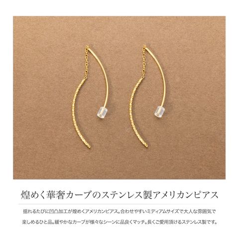 揺れるたびに凹凸加工が煌めくアメリカンピアス。合わせやすいミディアムサイズで大人な雰囲気で楽しめるひと品。緩やかなカーブが様々なシーンに品良くマッチ。長くご愛用頂けるステンレス製です。