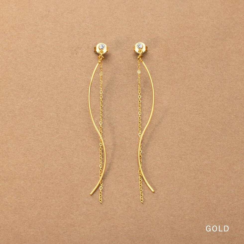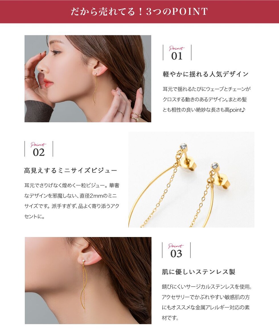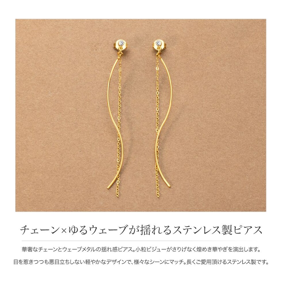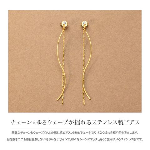 華奢なチェーンとウェーブメタルの揺れ感ピアス。小粒ビジューがさりげなく煌めき華やぎを演出します。目を惹きつつも悪目立ちしない軽やかなデザインで、様々なシーンにマッチ。長くご愛用頂けるステンレス製です。