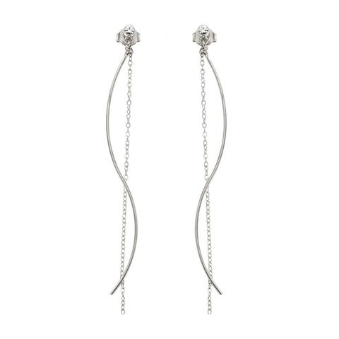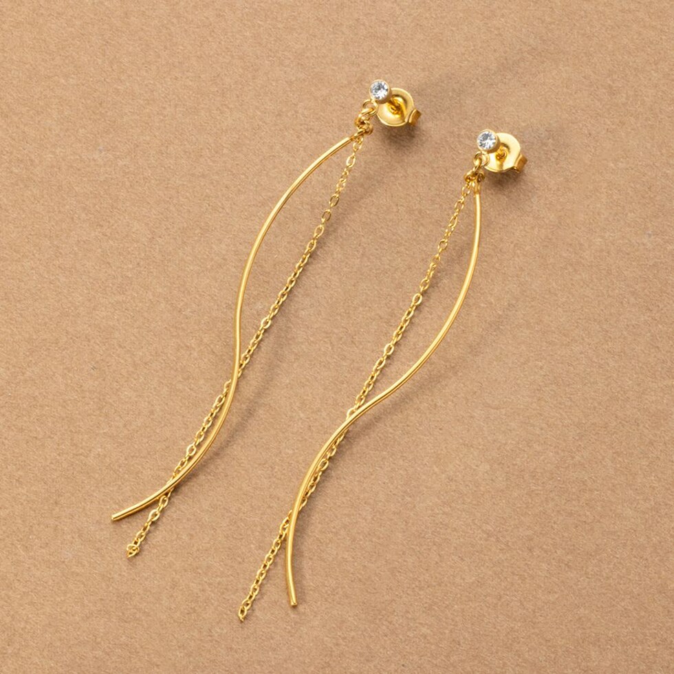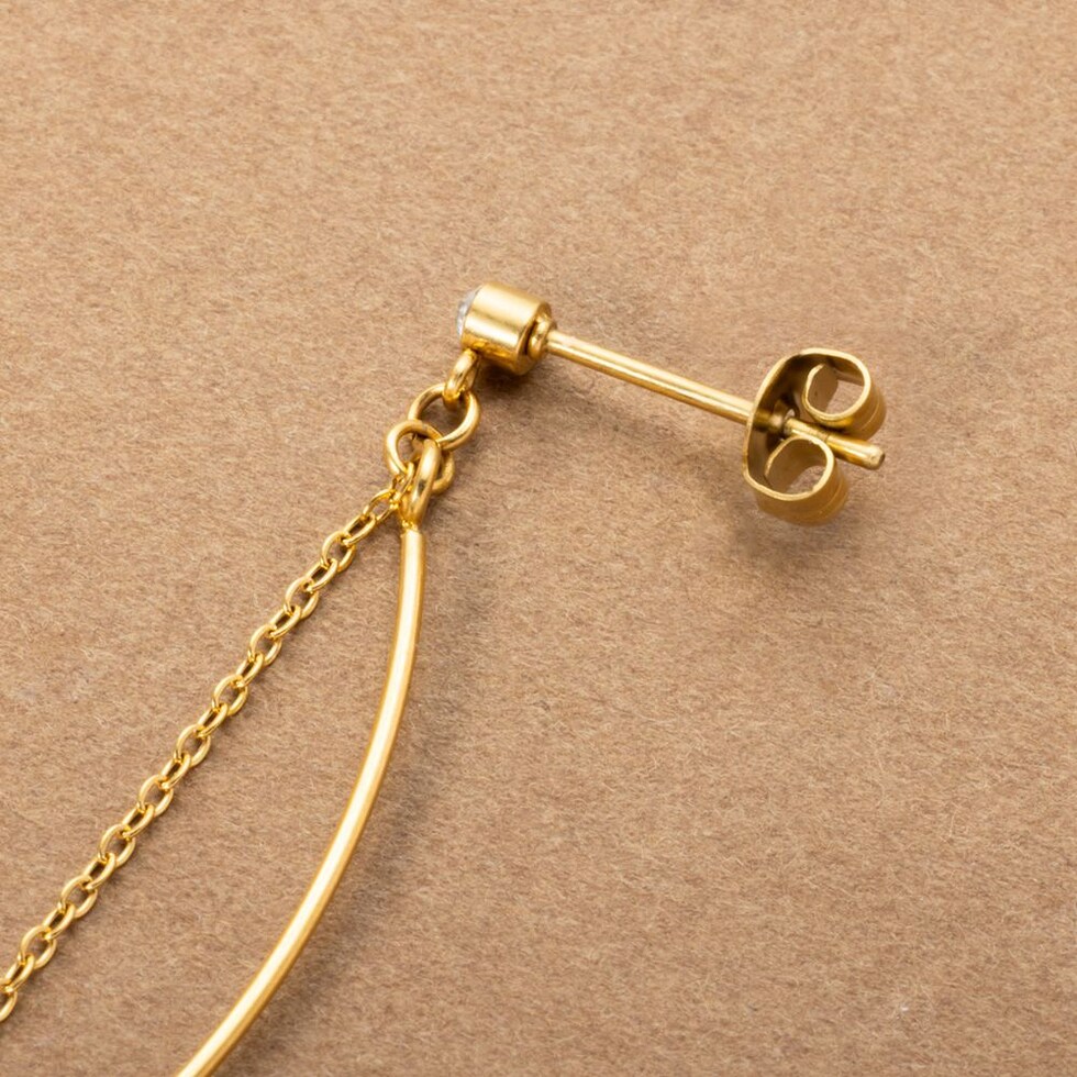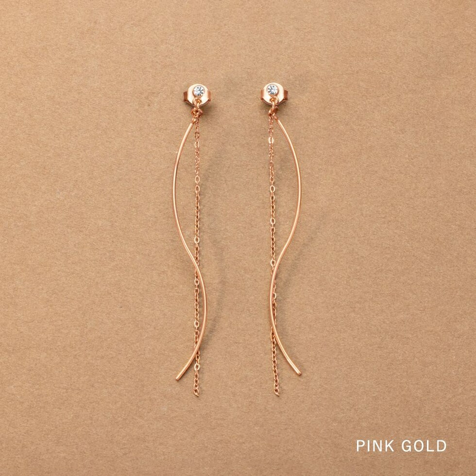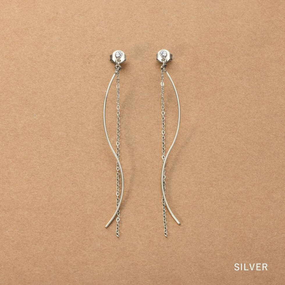 華奢なチェーンとウェーブメタルの揺れ感ピアス。小粒ビジューがさりげなく煌めき華やぎを演出します。目を惹きつつも悪目立ちしない軽やかなデザインで、様々なシーンにマッチ。長くご愛用頂けるステンレス製です。