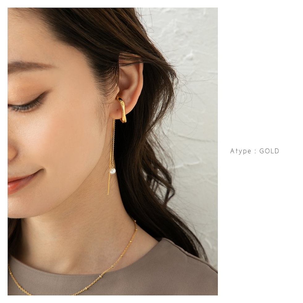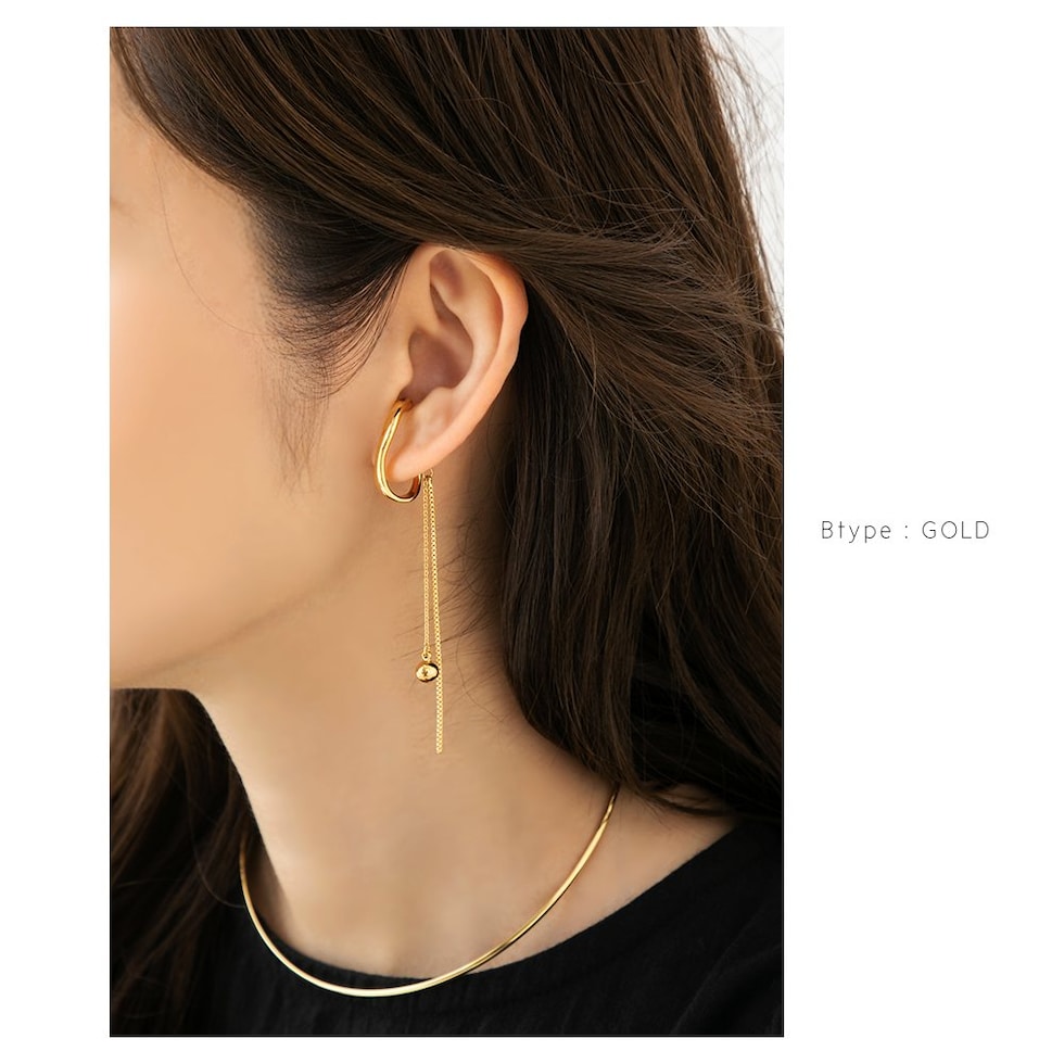 2種類チェーンと一粒パール/メタルボールを組み合わせた片耳用ロングイヤーカフ。