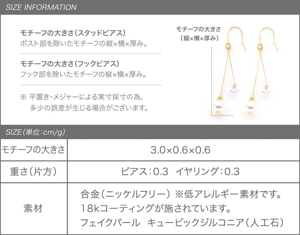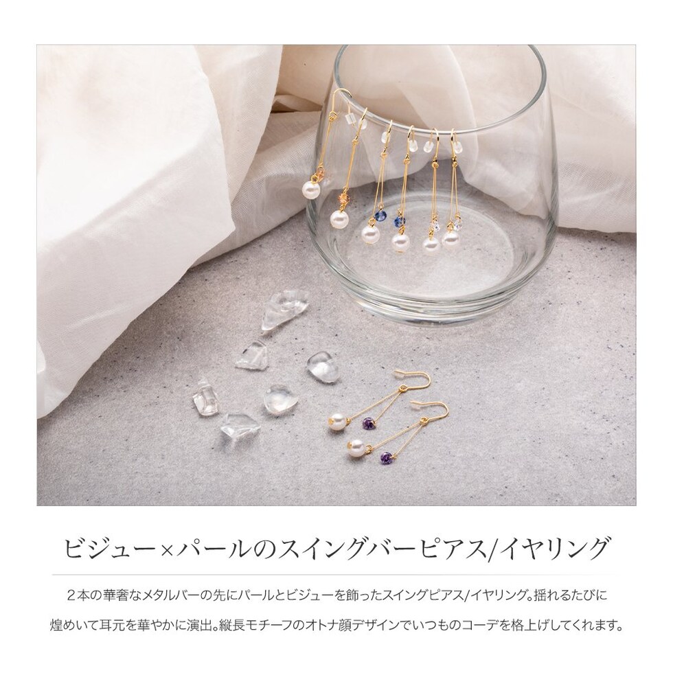 2本の華奢なメタルバーの先にパールとビジューを飾ったスイングピアス/イヤリング。