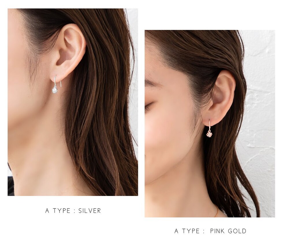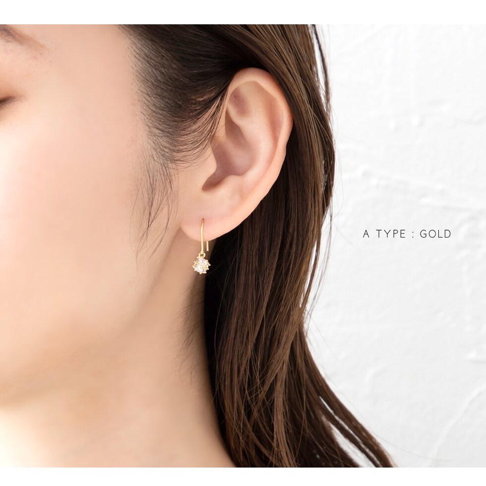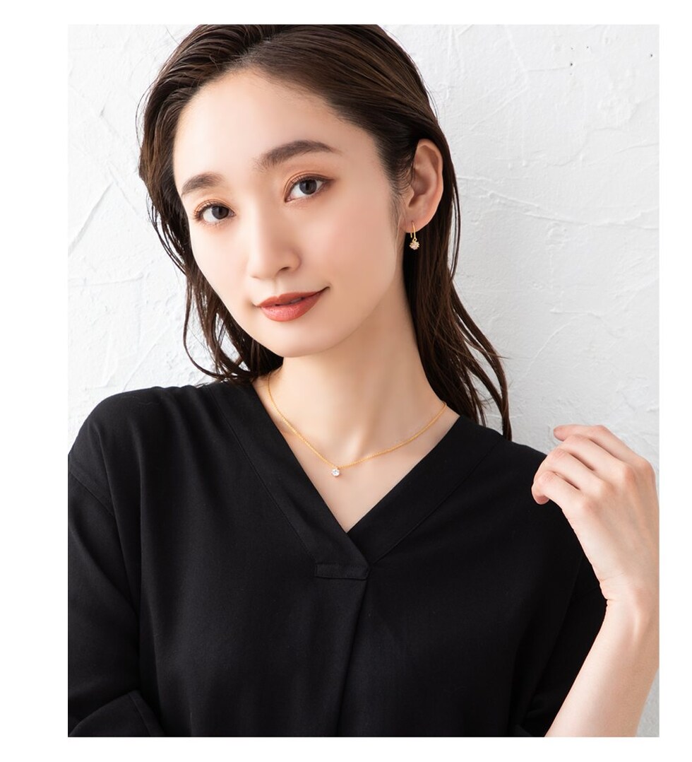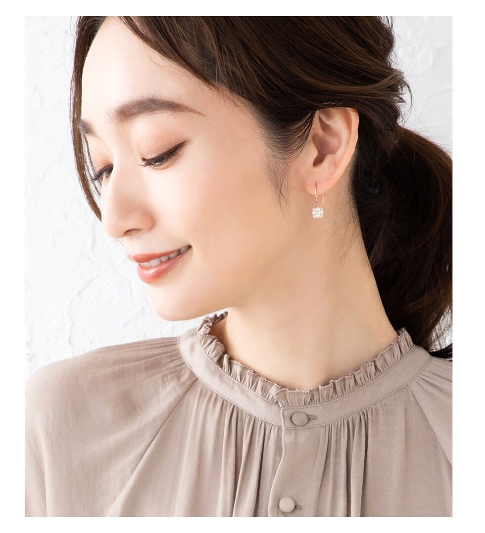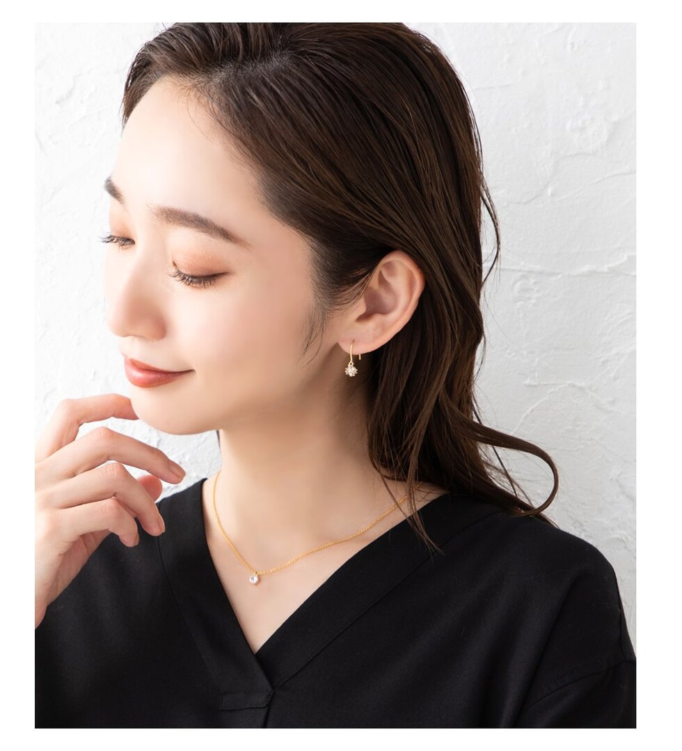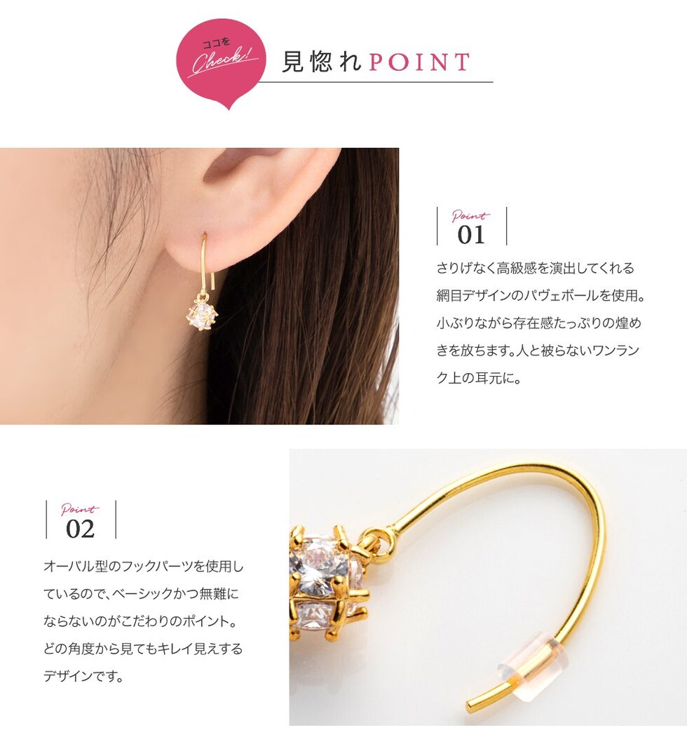 オーバル型のフックパーツを使用しているので、ベーシックかつ無難にならないのがこだわりのポイント。どの角度から見てもキレイ見えするデザインです。