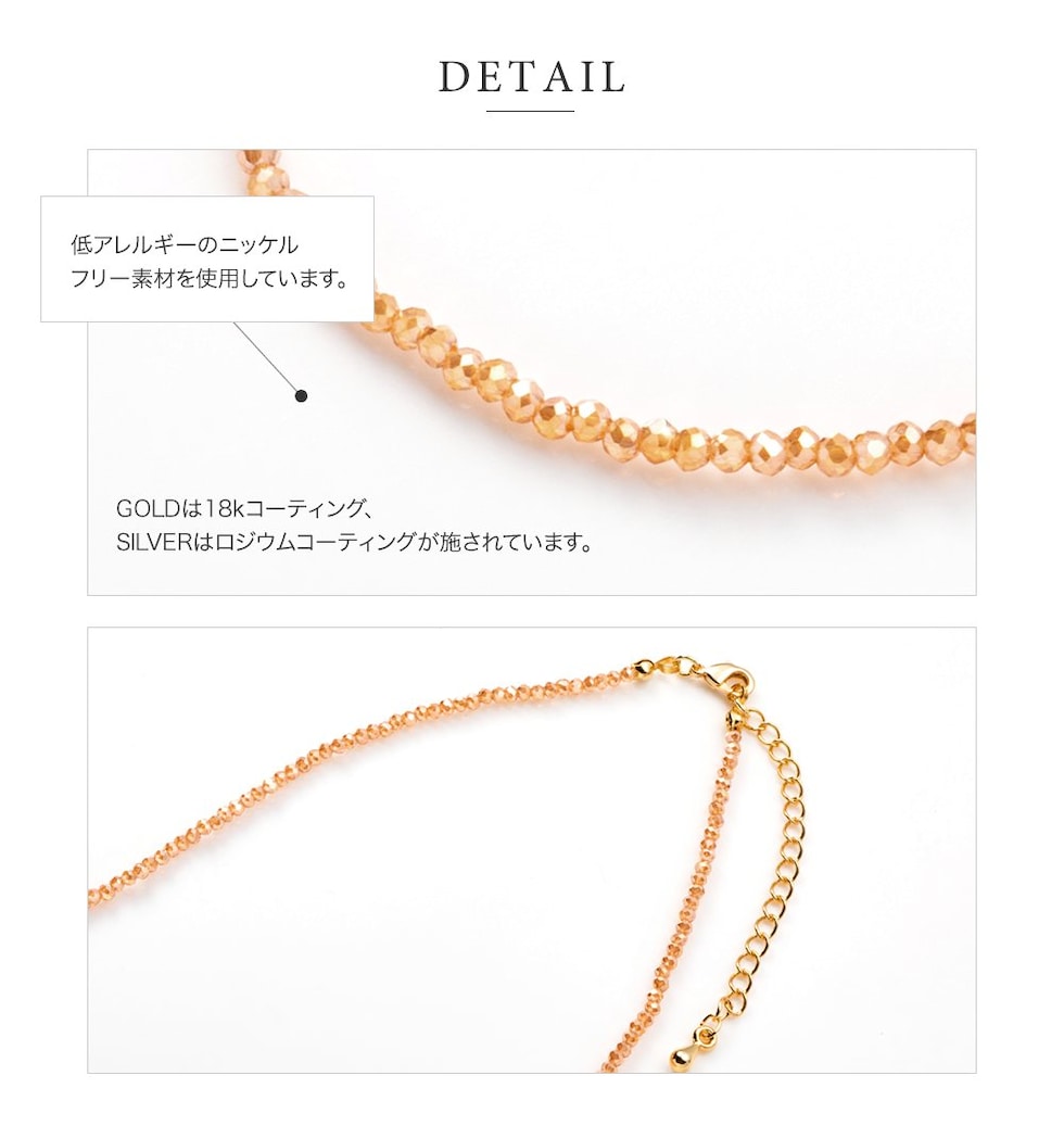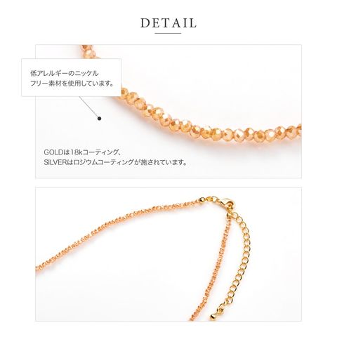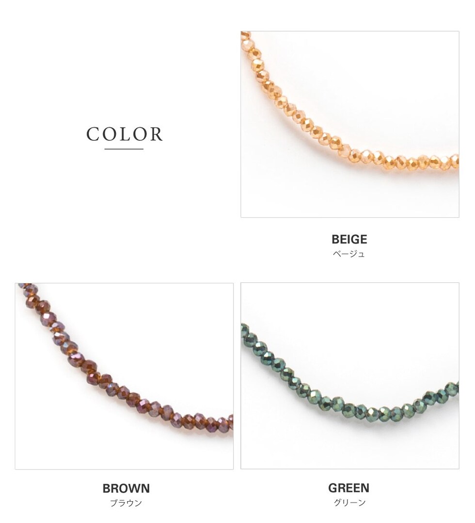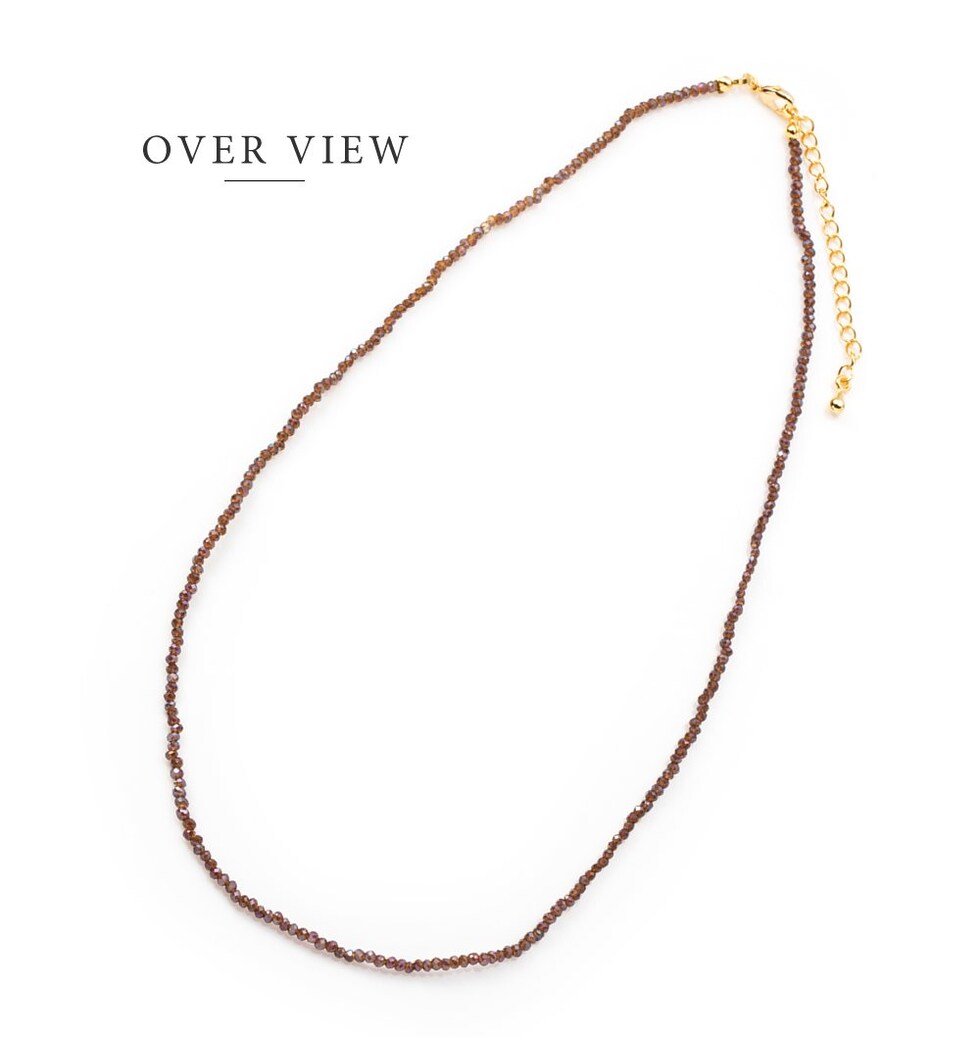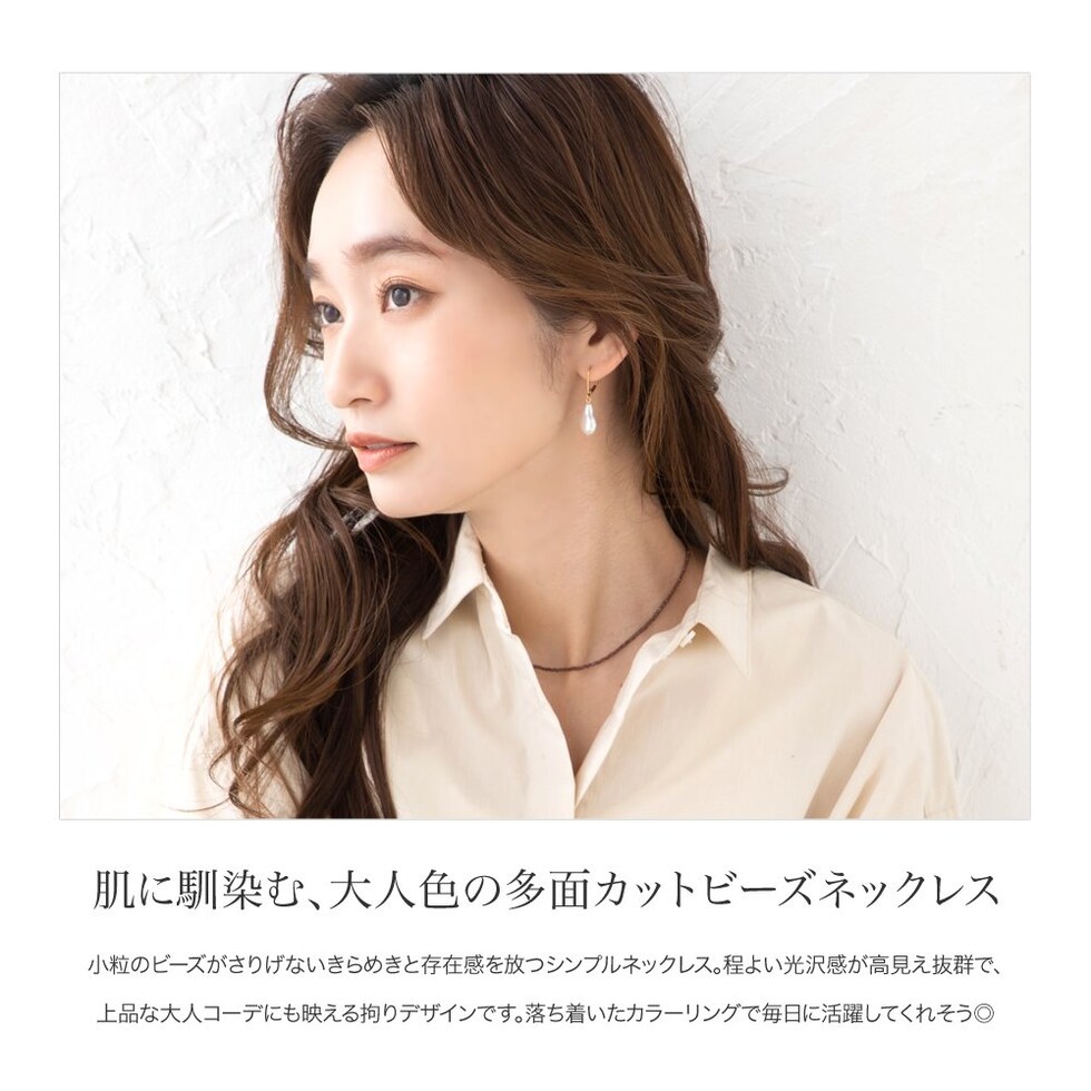 小粒のビーズがさりげないきらめきと存在感を放つシンプルネックレス。程よい光沢感が高見え抜群で、上品な大人コーデにも映える拘りデザインです。落ち着いたカラーリングで毎日に活躍してくれそう◎
