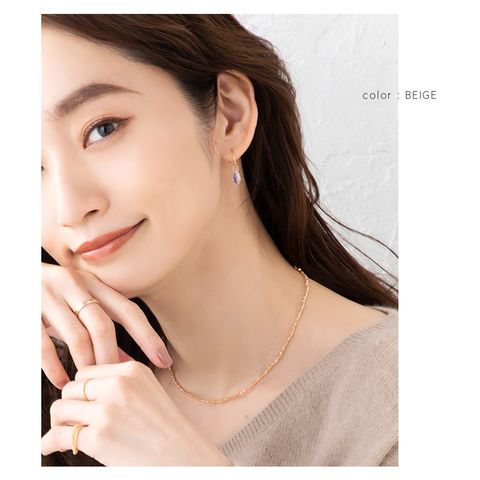 天然石風のキラリと輝く多面カット加工のビーズを使用。落ち着いたカラーリングなので子供っぽくならず、大人上品に着用できるのがこだわりのポイント。
