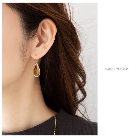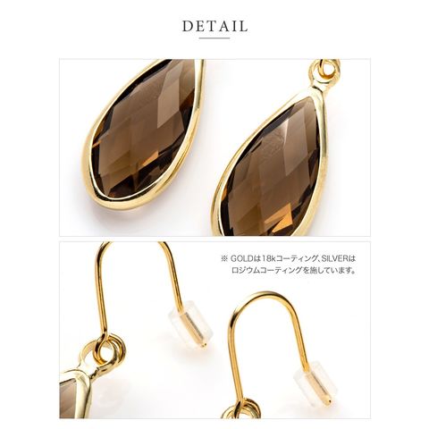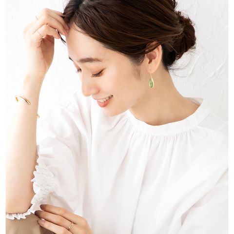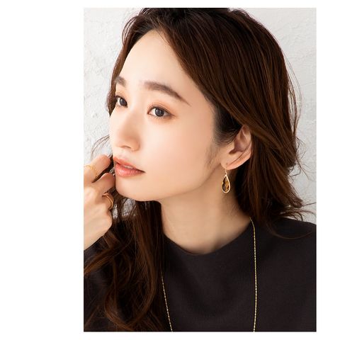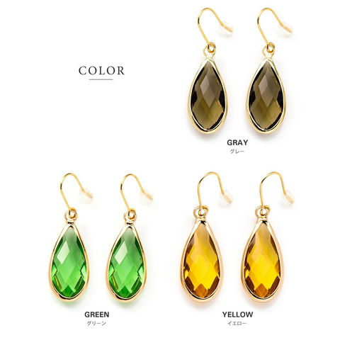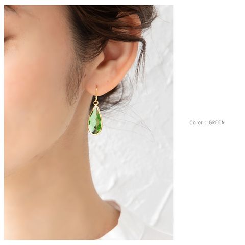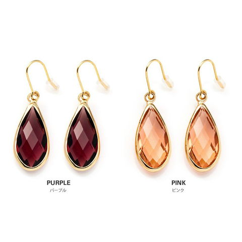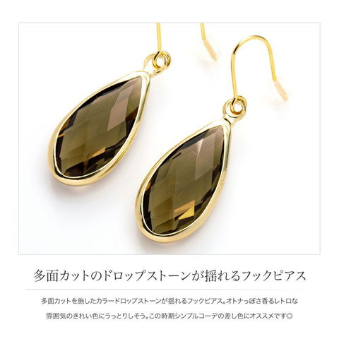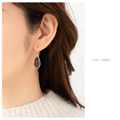 多面カットを施したカラードロップストーンが揺れるフックピアス。オトナっぽさ香るレトロな雰囲気のきれい色にうっとりしそう。この時期シンプルコーデの差し色にオススメです◎