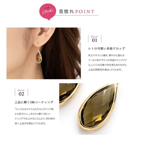耳元でキラリと輝き、華やかに揺れるゴールド枠デザインの多面ドロップピアス。レトロな印象で存在感もありながら上品な雰囲気を演出してくれます。