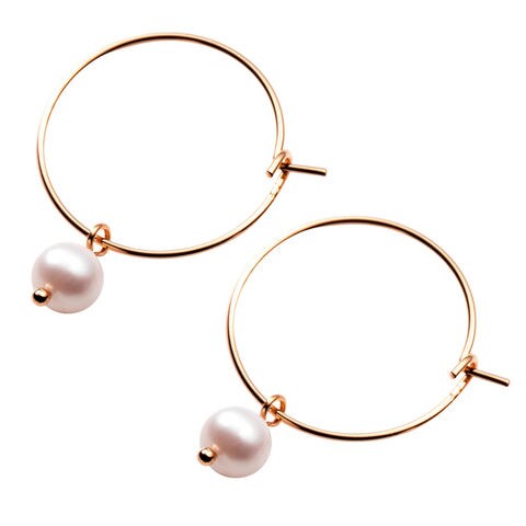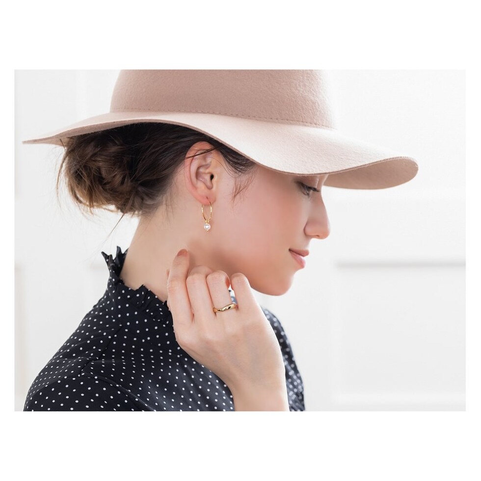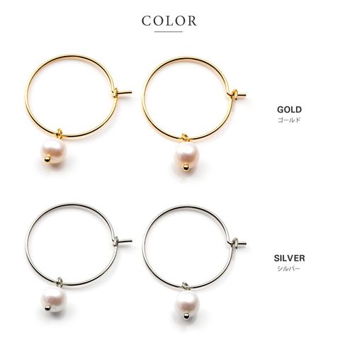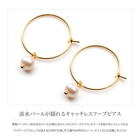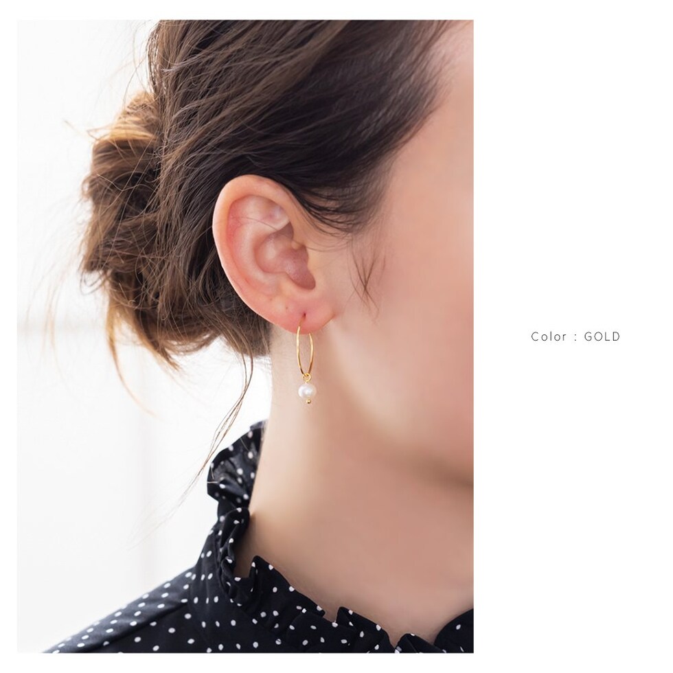 華奢フープに一粒の淡水パールが揺れるキャッチレスフープピアス。