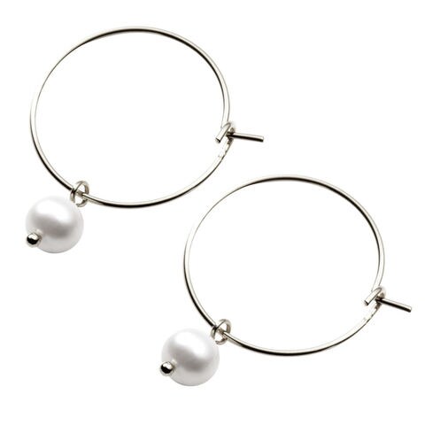 華奢フープに一粒の淡水パールが揺れるキャッチレスフープピアス。