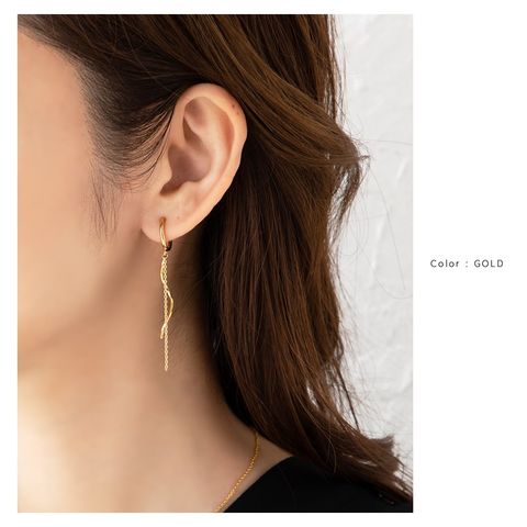 ウェーブバー×華奢チェーンが揺れるスプリング式のフープイヤリング。