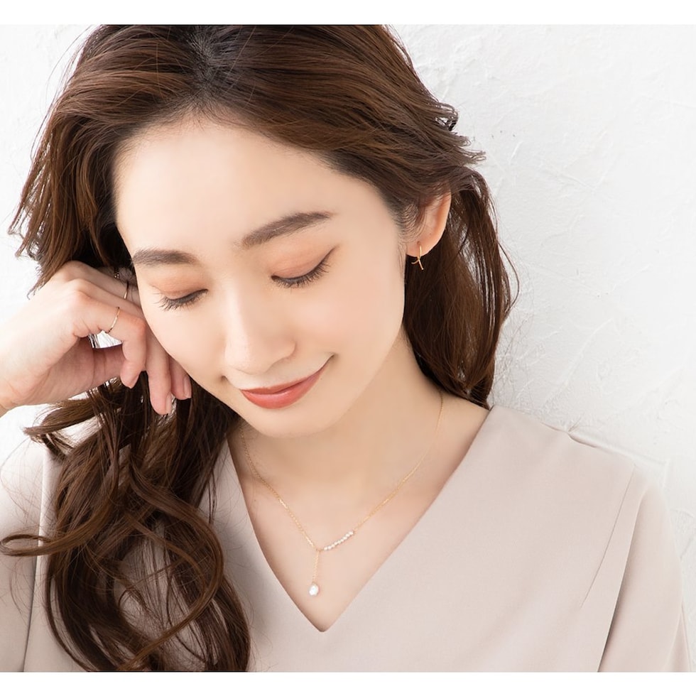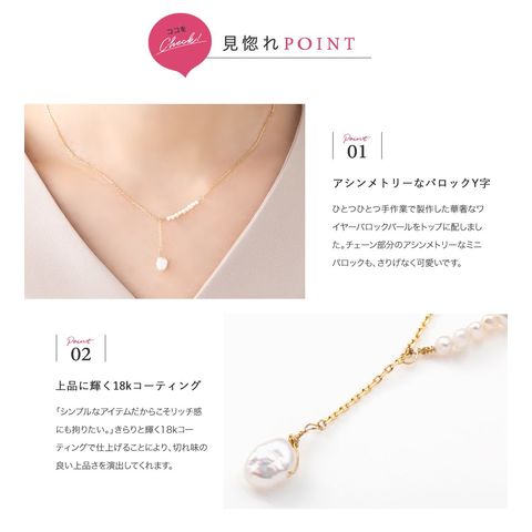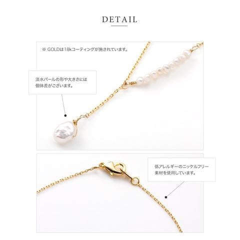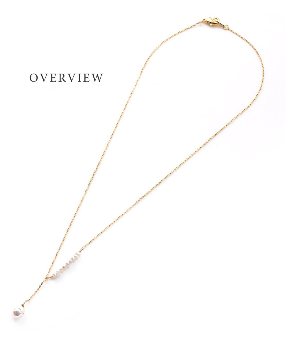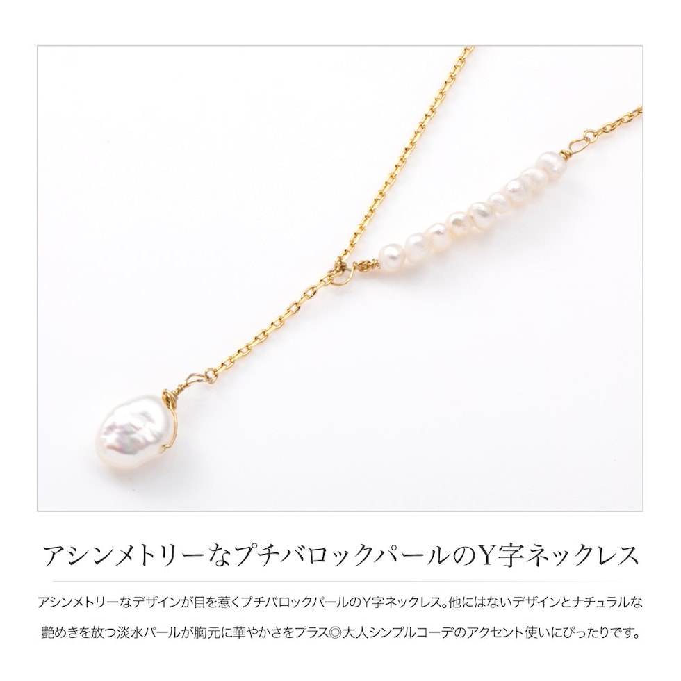 アシンメトリーなデザインが目を惹くプチバロックパールのY字ネックレス。他にはないデザインとナチュラルな艶めきを放つ淡水パールが胸元に華やかさをプラス◎大人シンプルコーデのアクセント使いにぴったりです。
