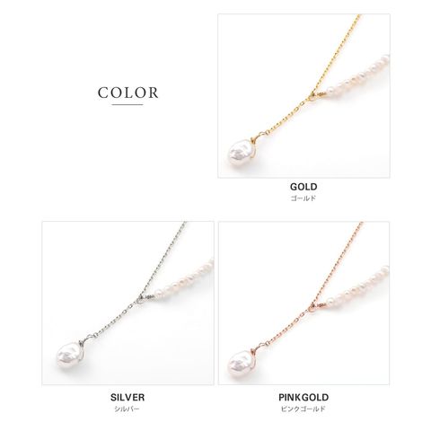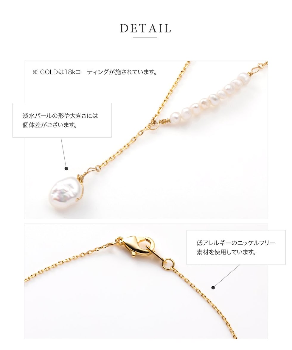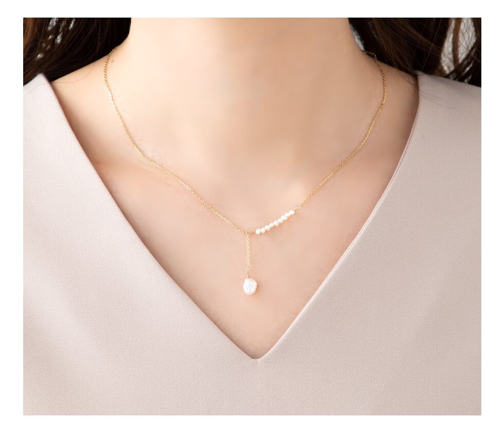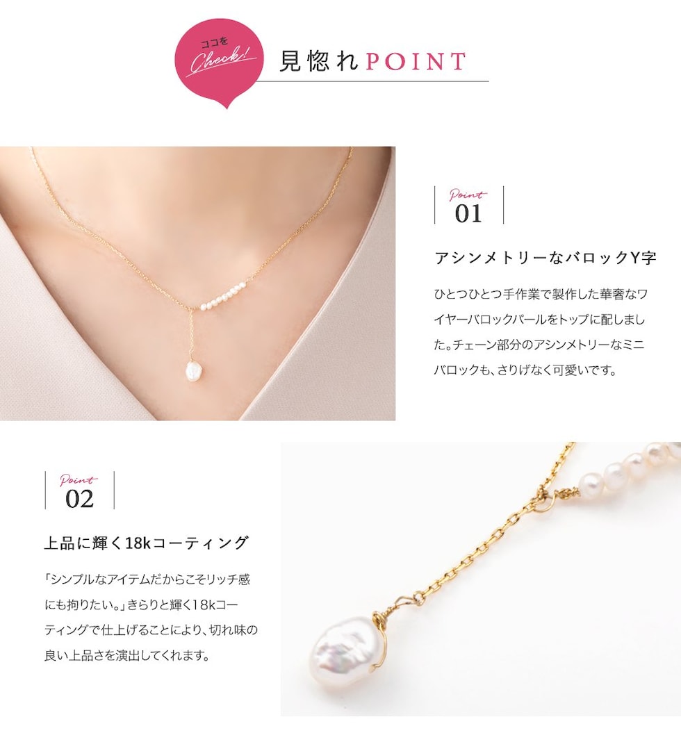 アシンメトリーなデザインが目を惹くプチバロックパールのY字ネックレス。他にはないデザインとナチュラルな艶めきを放つ淡水パールが胸元に華やかさをプラス◎大人シンプルコーデのアクセント使いにぴったりです。