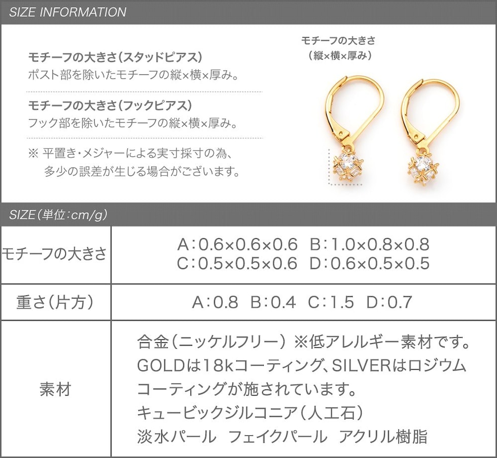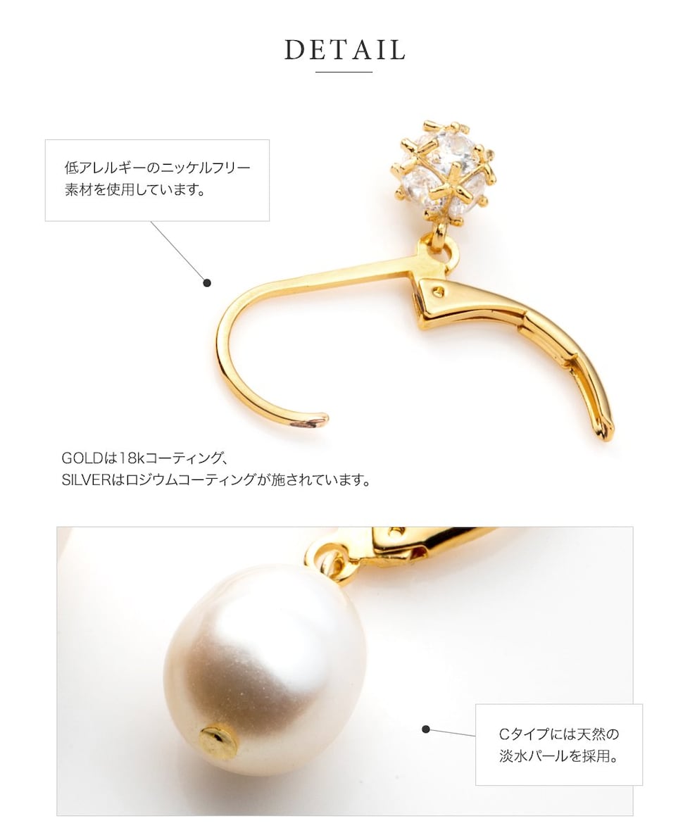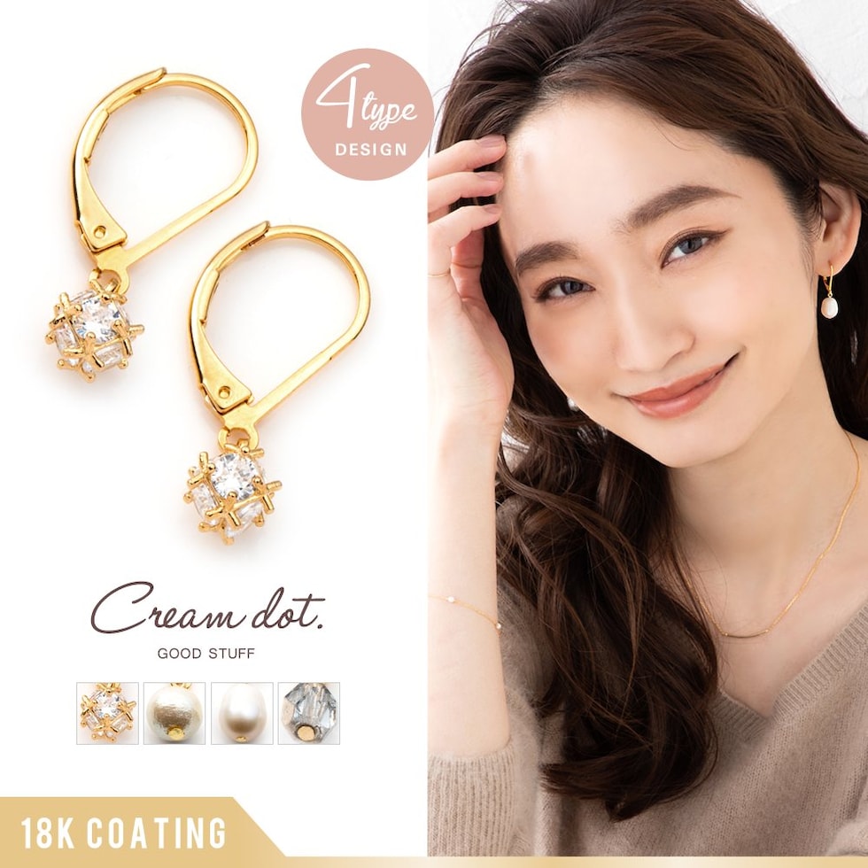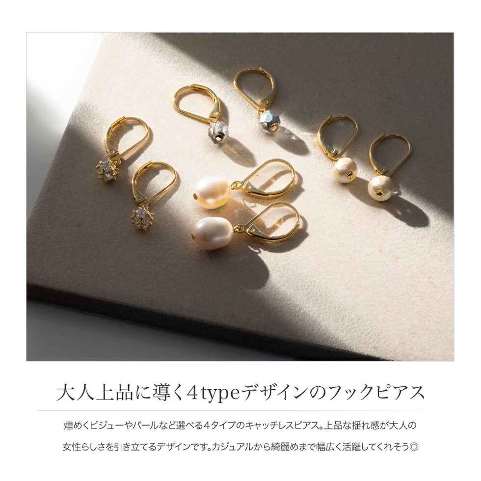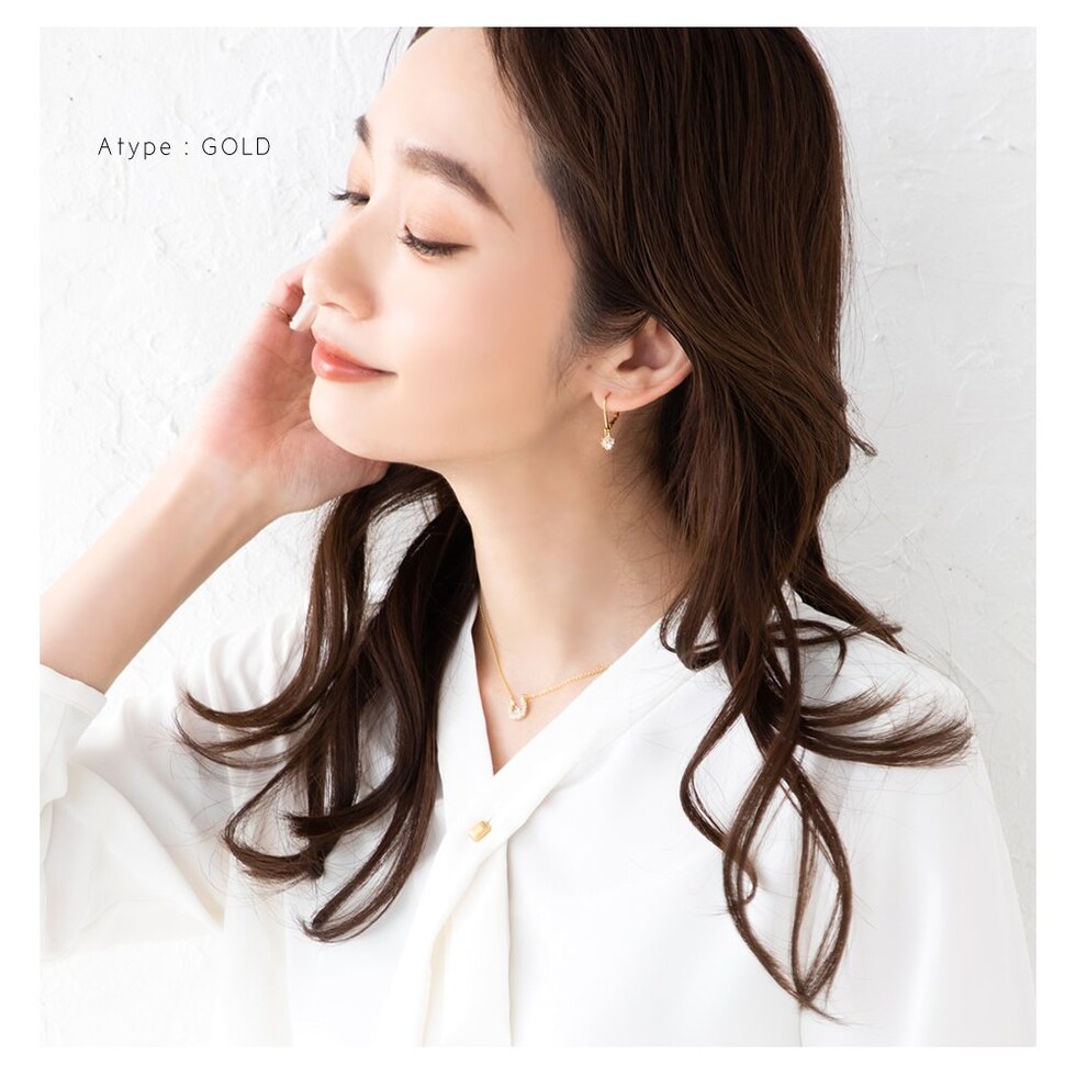 煌めくビジューやパールなど選べる4タイプのキャッチレスピアス。上品な揺れ感が大人の女性らしさを引き立てるデザインです。カジュアルから綺麗めまで幅広く活躍してくれそう◎