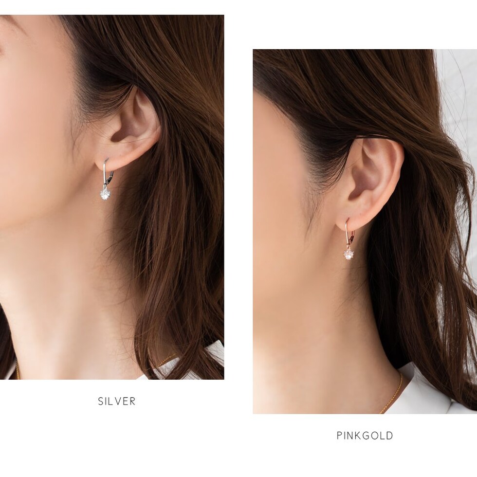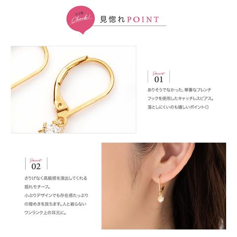 ありそうでなかった、華奢なフレンチフックを使用したキャッチレスピアス。落としにくいのも嬉しいポイント◎
